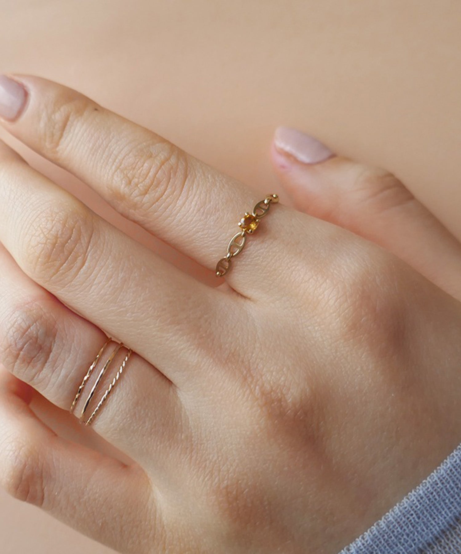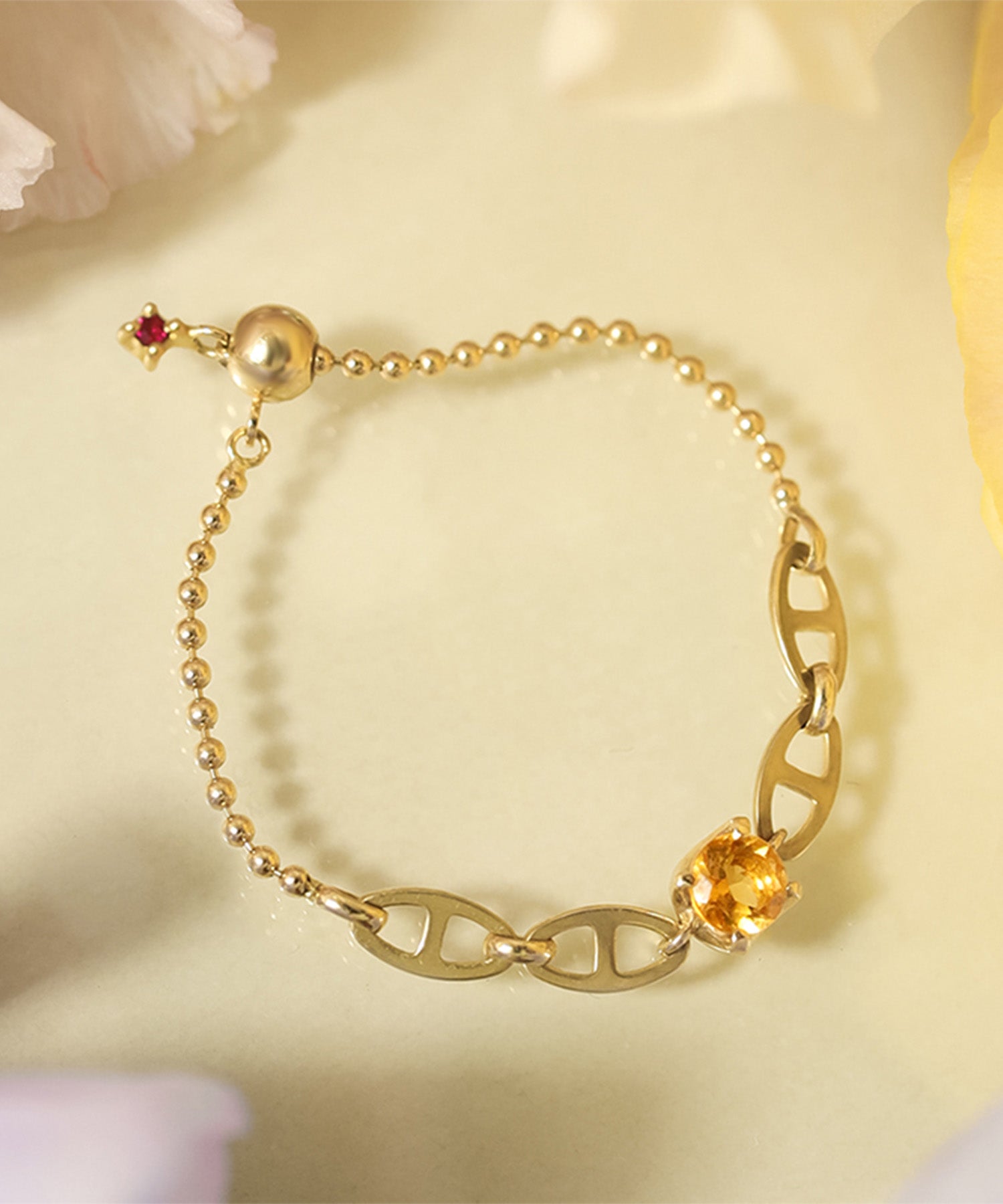 花びらのように光を受けて煌めく繊細なデザインプレートのペタルチェーンを使ったリング。シトリンから続くデザインチェーンが揺らめきフェミニンな印象に。