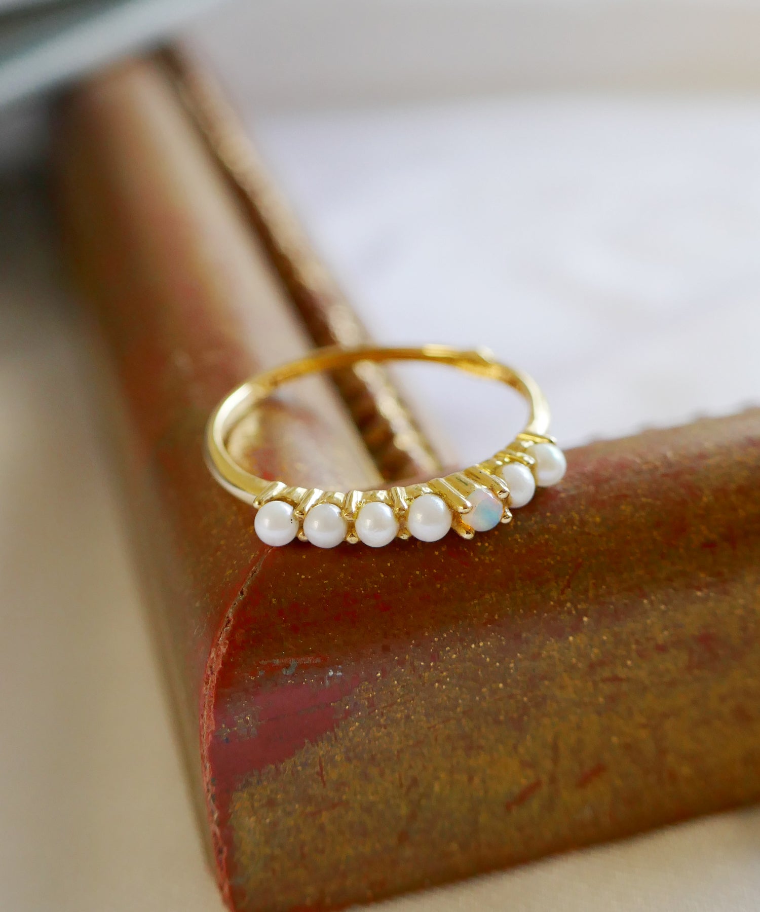 真っ白なパールの中に1石の輝くオパール。シンプルなデザインにルビーの赤でアクセントを利かせたデザイン。