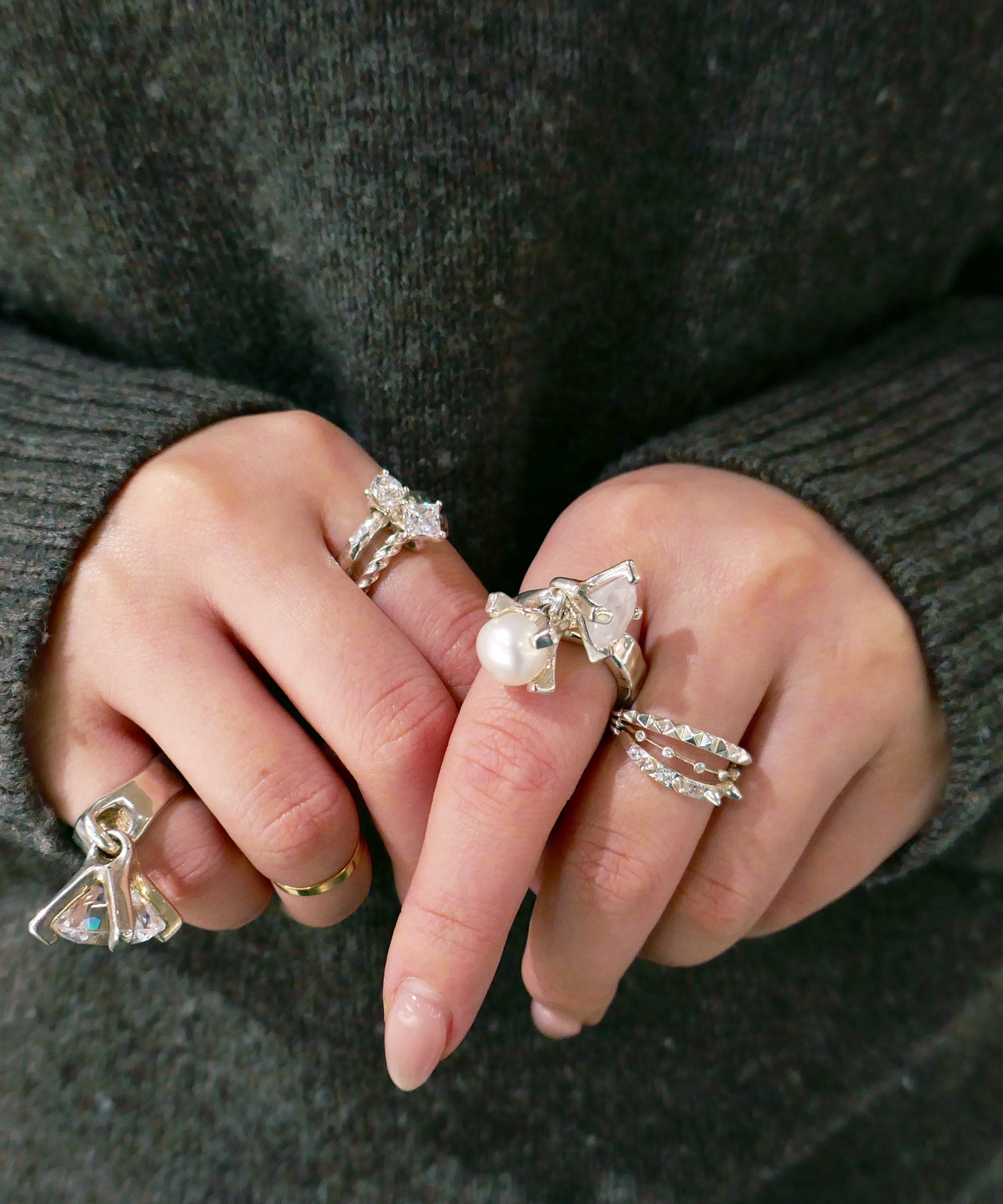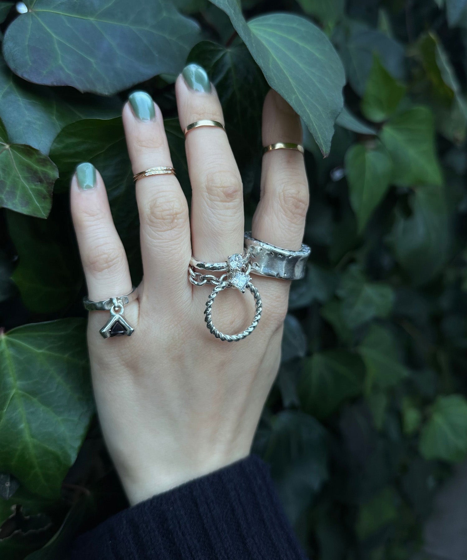 抜け感のあるレイヤードリングは、手元に奥行きのあるニュアンスを添えます。