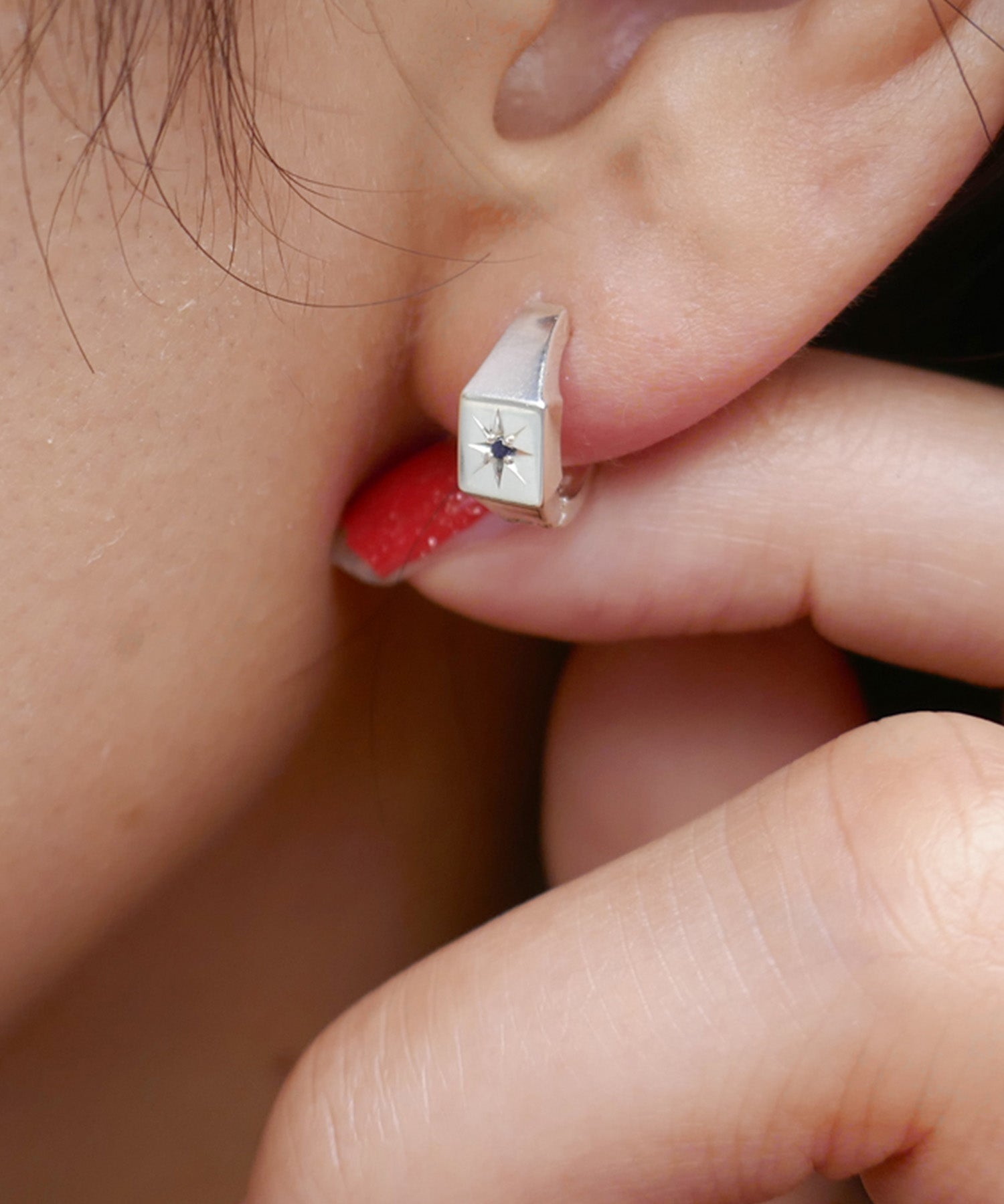 深いブルーのサファイアが後光留めでとまった印台のピアス。