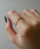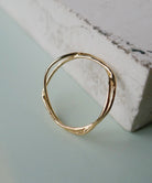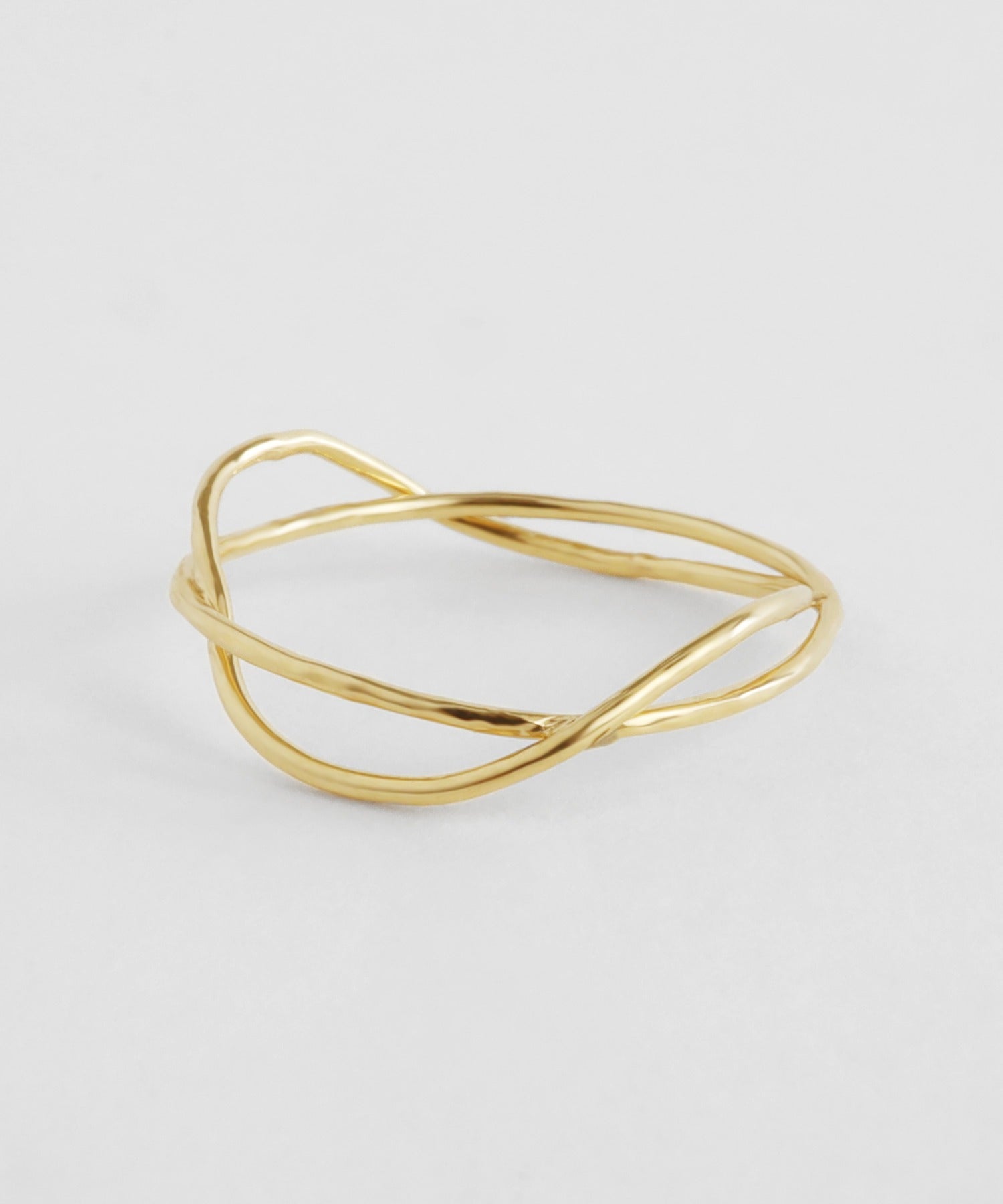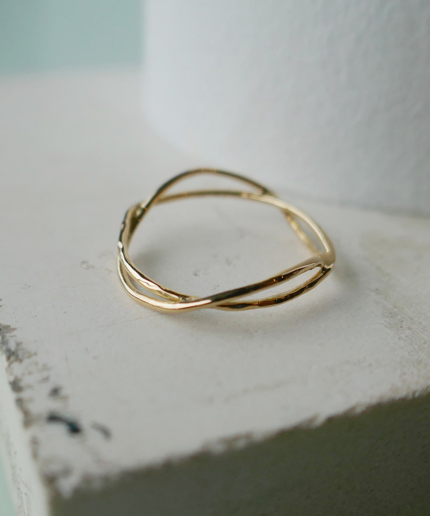 「cityscape」聳え立つ高層ビル群水面に揺らめく光の粒有機と無機が融合された美しい都市景観2本のランダムウェーブが重なるシンプルゴールドリングです。緩やかなたたき加工を施し落ち着いた輝きを楽しめます。今にも動き出しそうなラインも特徴です。2本の隙間の抜け感が軽やかな印象に仕上げてくれます。リングを回して着けることで指の正面から見える印象が変えることができるので様々なスタイルとマッチします。
