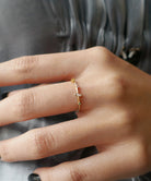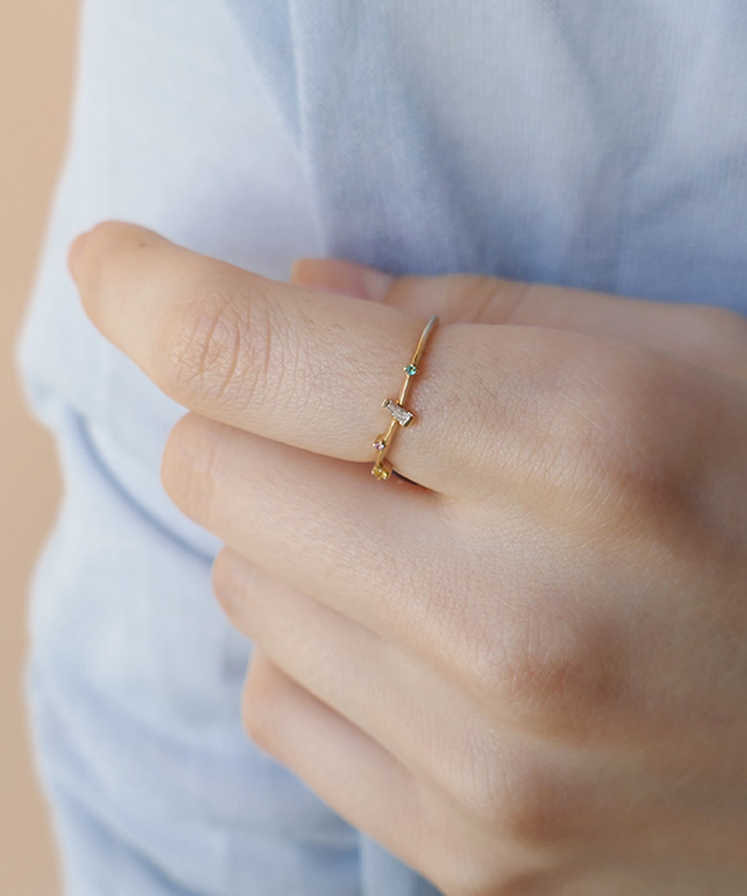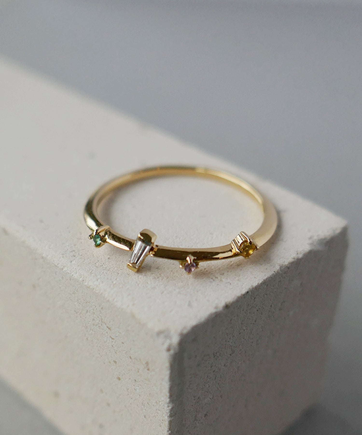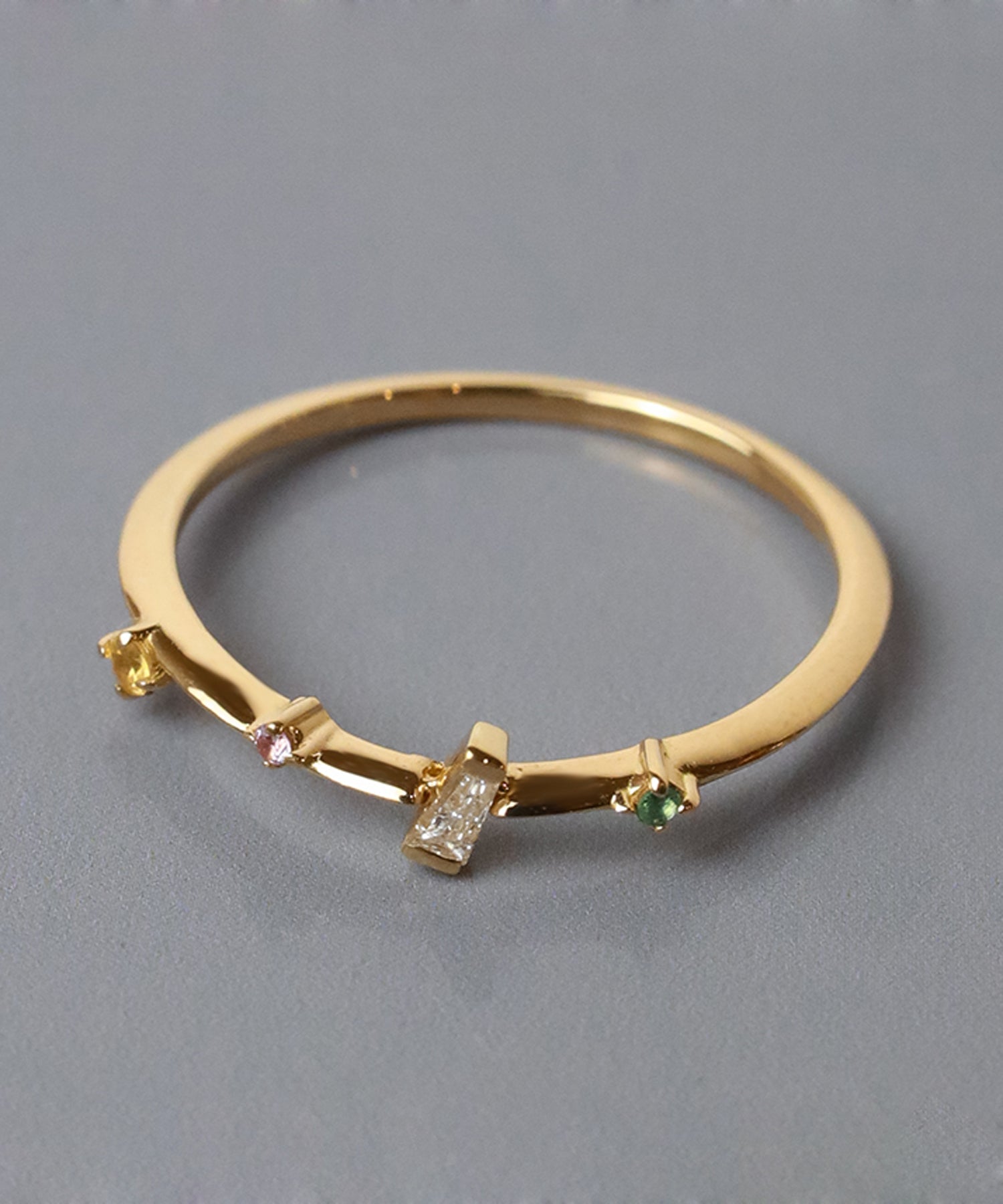 落ち着いたカラーの天然石を並べたゴールドリング。ダイヤモンド、ピンクサファイアイエローサファイア、エメラルドを使用し街に輝く夜景を表現しています。平たい形状のアームを使用しモチーフがしっかりと目立つよう計算されています。バケッドカットダイヤモンドで甘くなり過ぎずすっきりとした印象に。