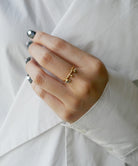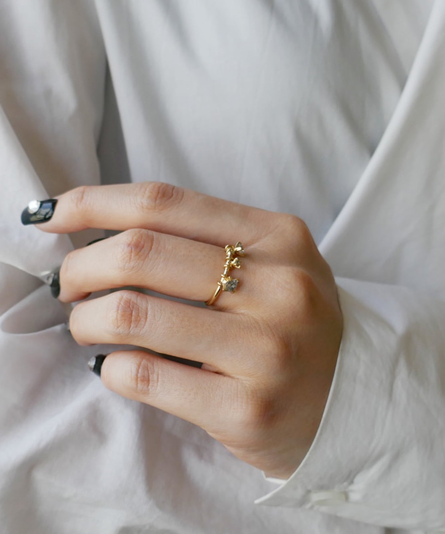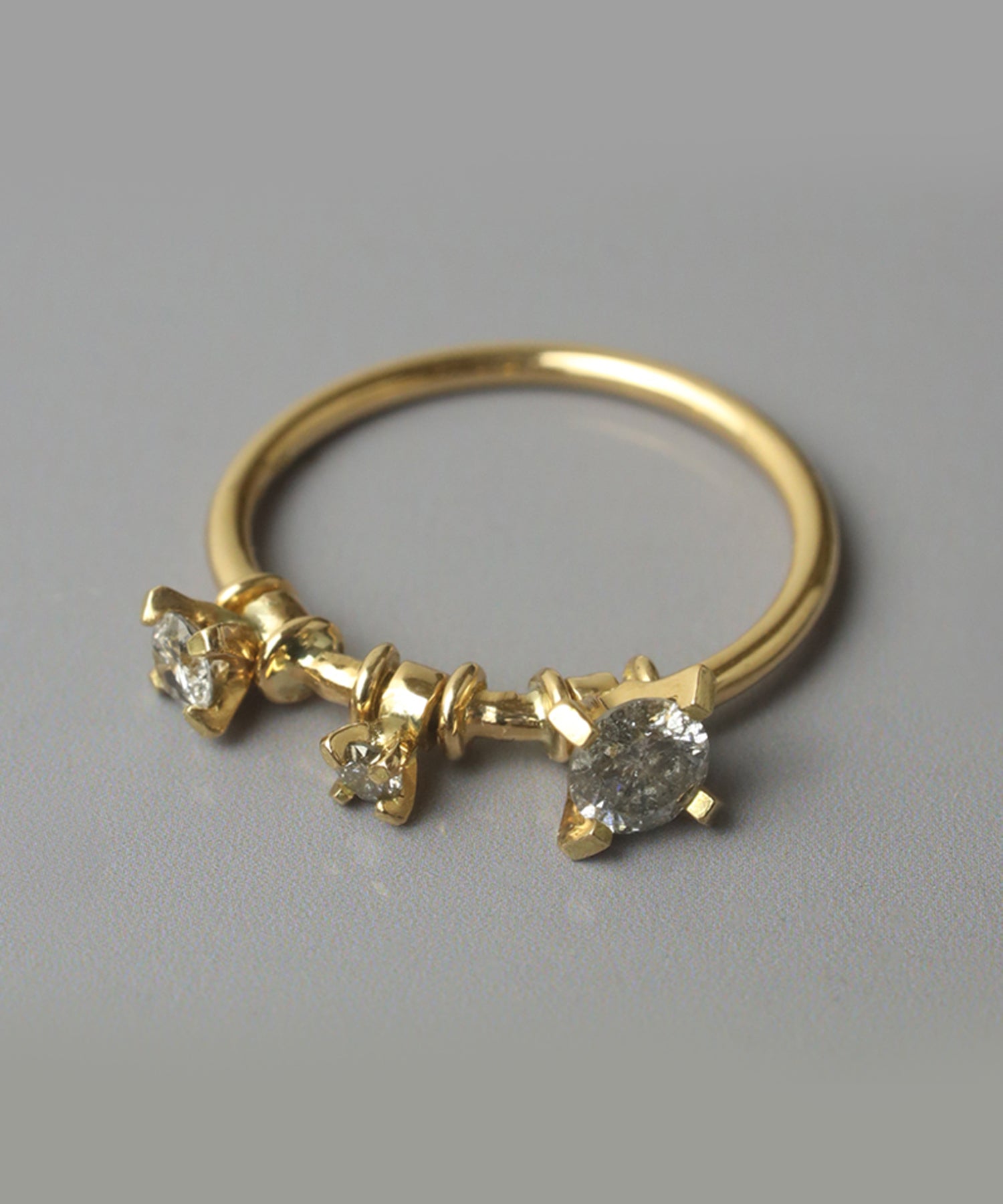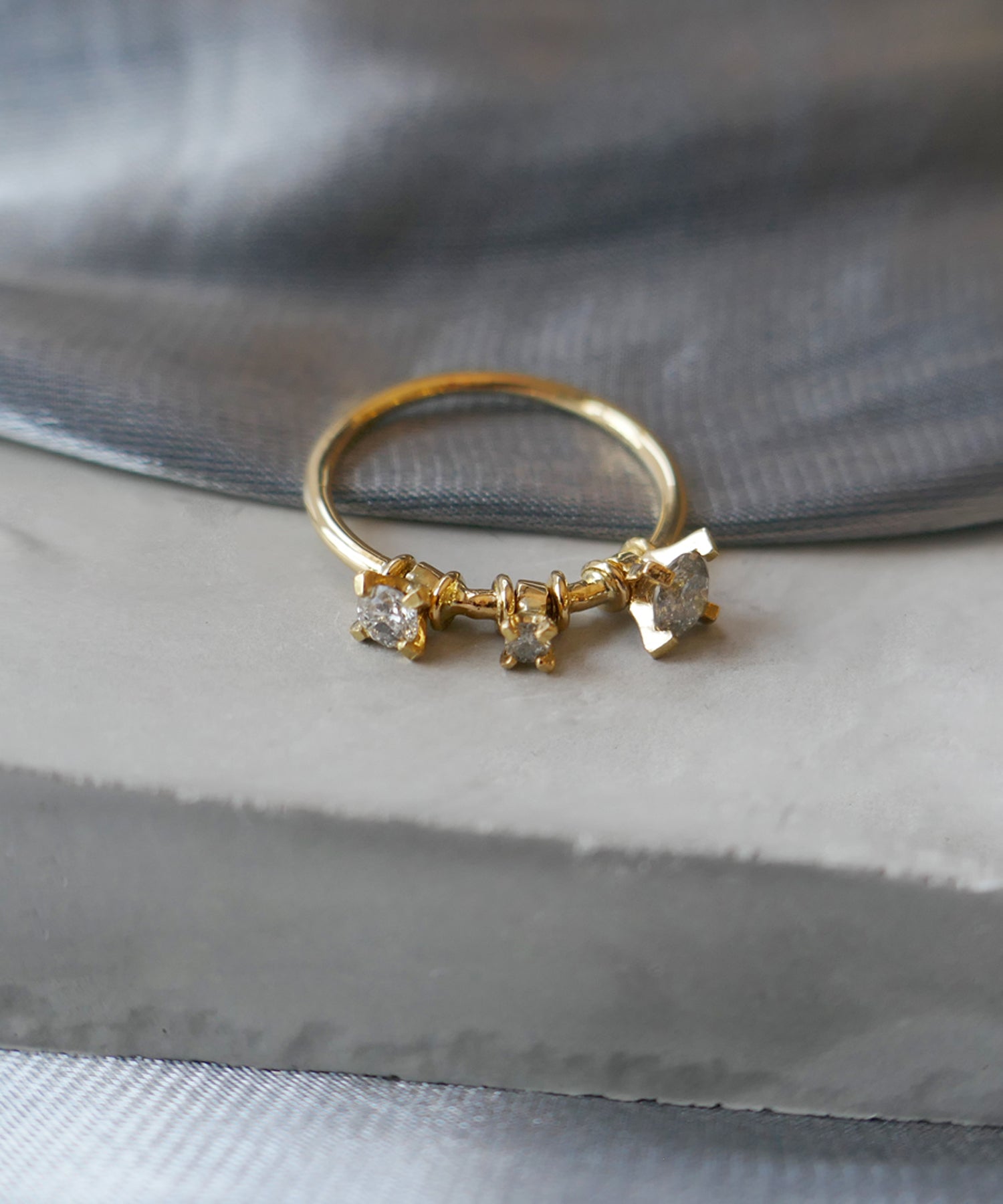 三粒のグレーダイヤモンドが手元で上品に揺れるリング。透明感を残しながらも洗練された手元を演出するカラーダイヤモンドならではの風合いをお楽しみいただけます。