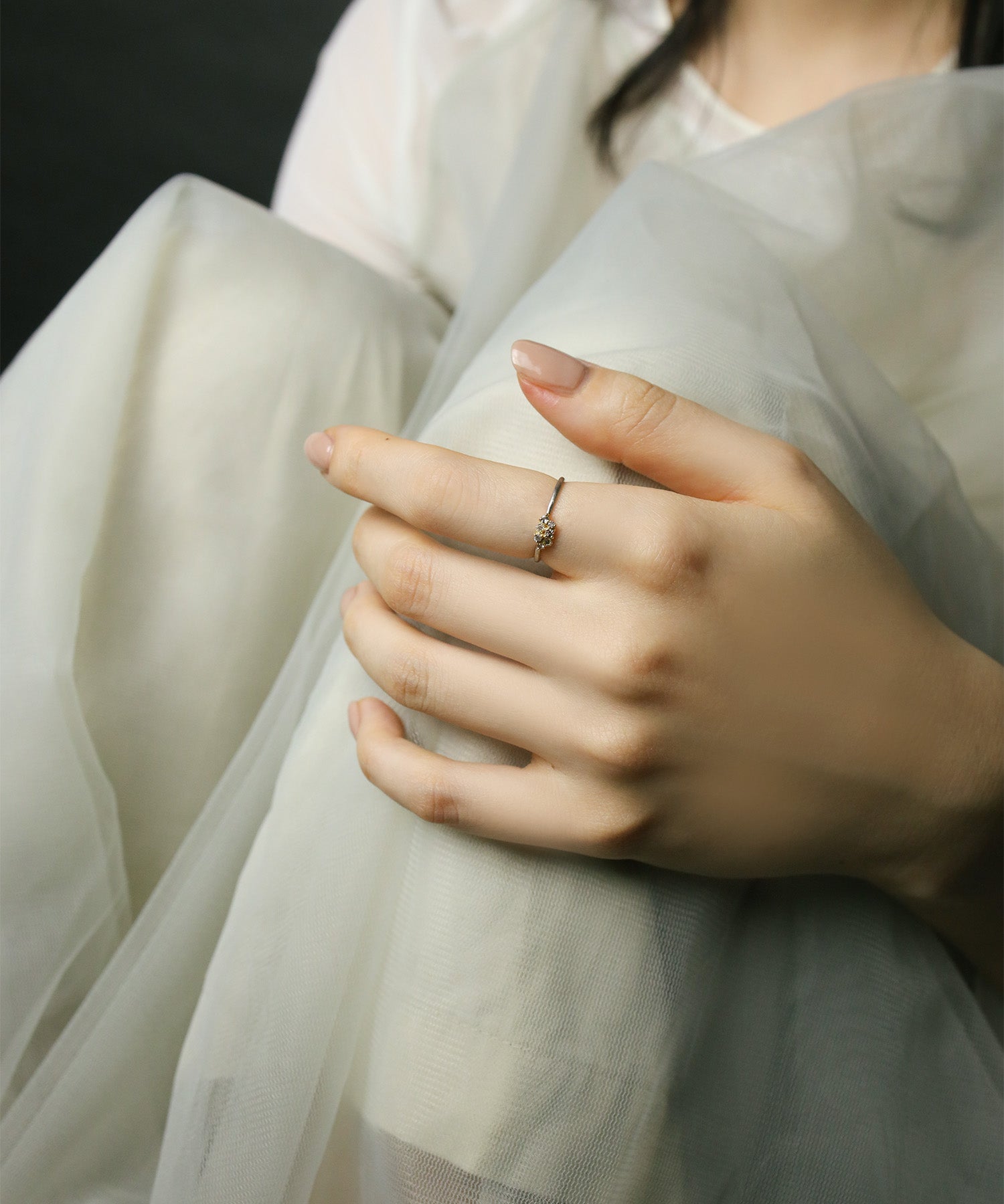 プラチナとK18のコンビネーションリング。天然石ならではのグレーダイヤモンドの風合いがコントラストを生み出し、奥行きを感じさせるデザインです。