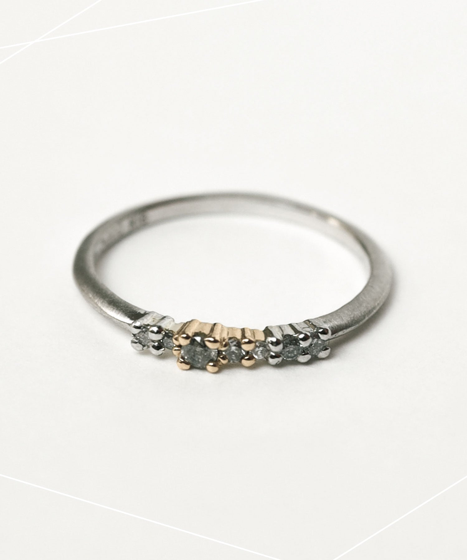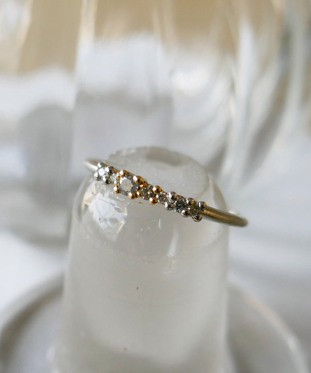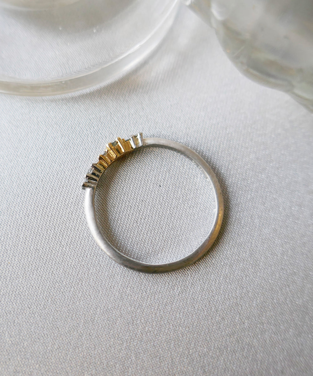 プラチナとK18のコンビネーションリング。正面には大きさの異なるグレーダイヤモンドがセッティングされ色味のコントラストは奥行きを感じさせるデザインです。