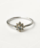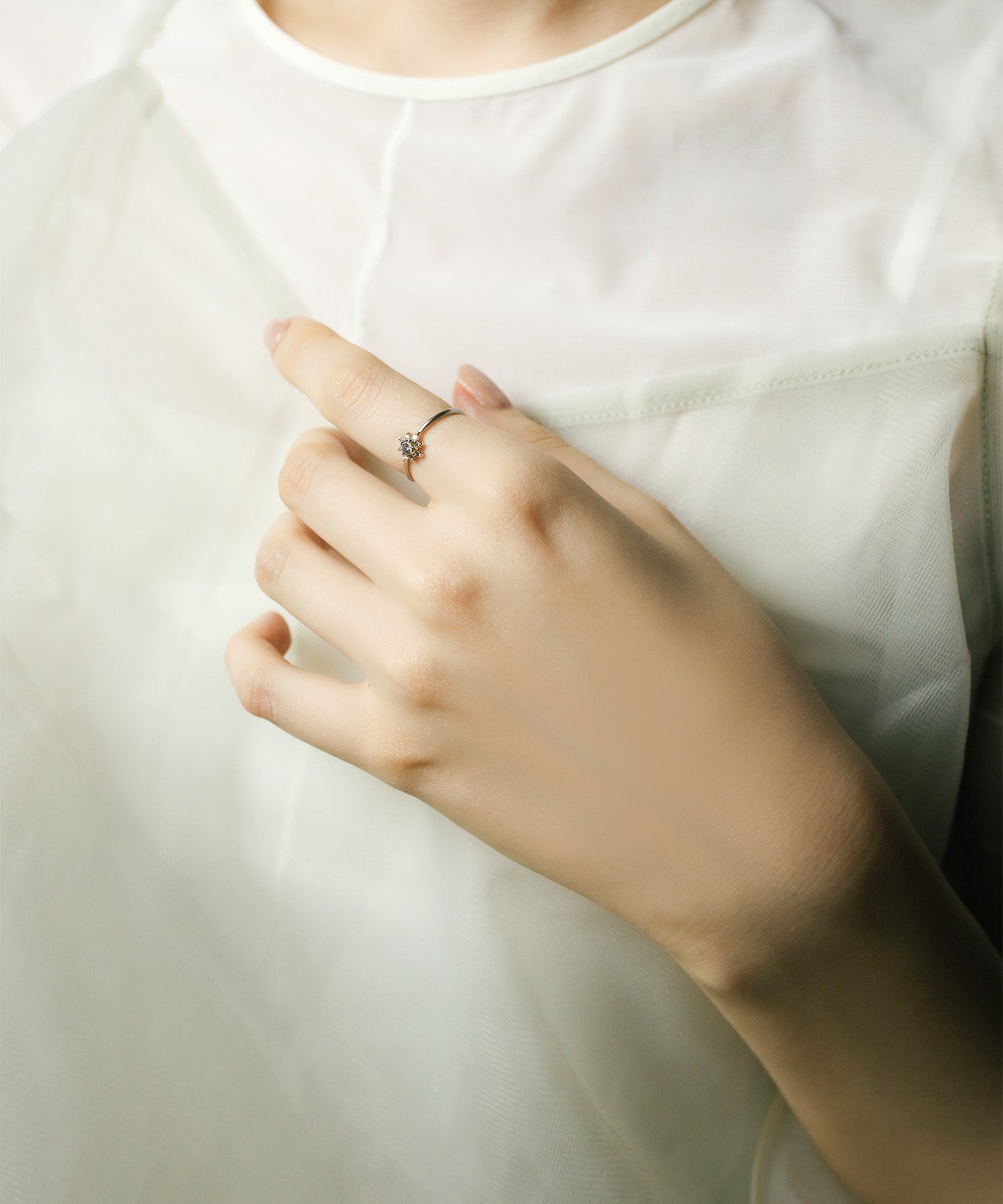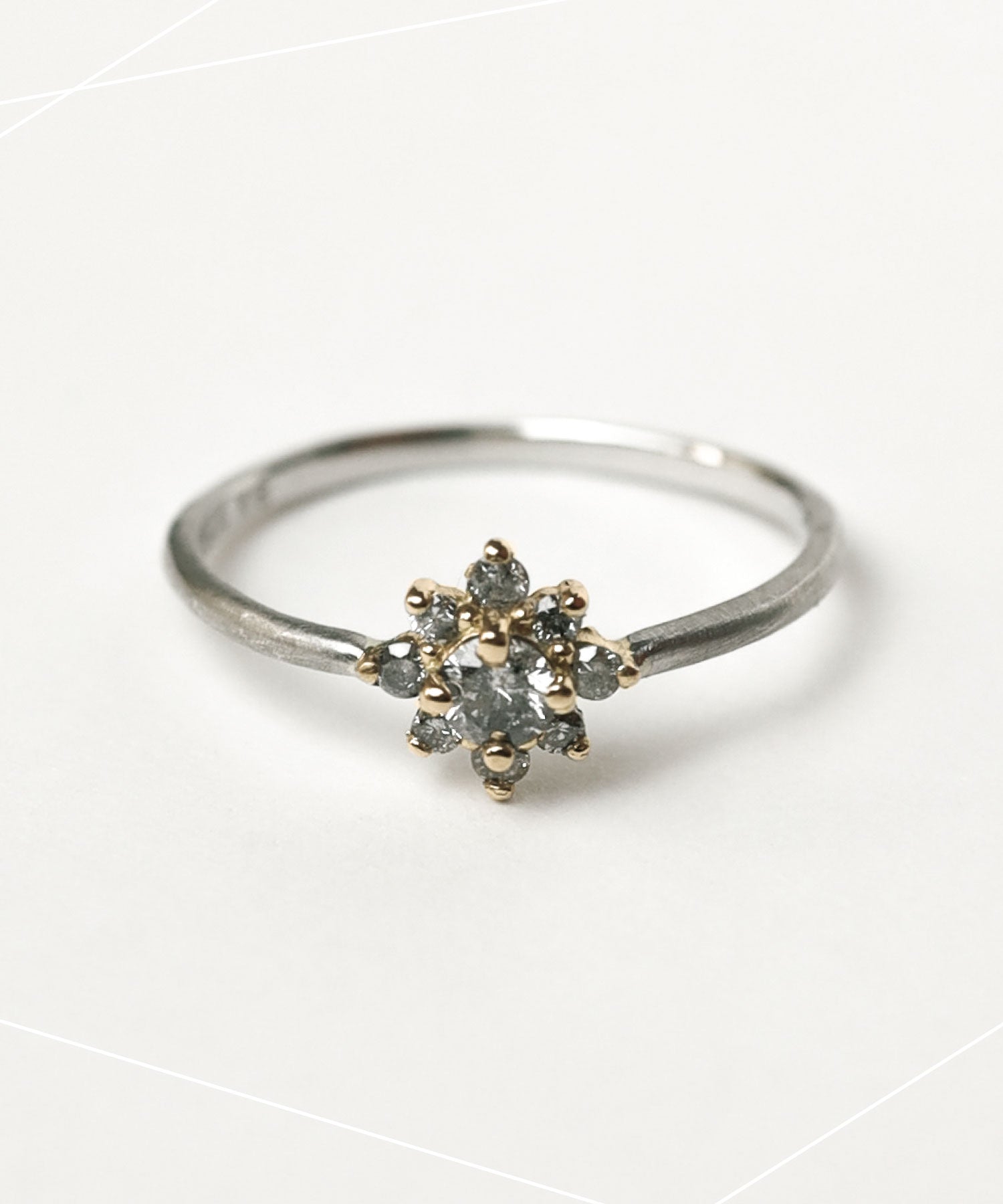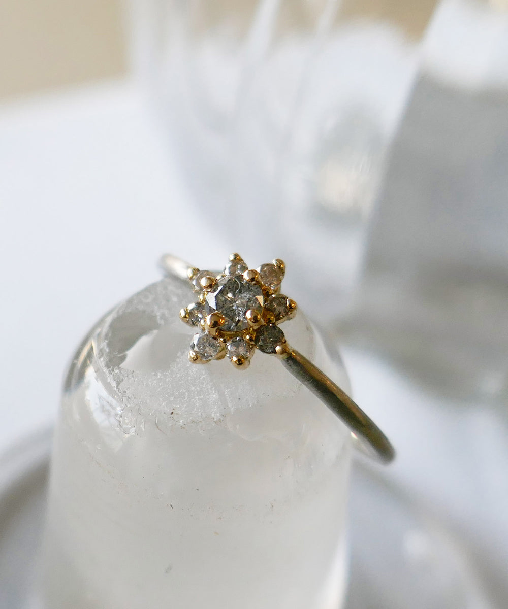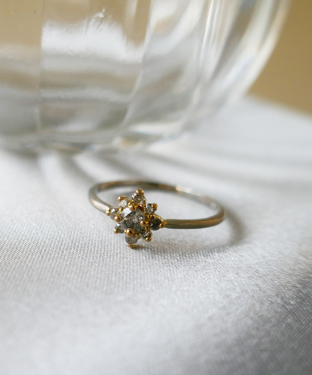 正面にセッティングされたグレーダイヤモンドはゴールドの石座の上で上品に輝きます。