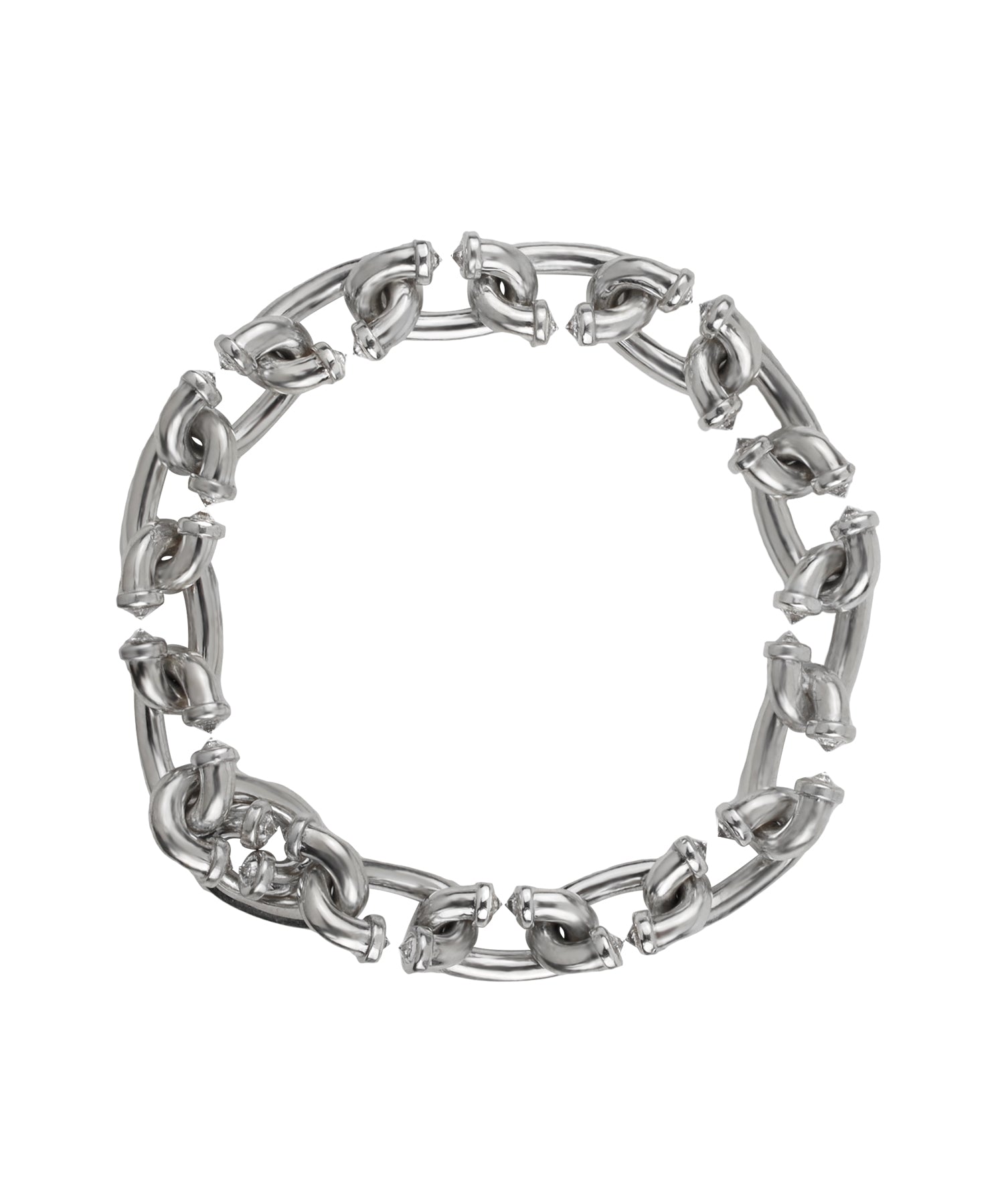 駒の開き部分の両サイドにキュービックジルコニアを裏留めでセッティングおり、大胆なデザインですが細部の装飾にもこだわったオリジナルチェーンのブレスレット。
