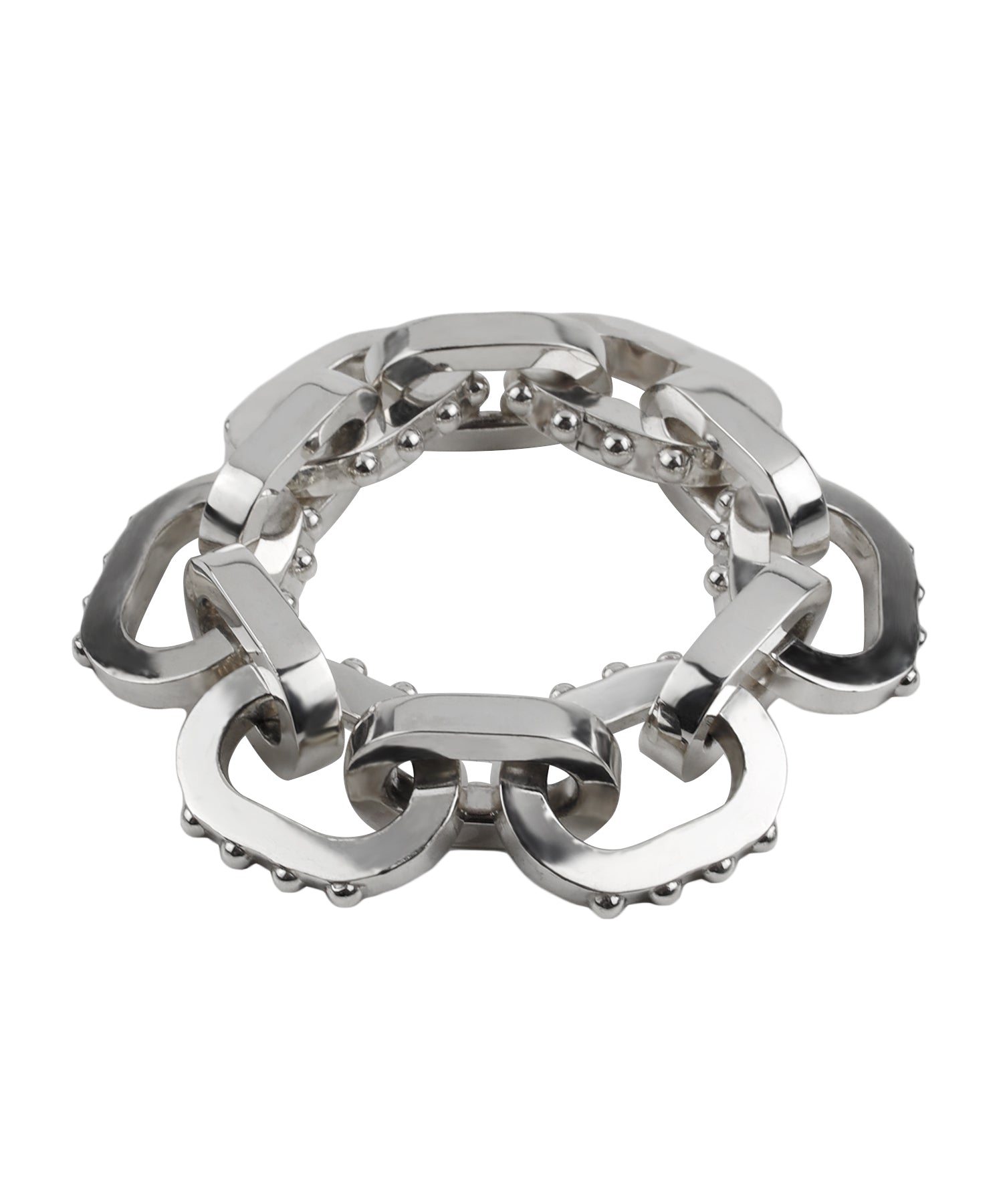 ラウンド型のスタッズをあしらったビッグブレスレット。タフなボリュームとそぎ落とされたシンプルなデザインでスタイリッシュな印象を与えます。
