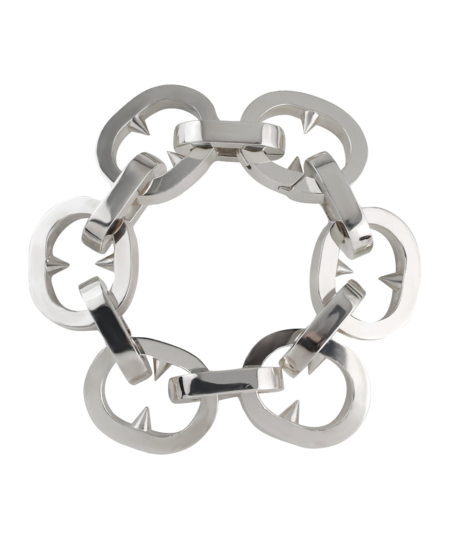 スタッズをあしらったビッグブレスレット。タフなボリュームとそぎ落とされたシンプルなデザインでスタイリッシュな印象を与えます。