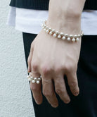 同じサイズ感の淡水パールが等間隔に揺れるブレスレット。シャープな印象のシルバーとパールの優美でやさしい光沢が織りなすコントラスト。