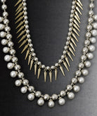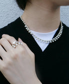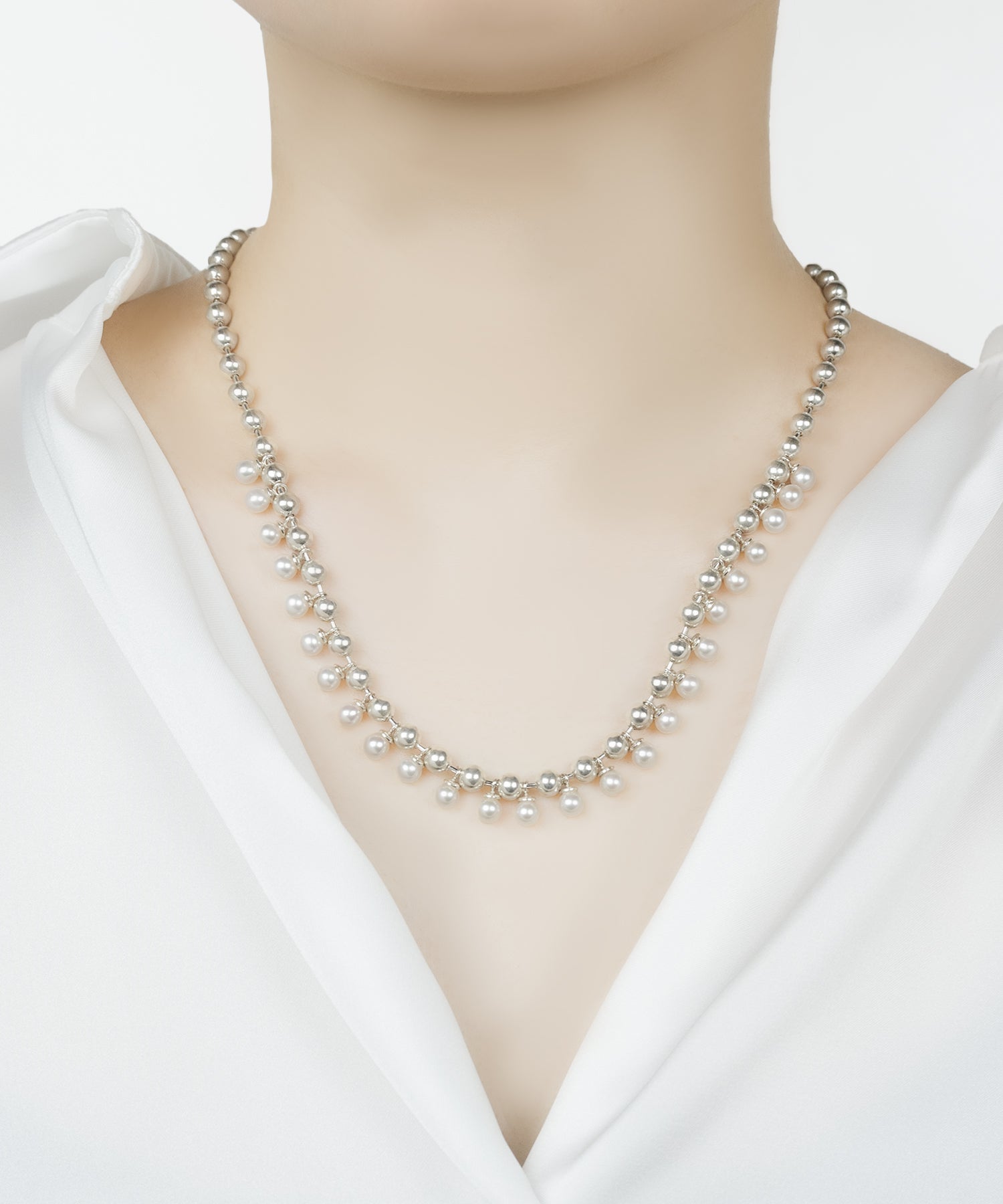同じ球体でも異なる輝きを纏うモノ同士が組み合わさり、首元に立体感を生み出し、シンプルでありながら印象的な存在感を放ちます。