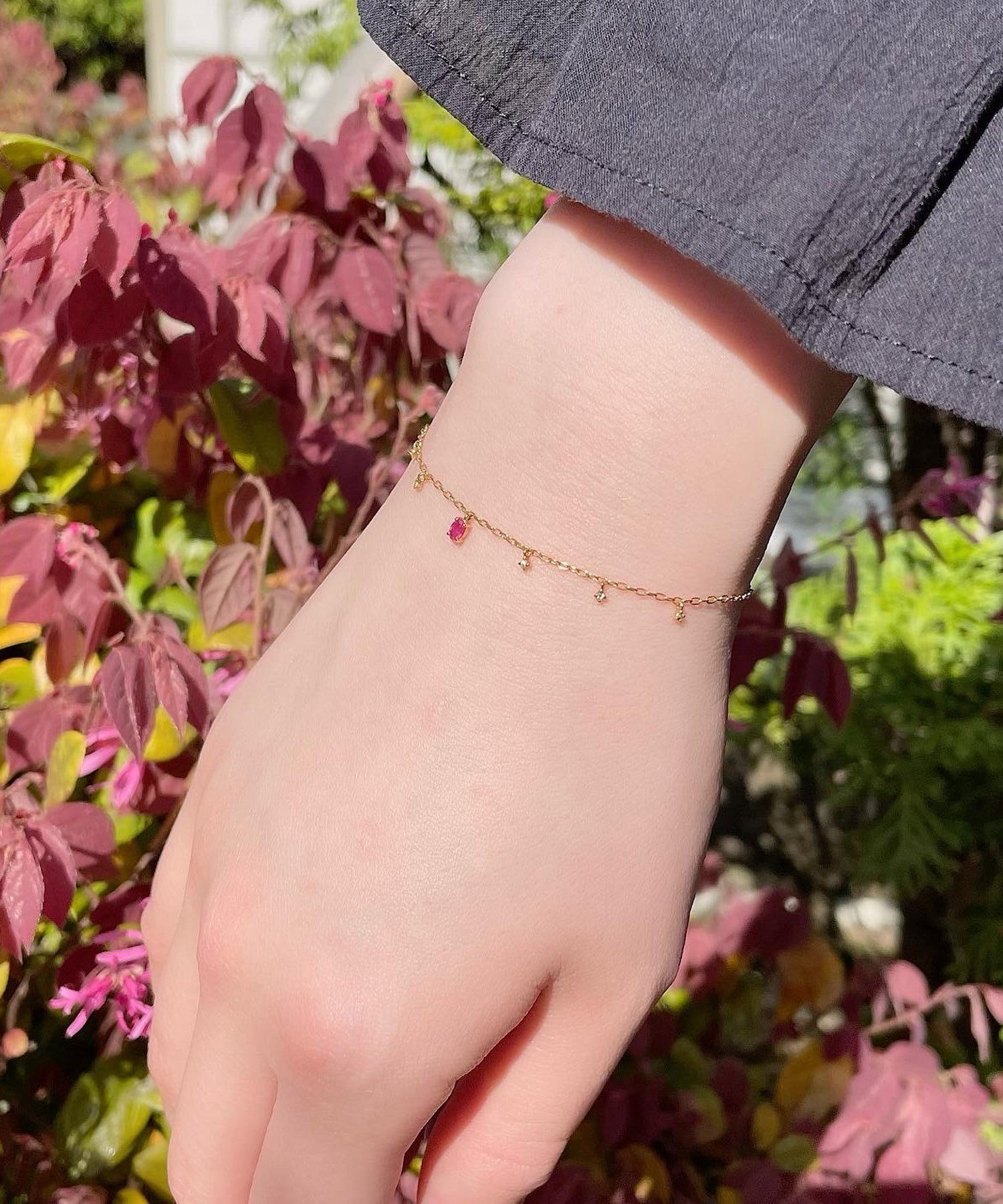 サファイアとダイヤモンドが揺れるゴールドのブレスレット。