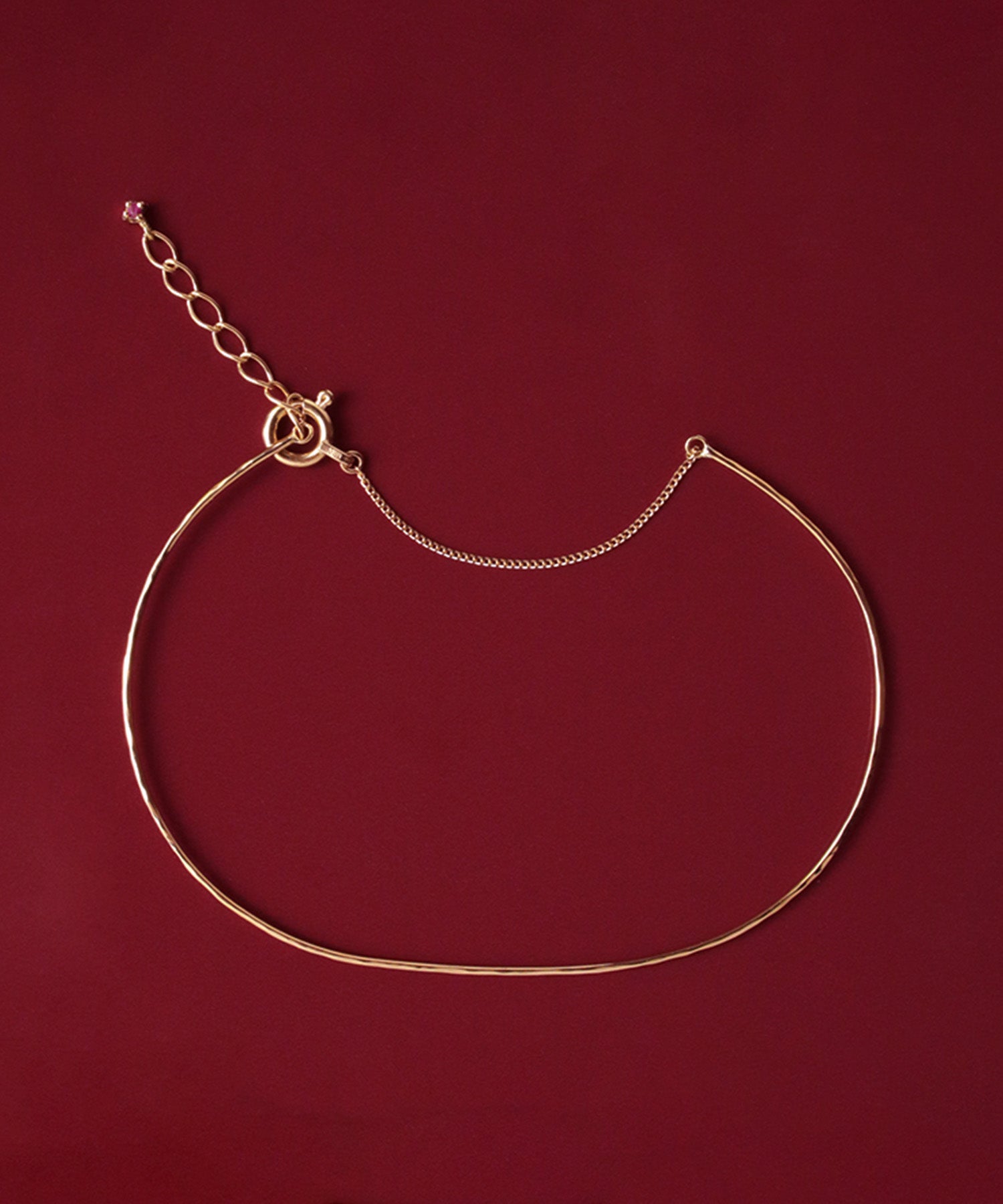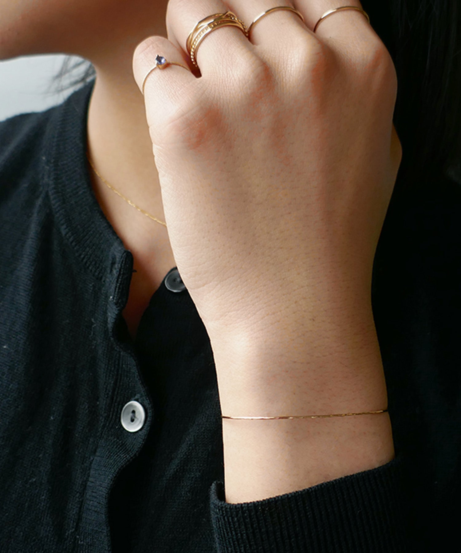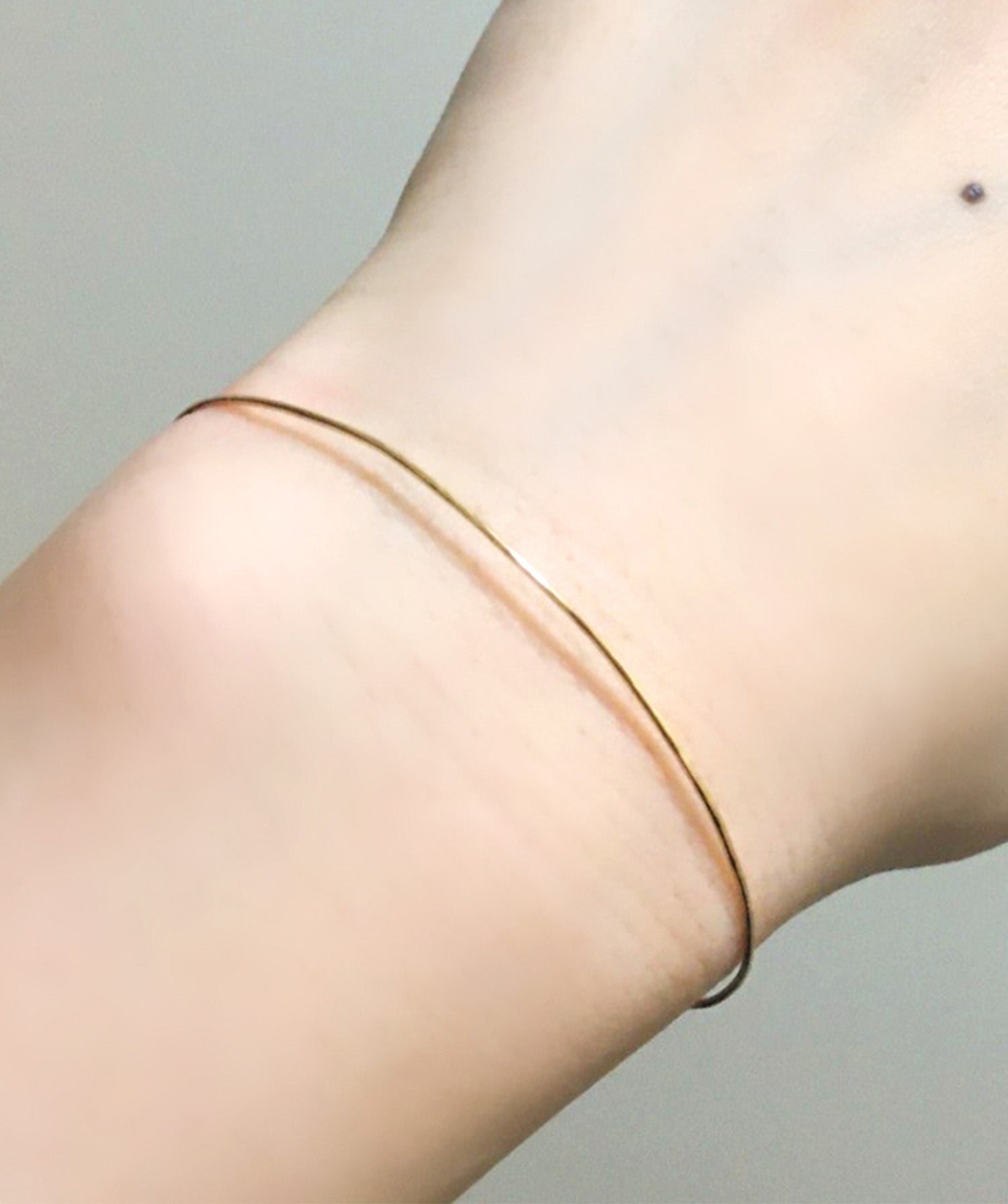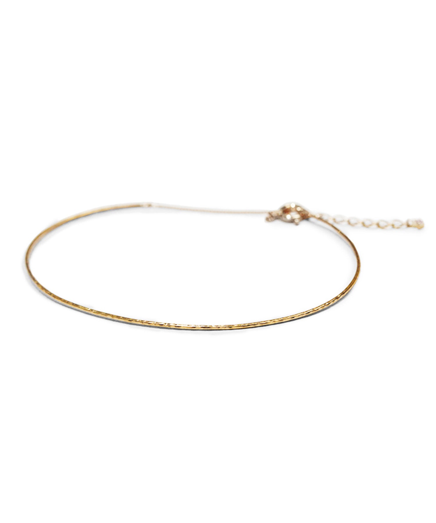 ゴールドのバングルブレスレット。丸線に叩き加工を入れることで柔らかく落ち着いた印象になりカジュアルなお洋服にも合わせやすい万能なデザインです。