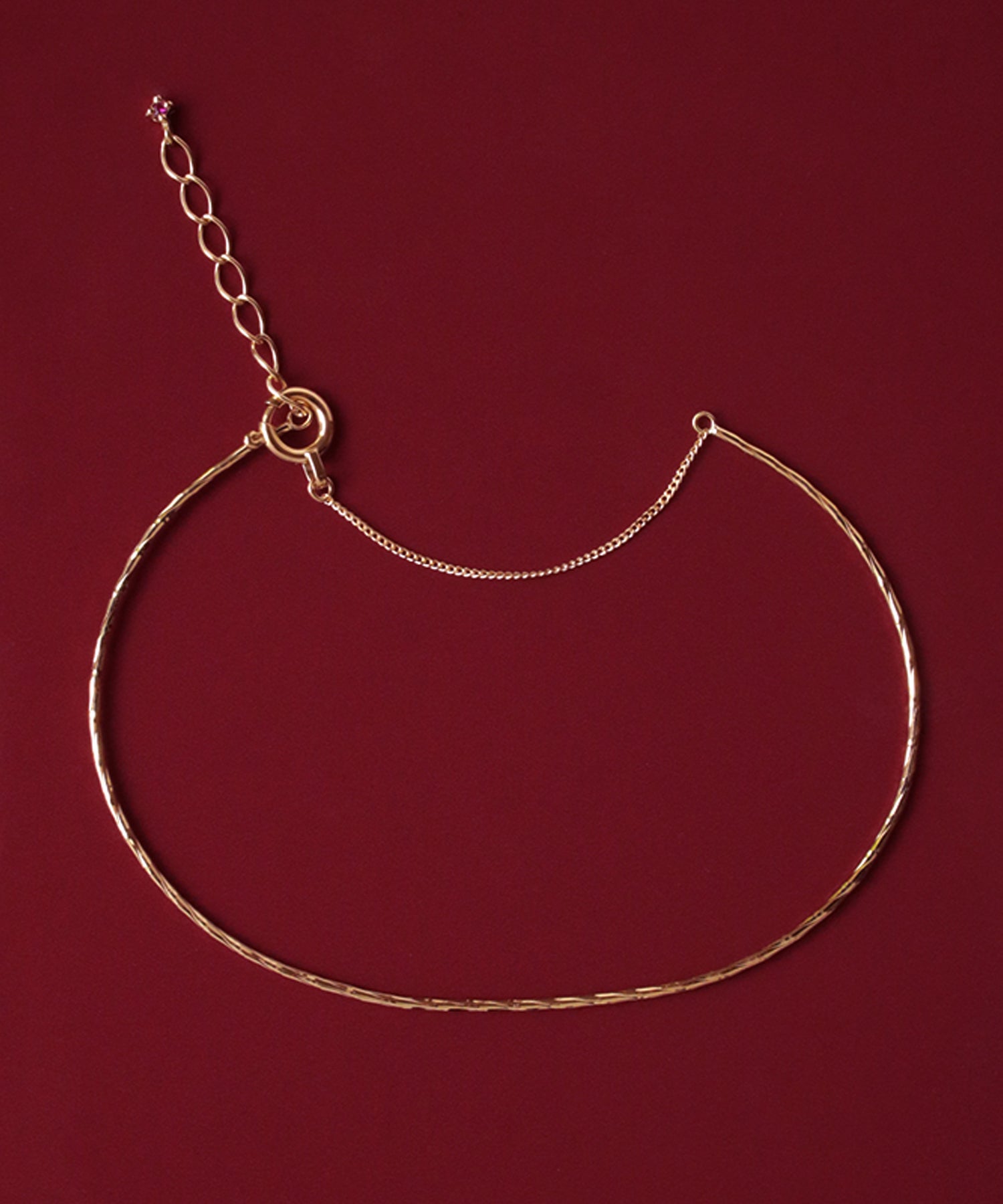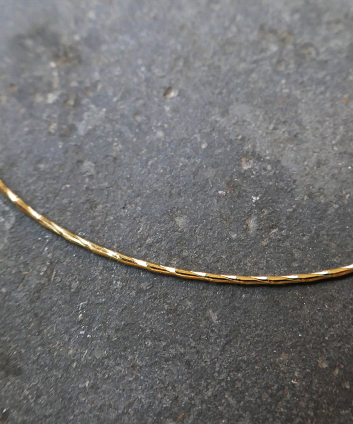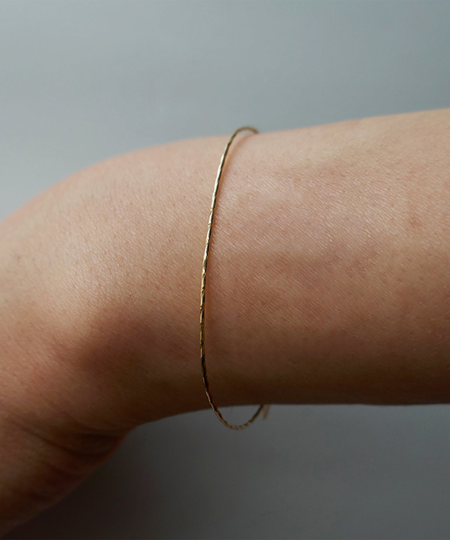 ゴールドの細身のバングルブレスレット。表面にカットを施したデザインが動くたびにキラキラと光ります。
