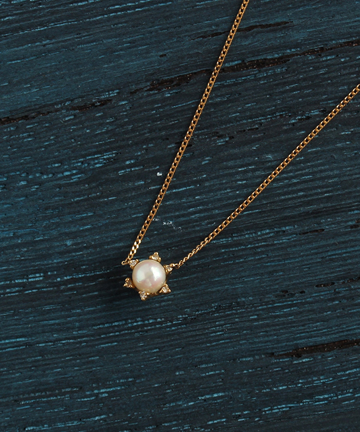 アコヤパールをセッティングした石座の爪の部分に、さらにダイヤモンドをセッティングしたお花のようなデザインのネックレス。細やかな職人技が光るデザインです。パールの美しいホワイトとダイヤモンドの輝きが、首元を華やかに演出します。