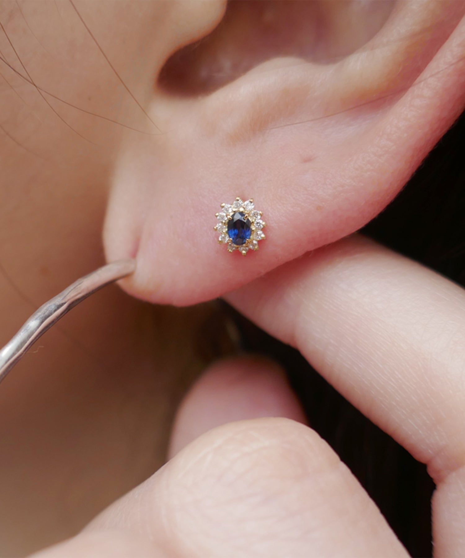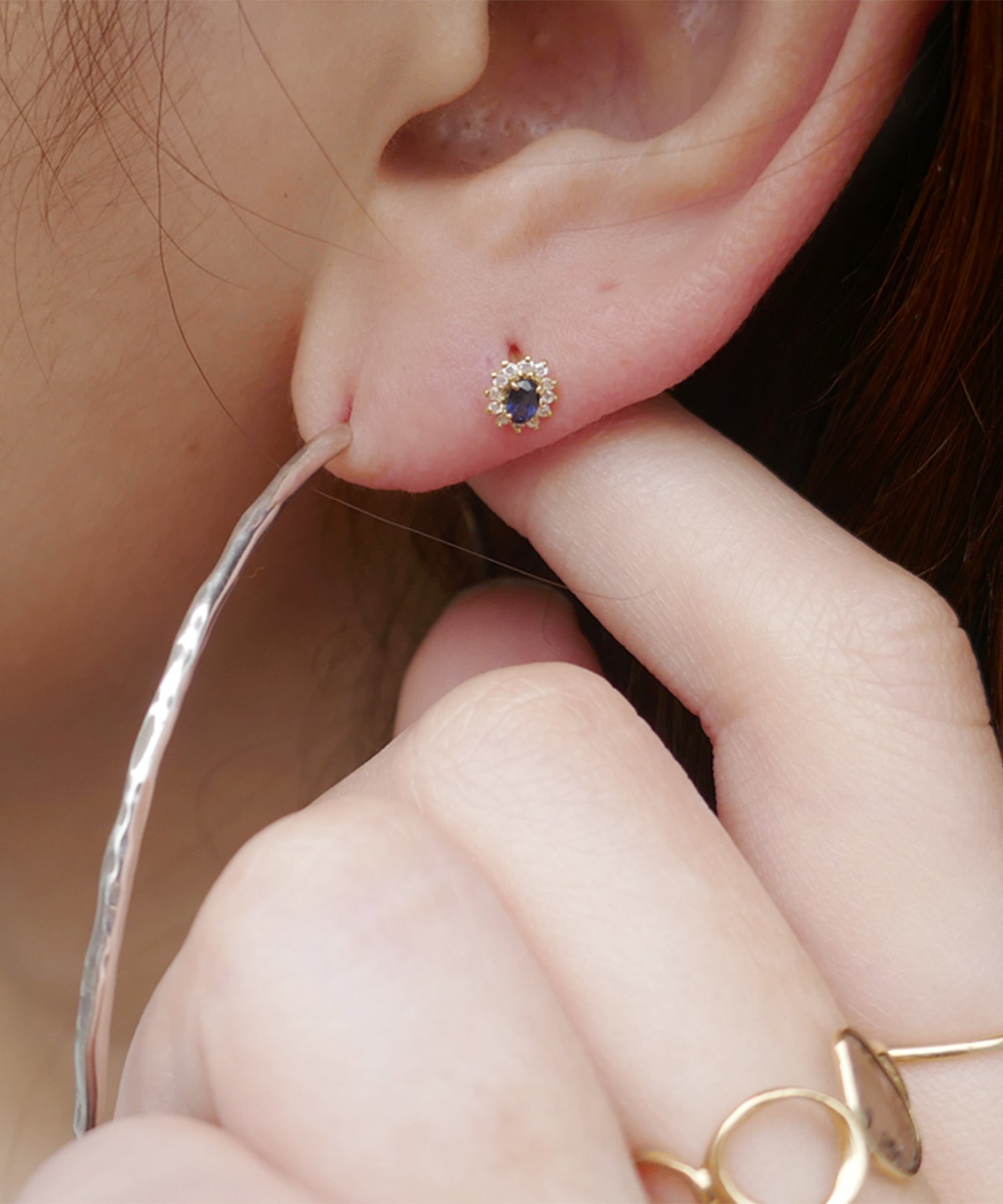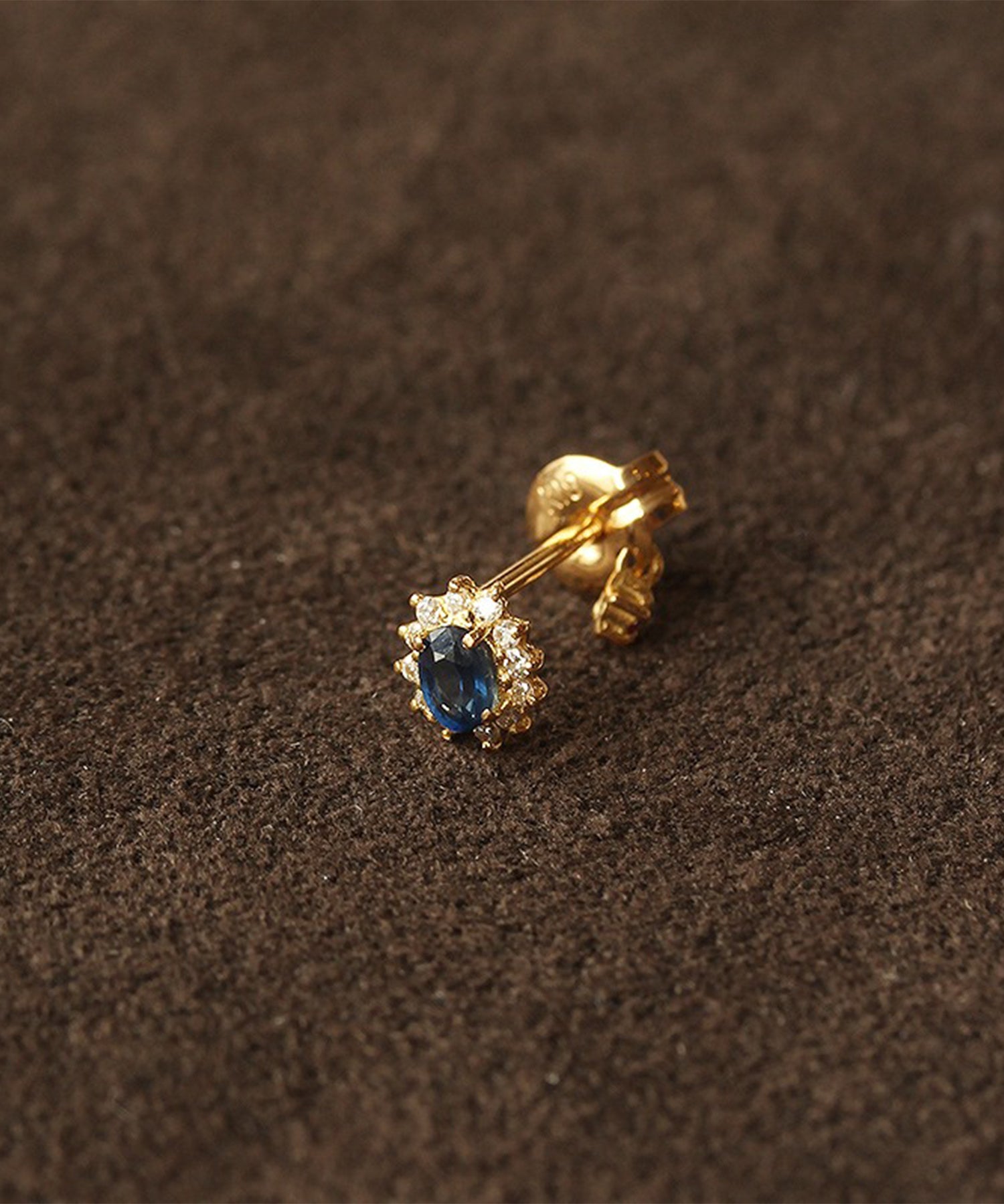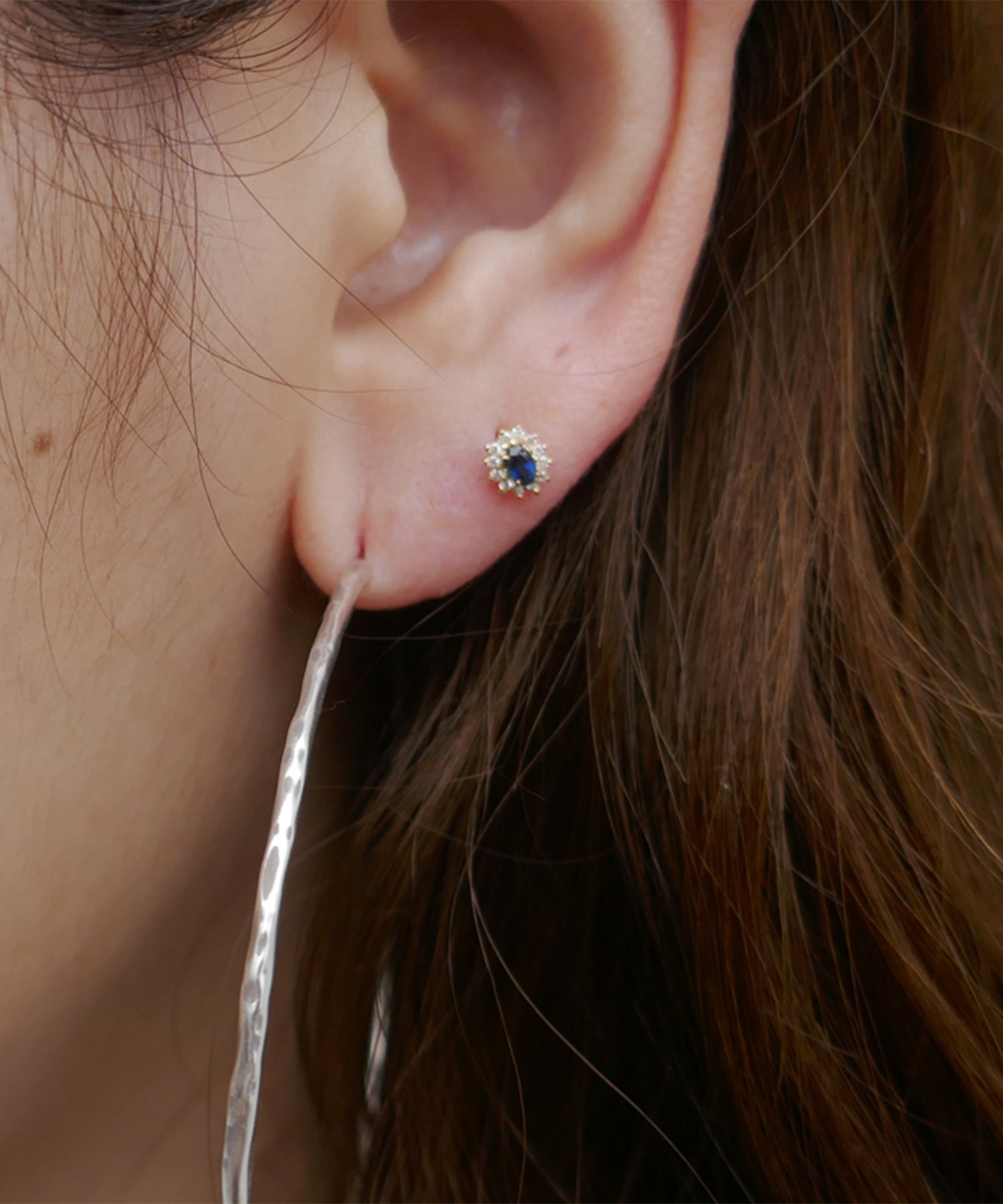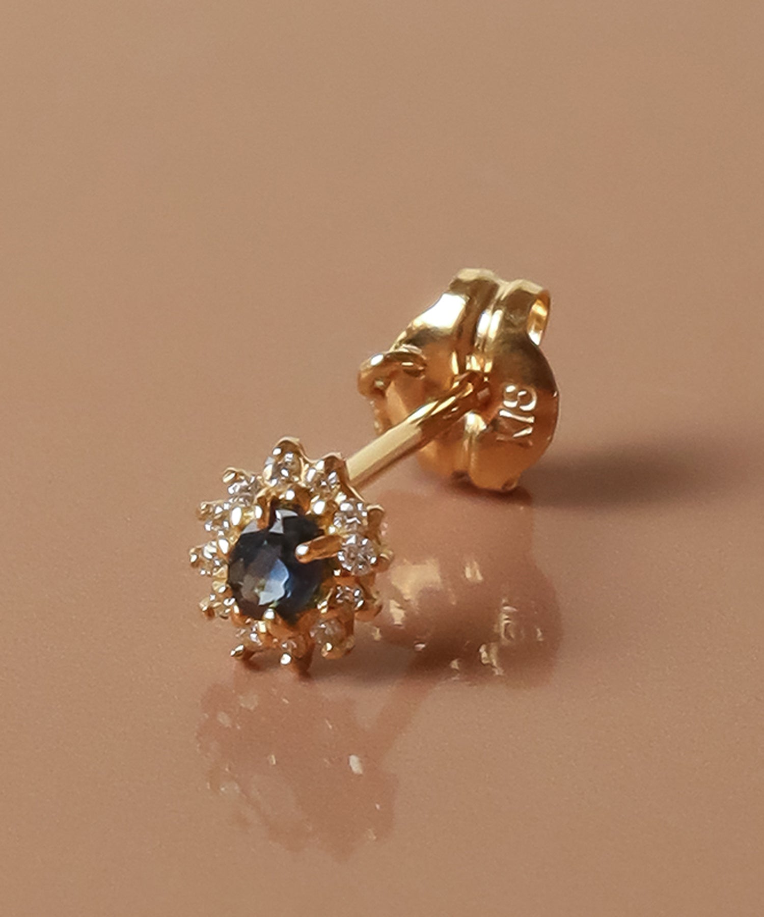 サファイアにダイヤモンドを贅沢にあしらったピアス。アンティーク風なデザインはクラシカルな装いにぴったりです。