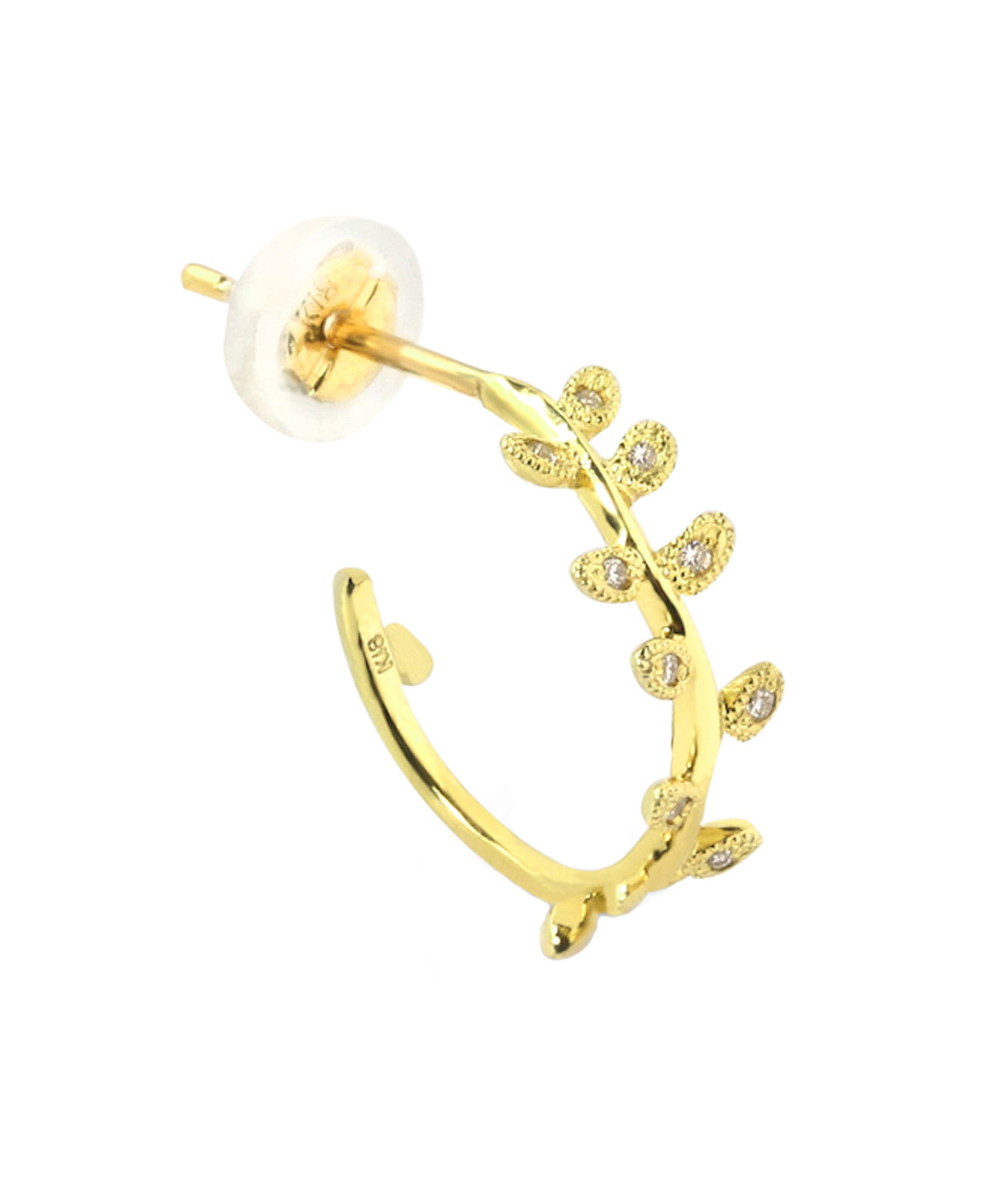 葉っぱをモチーフにしたフープピアス。グリーンゴールドの爽やかで優しい色合いが肌にキレイに馴染みます。