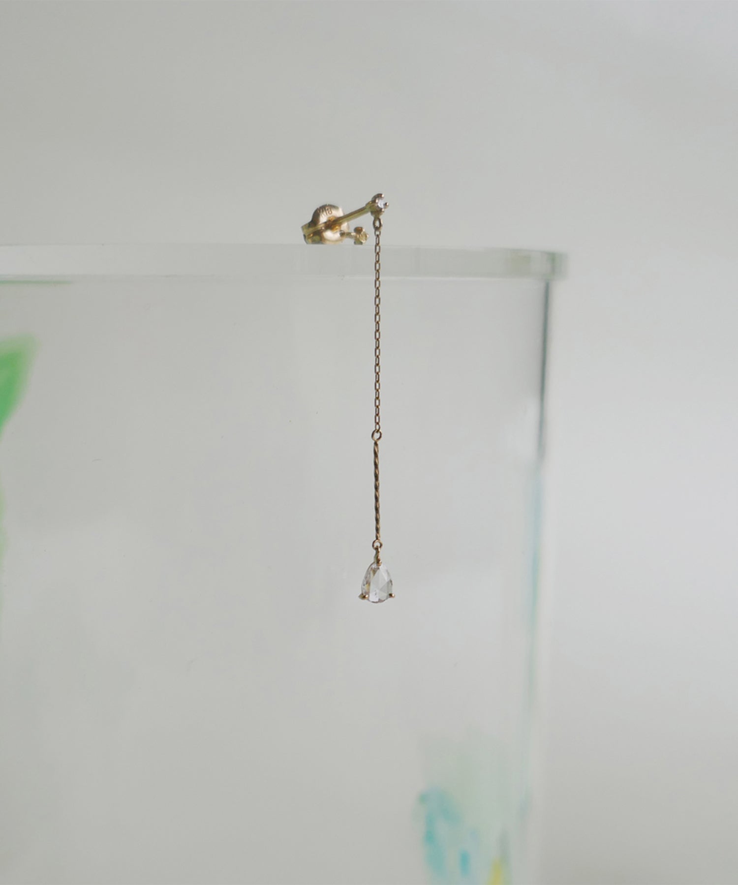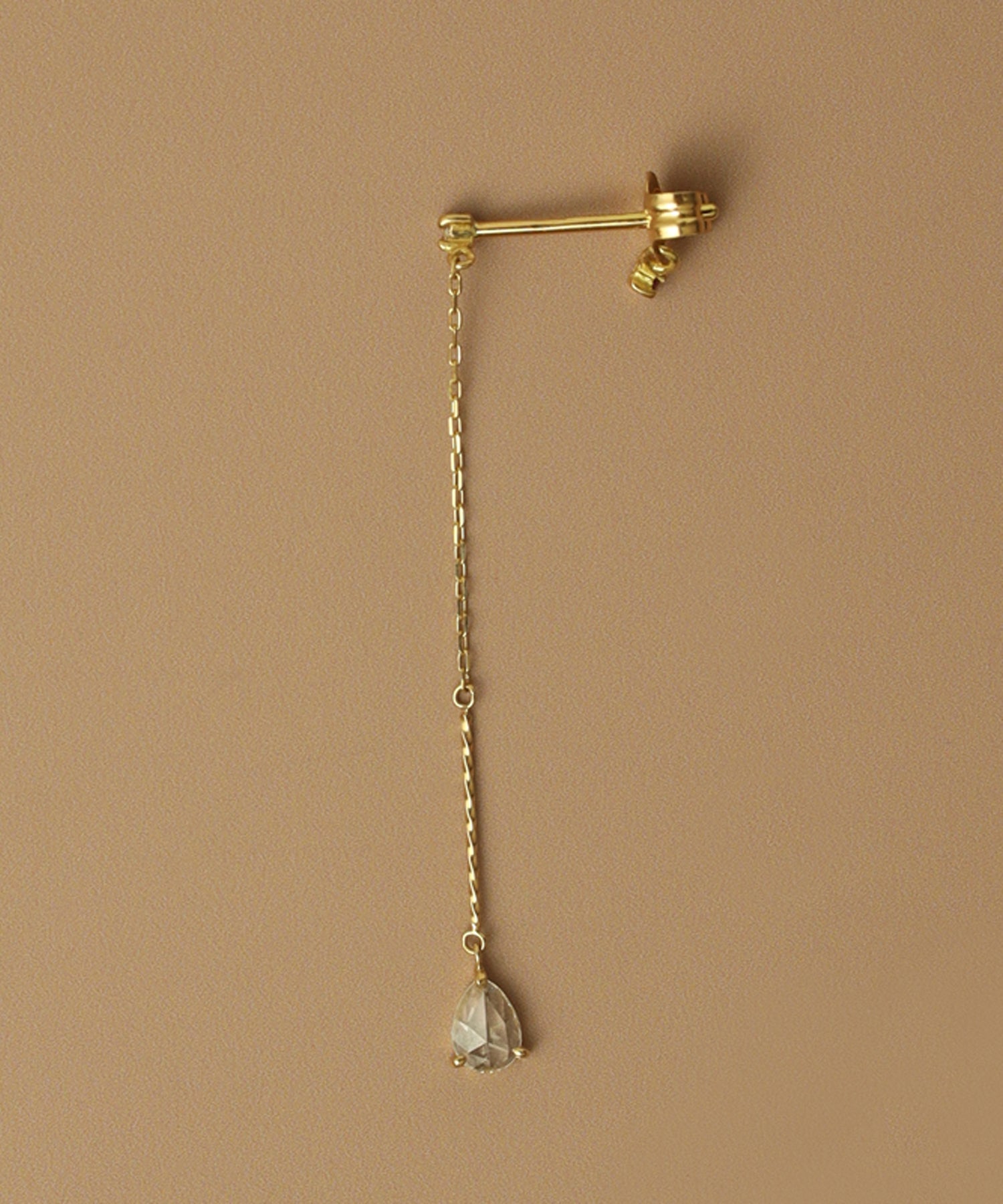一粒のダイヤモンドからゴールドチェーン、カットバーとその先にダイヤモンドをセッティングしたピアス。ペアシェイプローズカットされたダイヤモンドは、ロマンティックに輝きます。