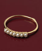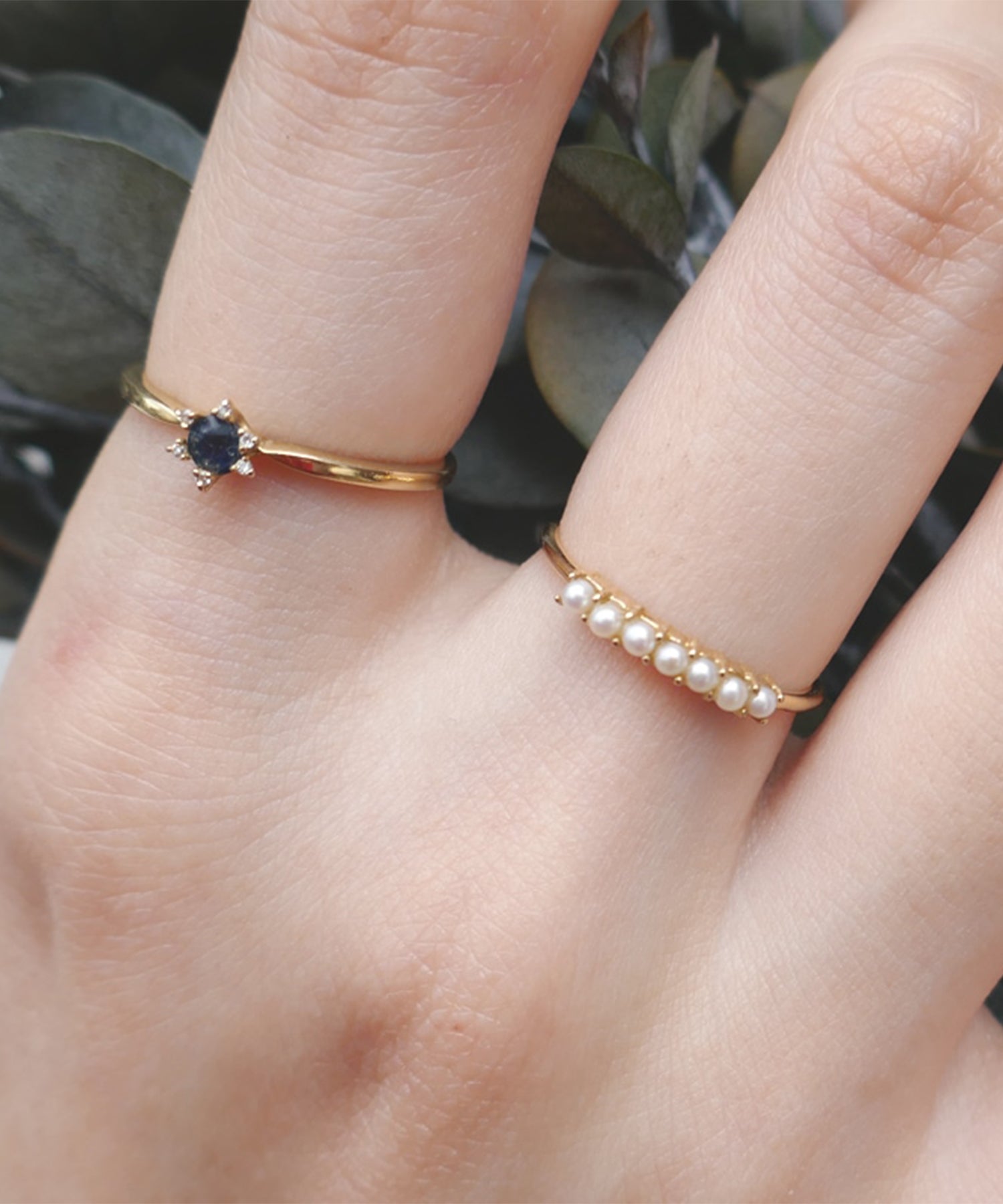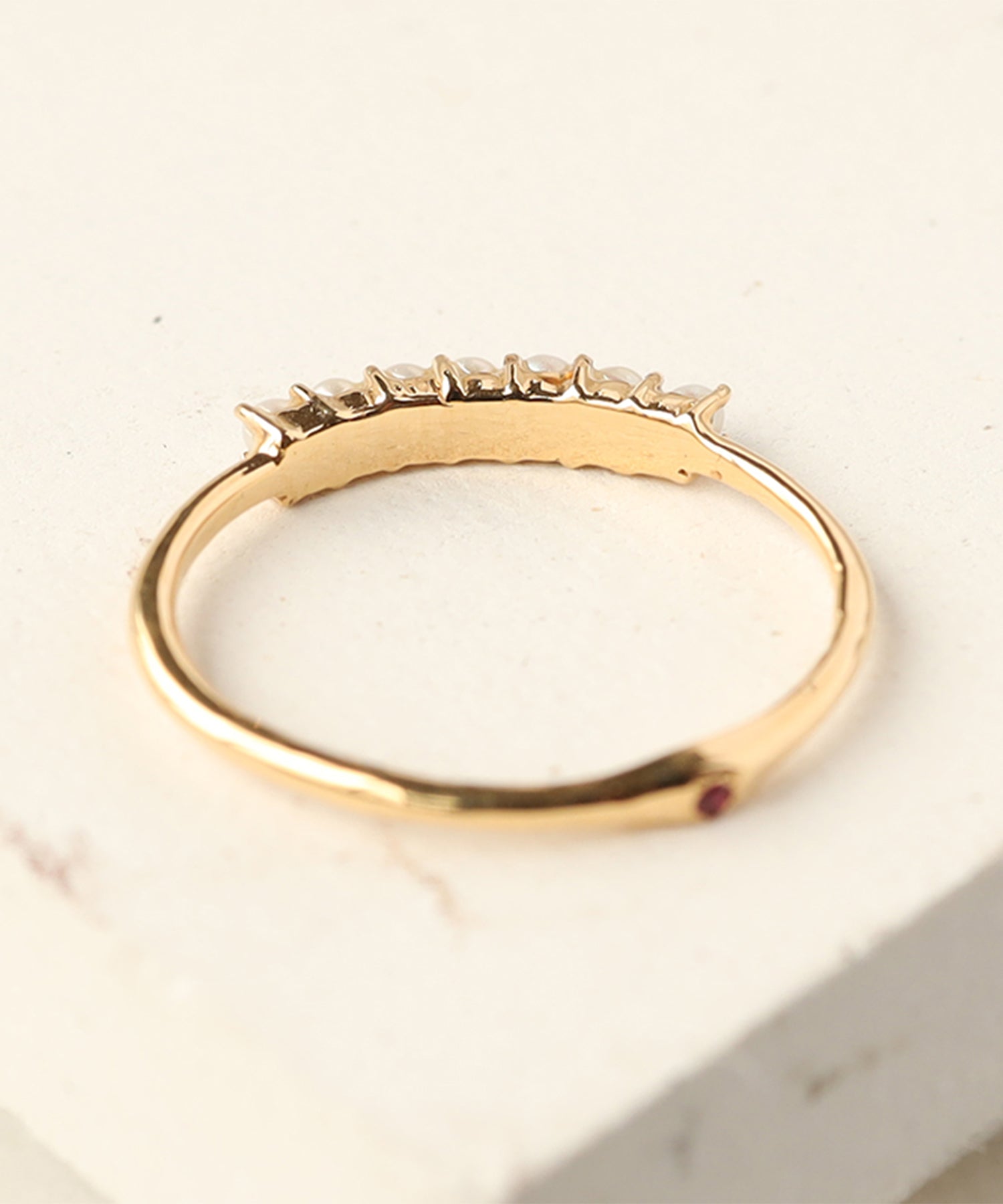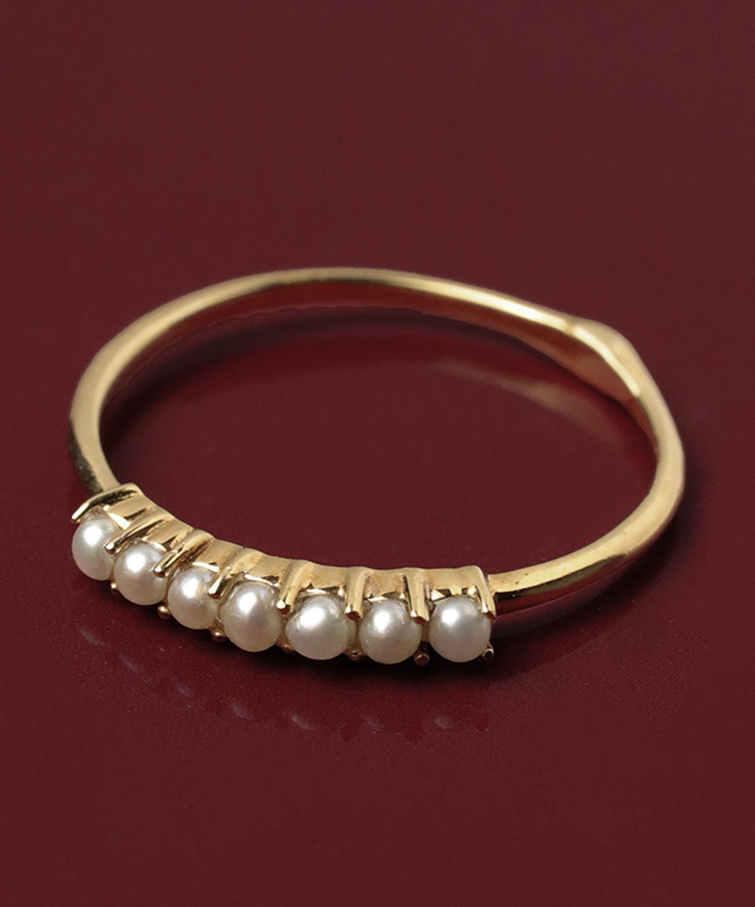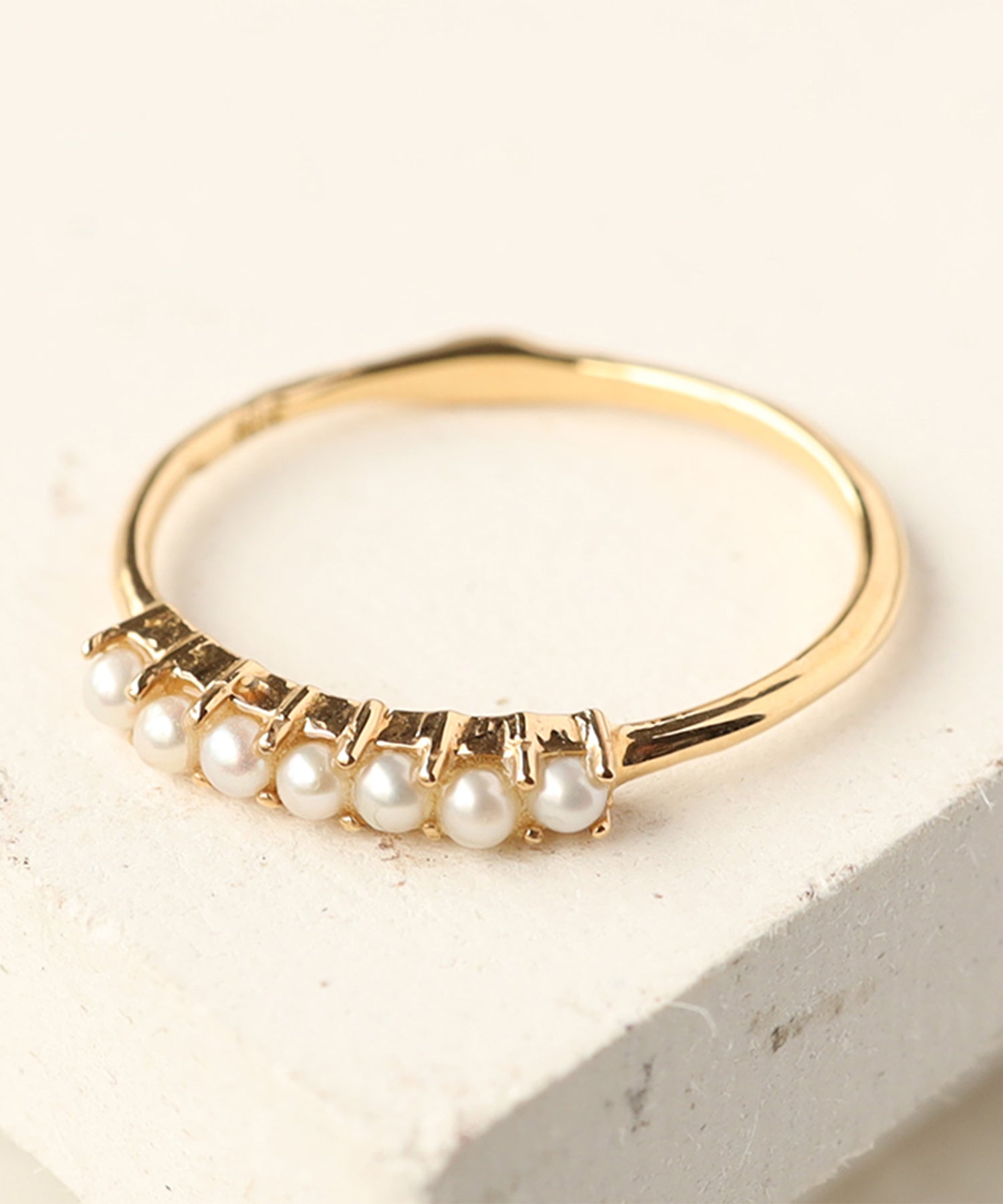 アコヤパールが並んだ上品なゴールドリング。職人がバランスを見ながらセッティングした