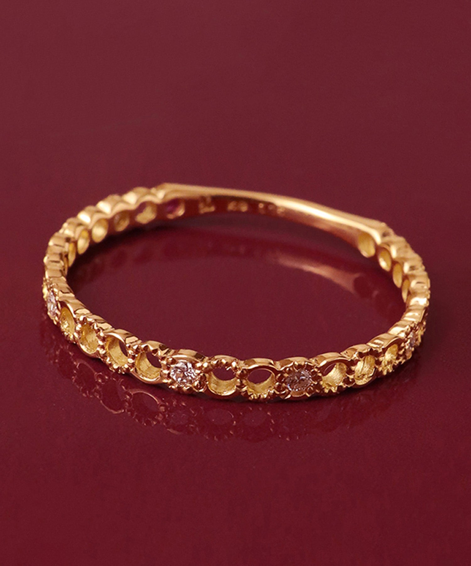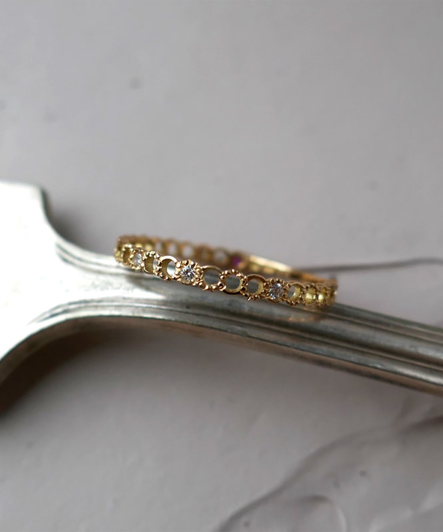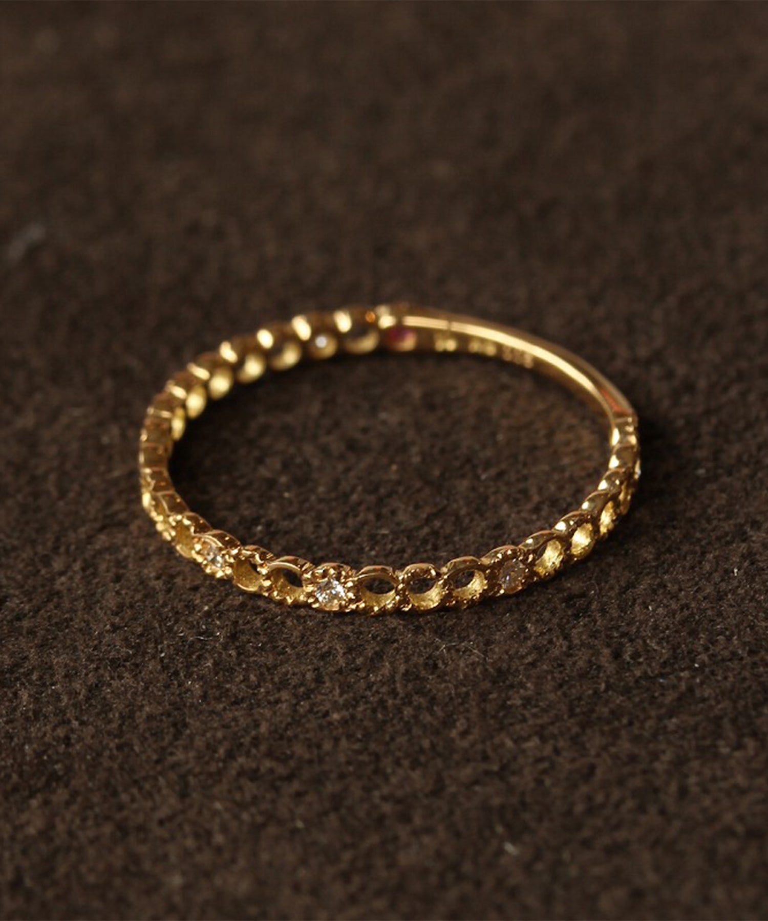 連なる円とランダムにセッティングされたダイヤモンド。流れるように施されたミル打ちのデザインが繊細で上品に手元で輝きます。