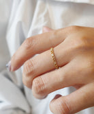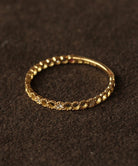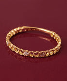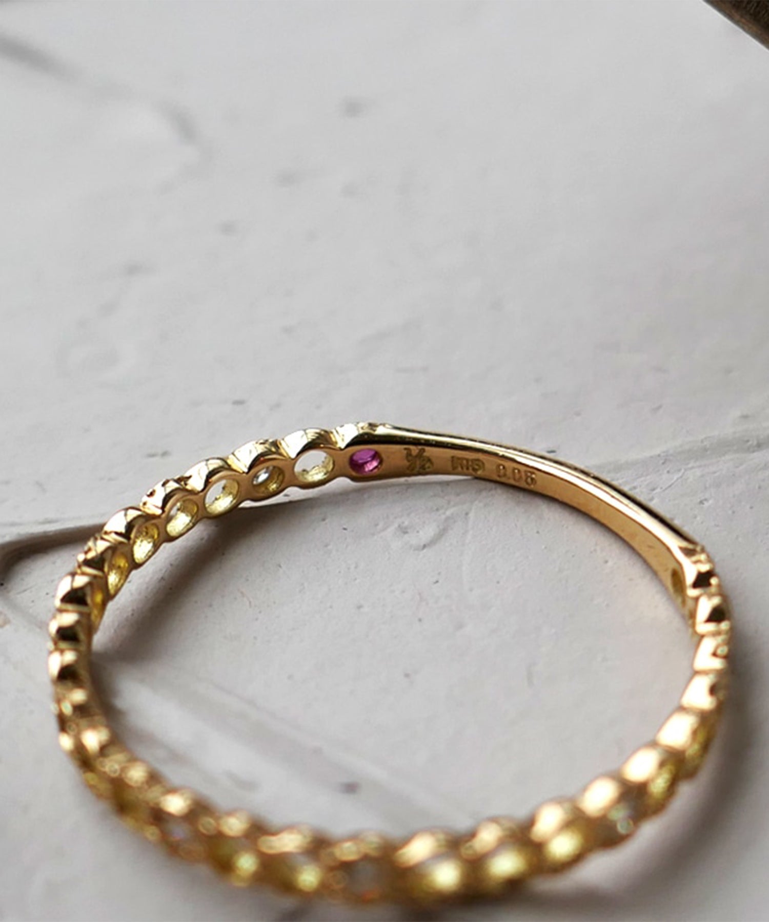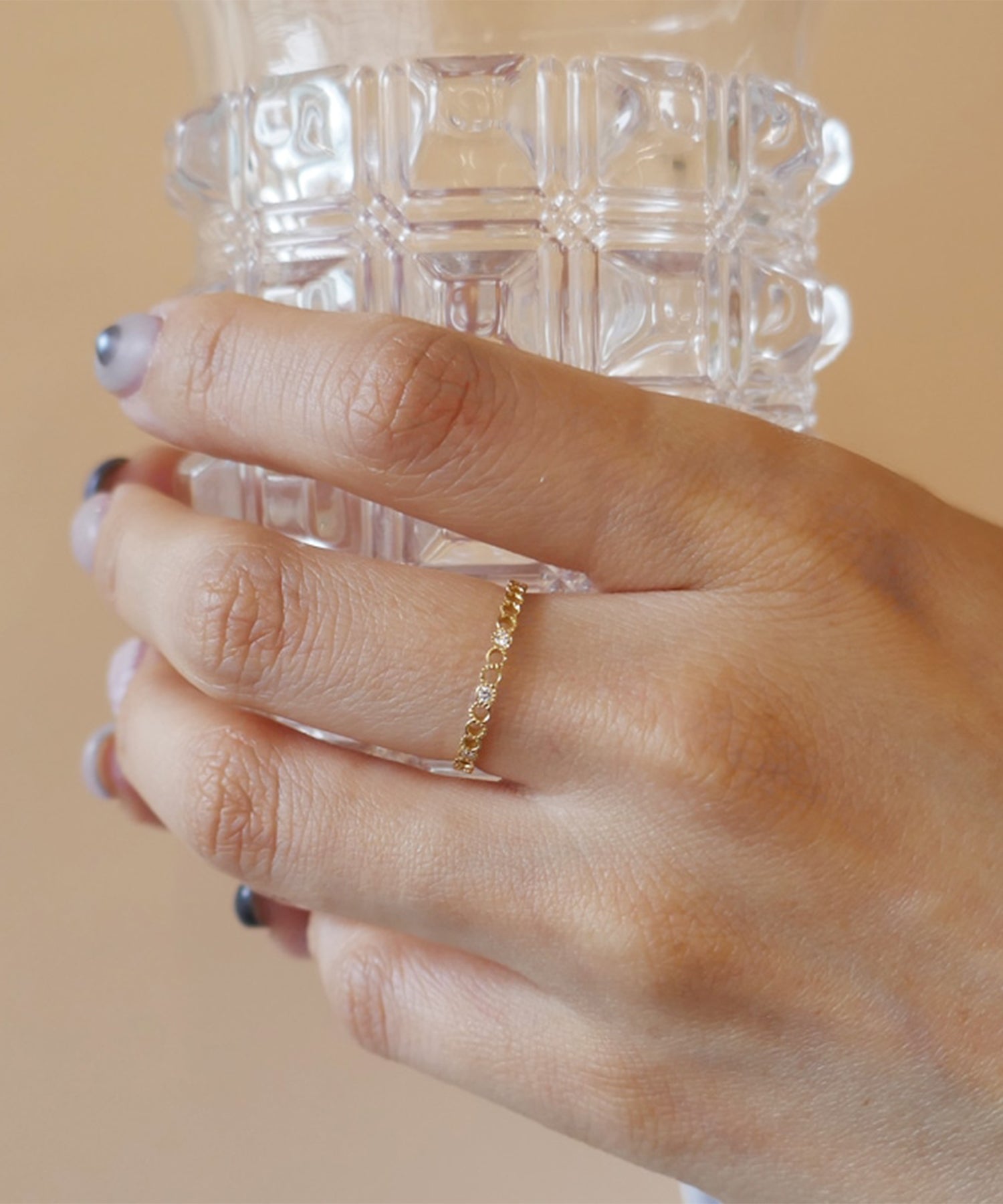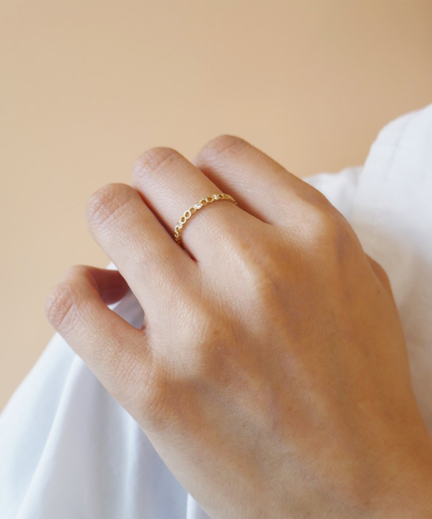 連なる円とランダムにセッティングされたダイヤモンド。流れるように施されたミル打ちのデザインが繊細で上品に手元で輝きます。