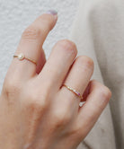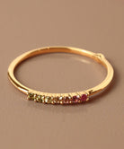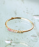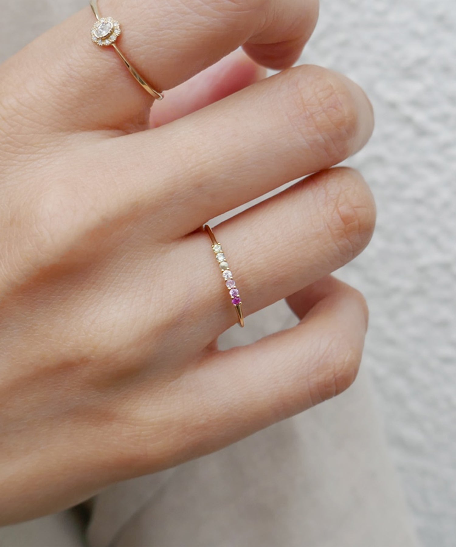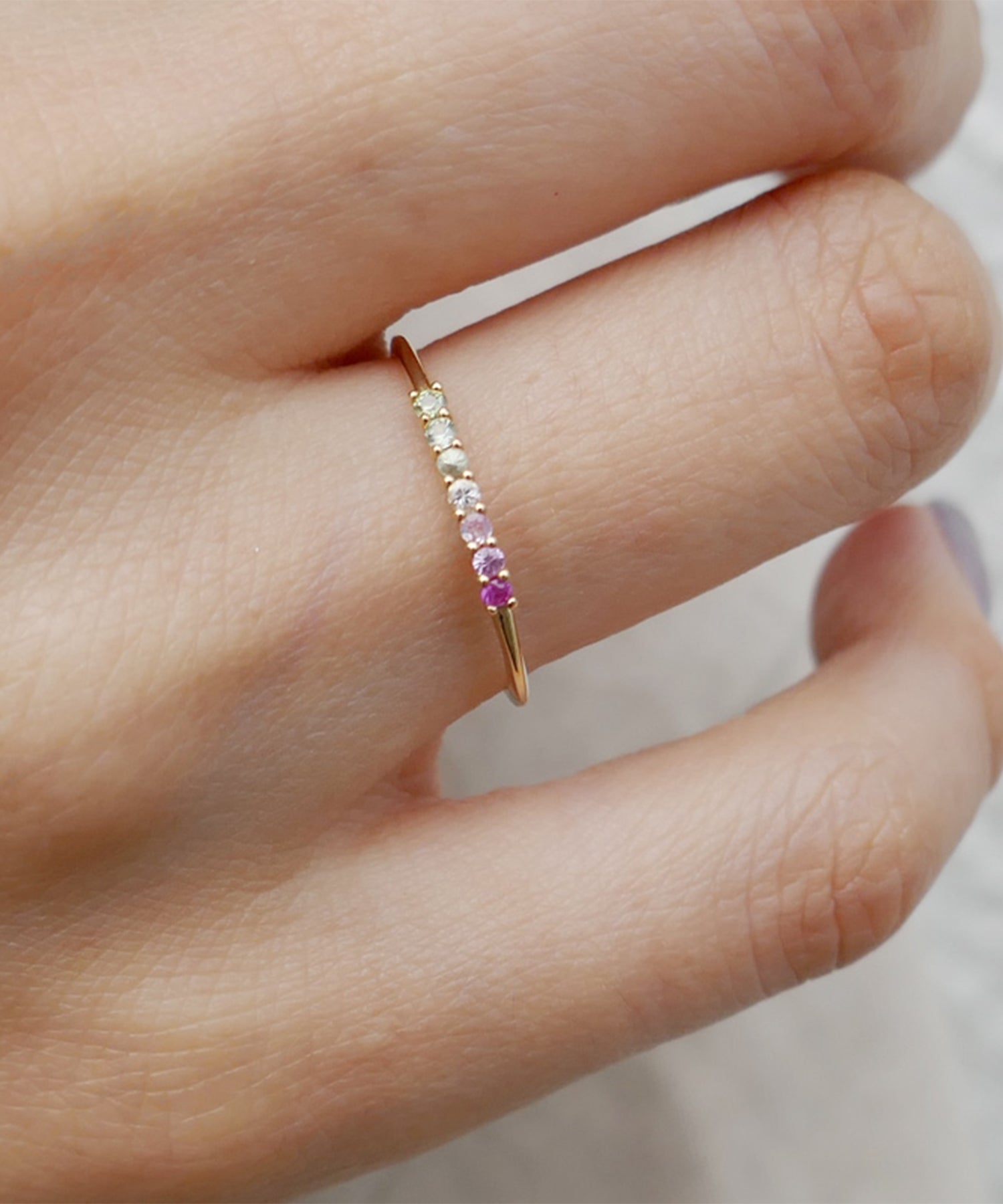 ピンクからグリーンへグラデーションに並んだ天然石が水彩画のように美しい。派手すぎずかわいらしいカラーは小さい頃に宝石やジュエリーに憧れたあのトキメキを思い出させてくれる気がします。カラーサファイアのひとつひとつ異なる鮮やかな色味をお楽しみください。littleemblemの全てのアイテムには象徴として小さなルビーが1石セッティングされています。あなたが輝き、ずっと笑顔でいられるようにという想いをひとつひとつのアイテムに込めました。