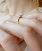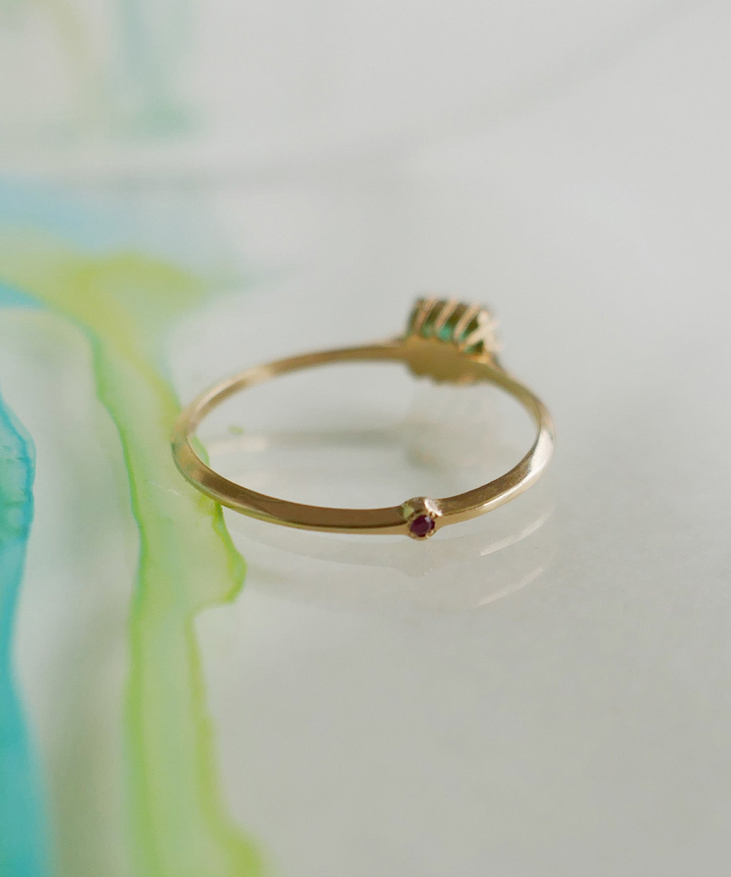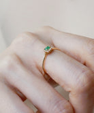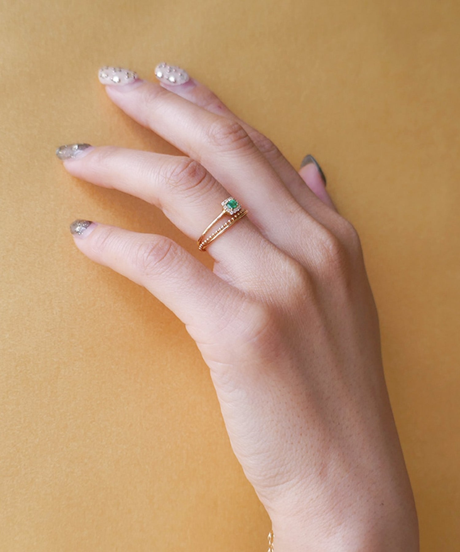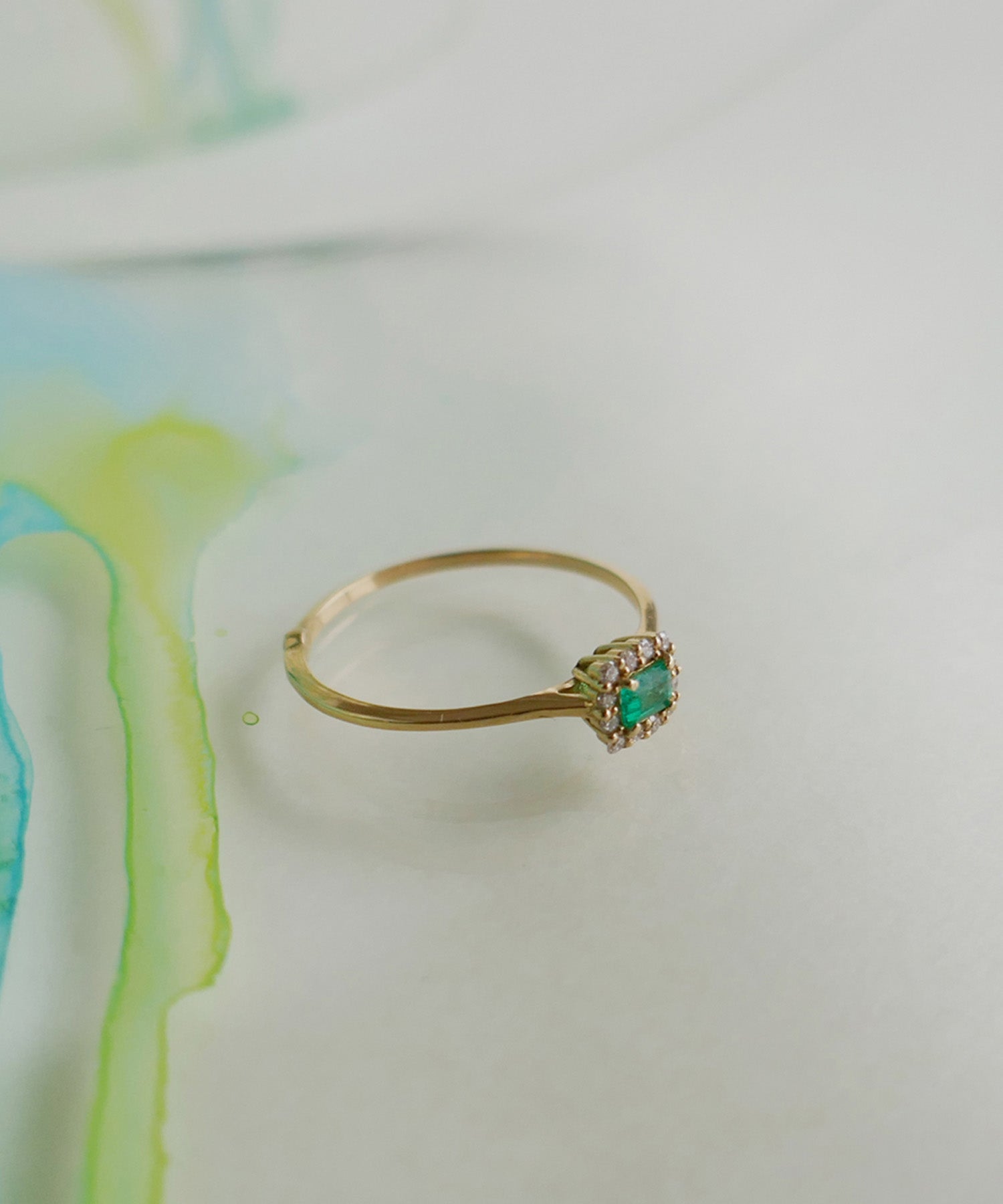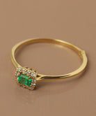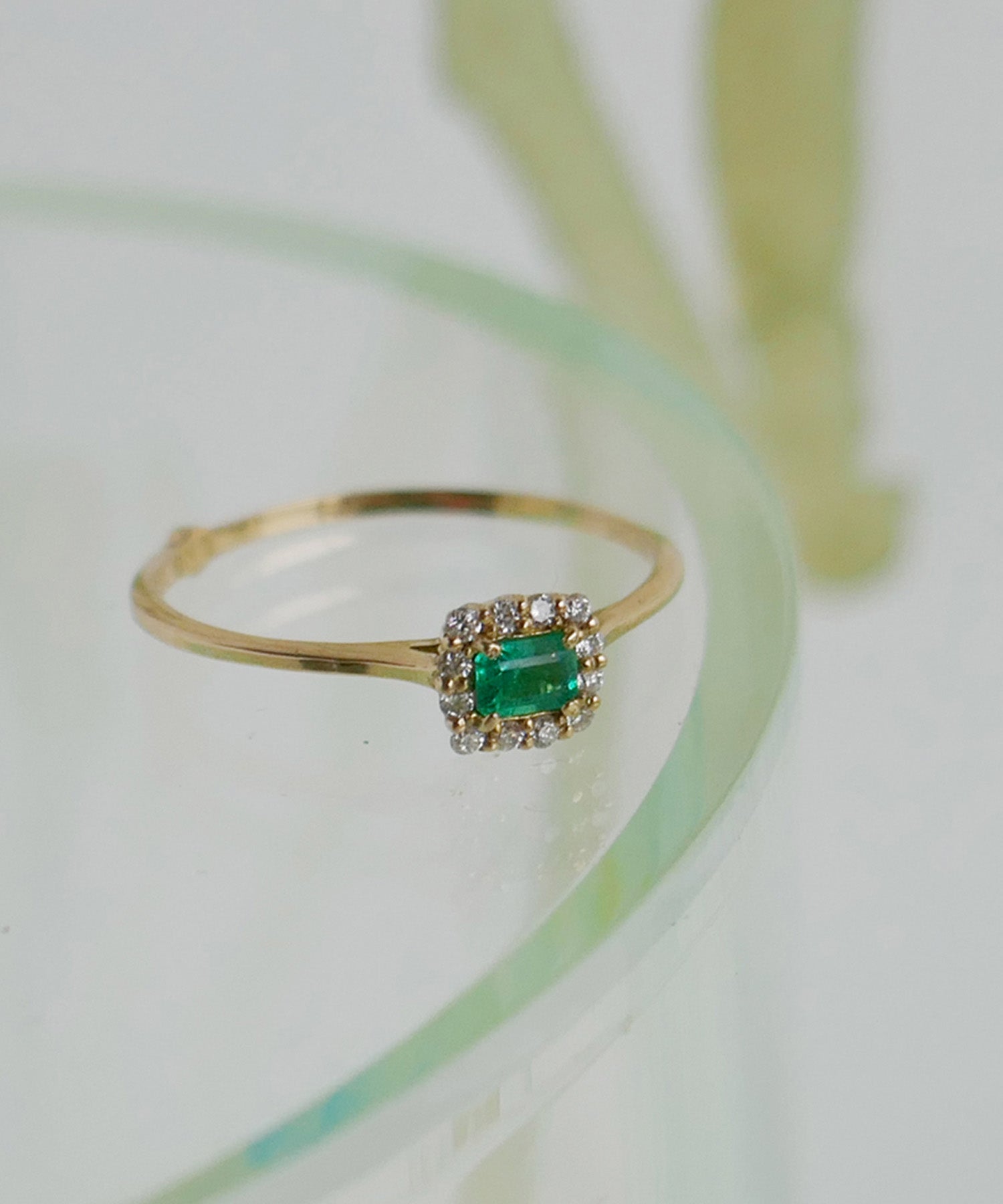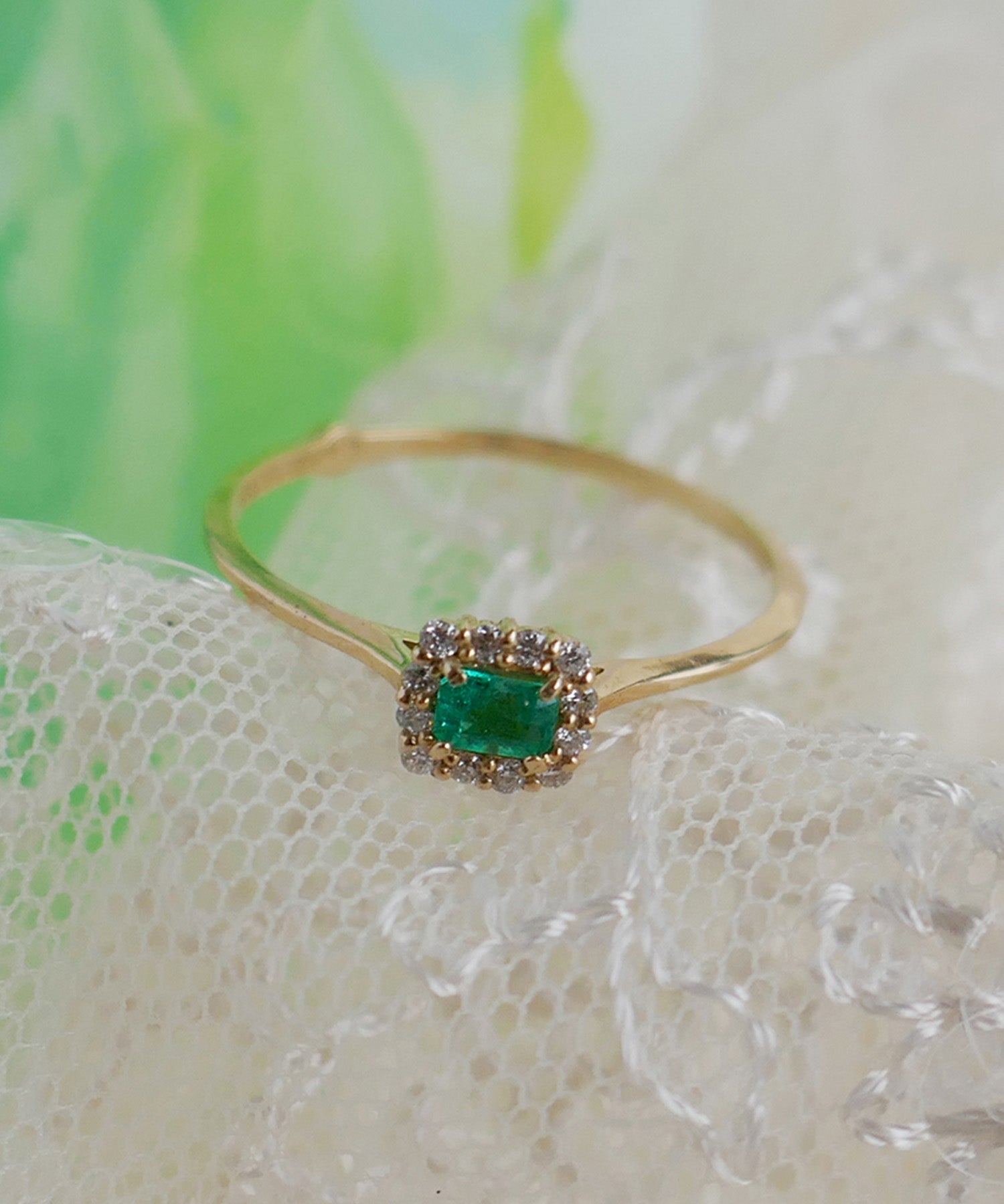 エメラルドにダイヤモンドが取り巻いたトップが魅力的なゴールドリング。