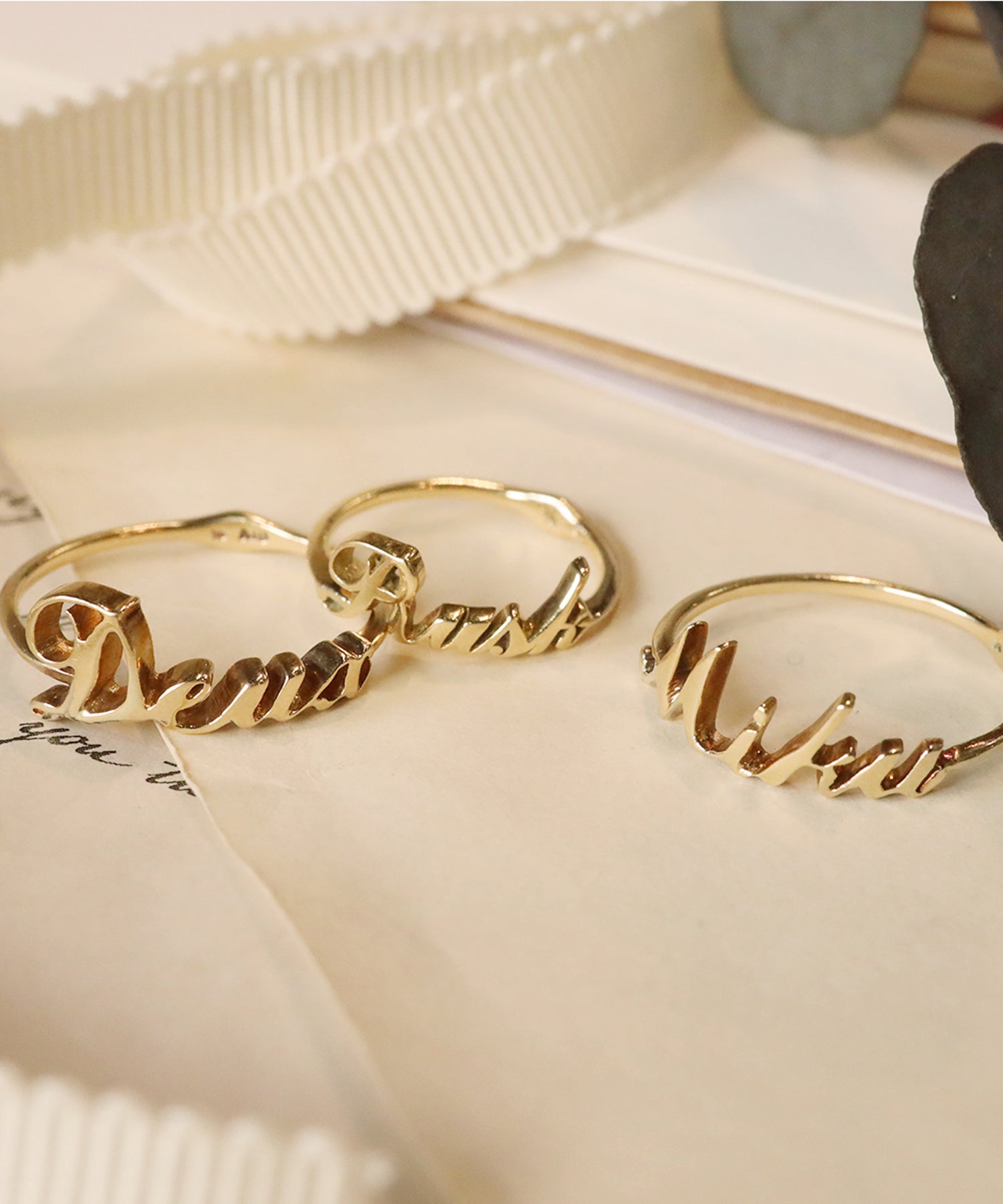 アンティーク調の流れるようなフォントで お名前やイニシャル、大切にしている言葉をジュエリーに仕立てます。