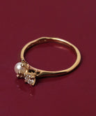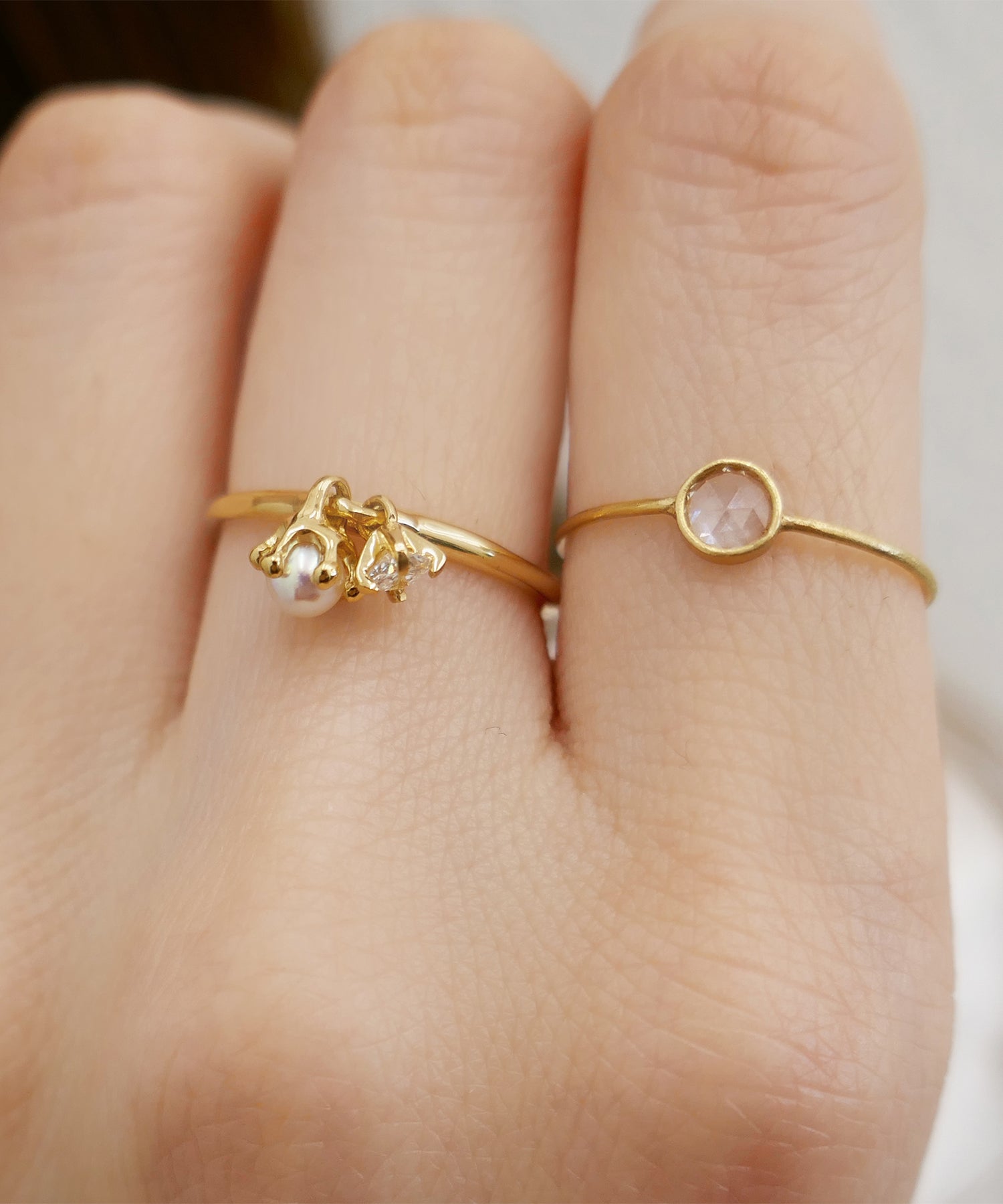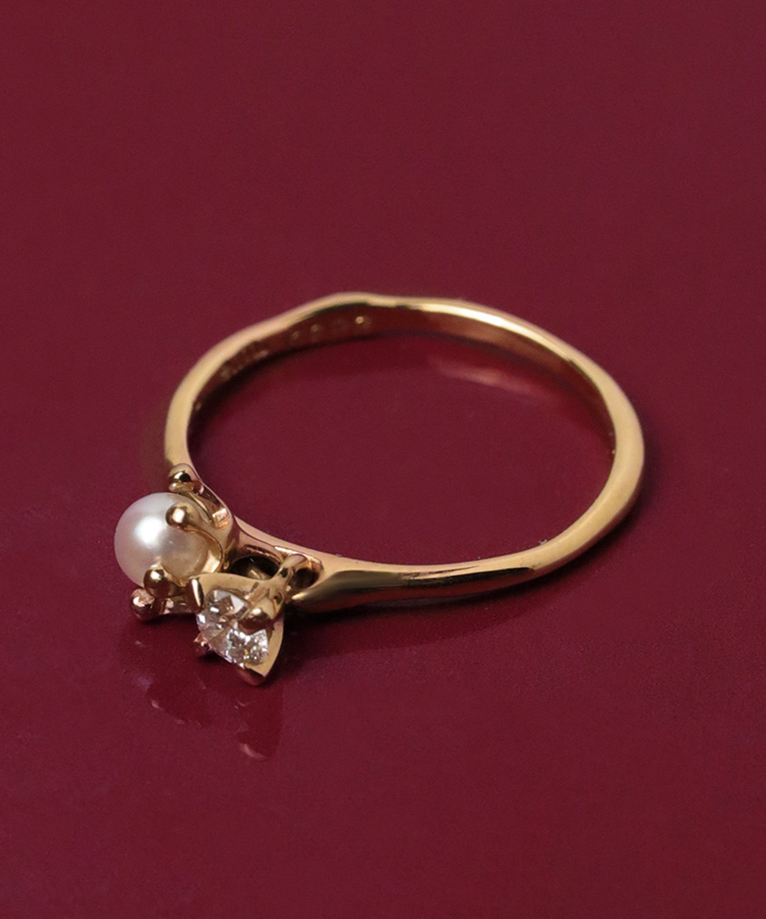 ダイヤモンドとパールが揺れるようにデザインされたリング。たたき加工が施されたアームは柔らかな風合に。