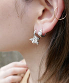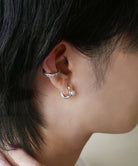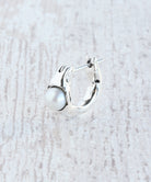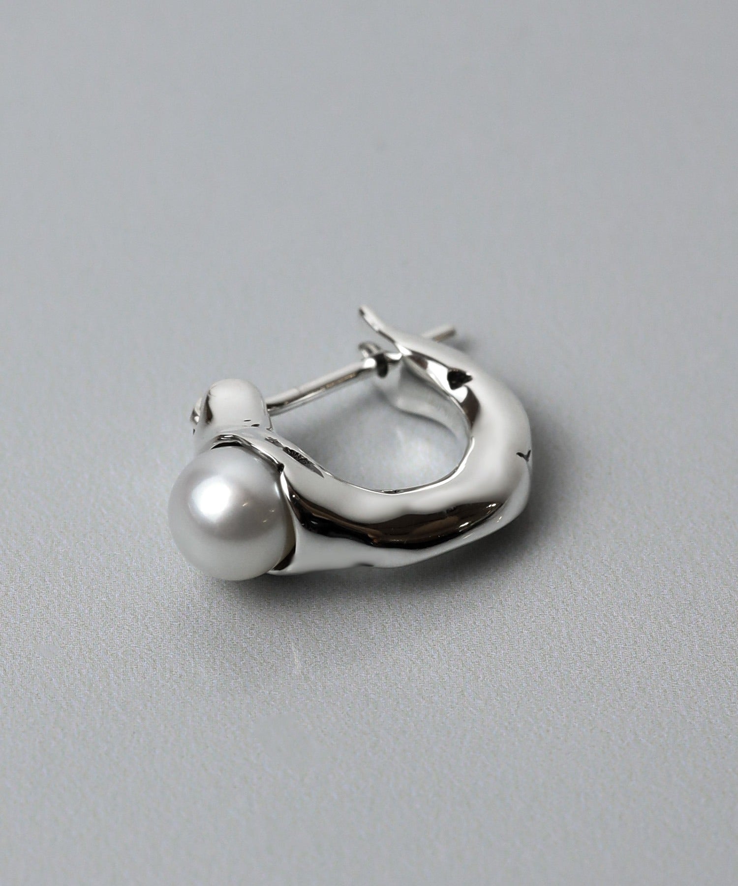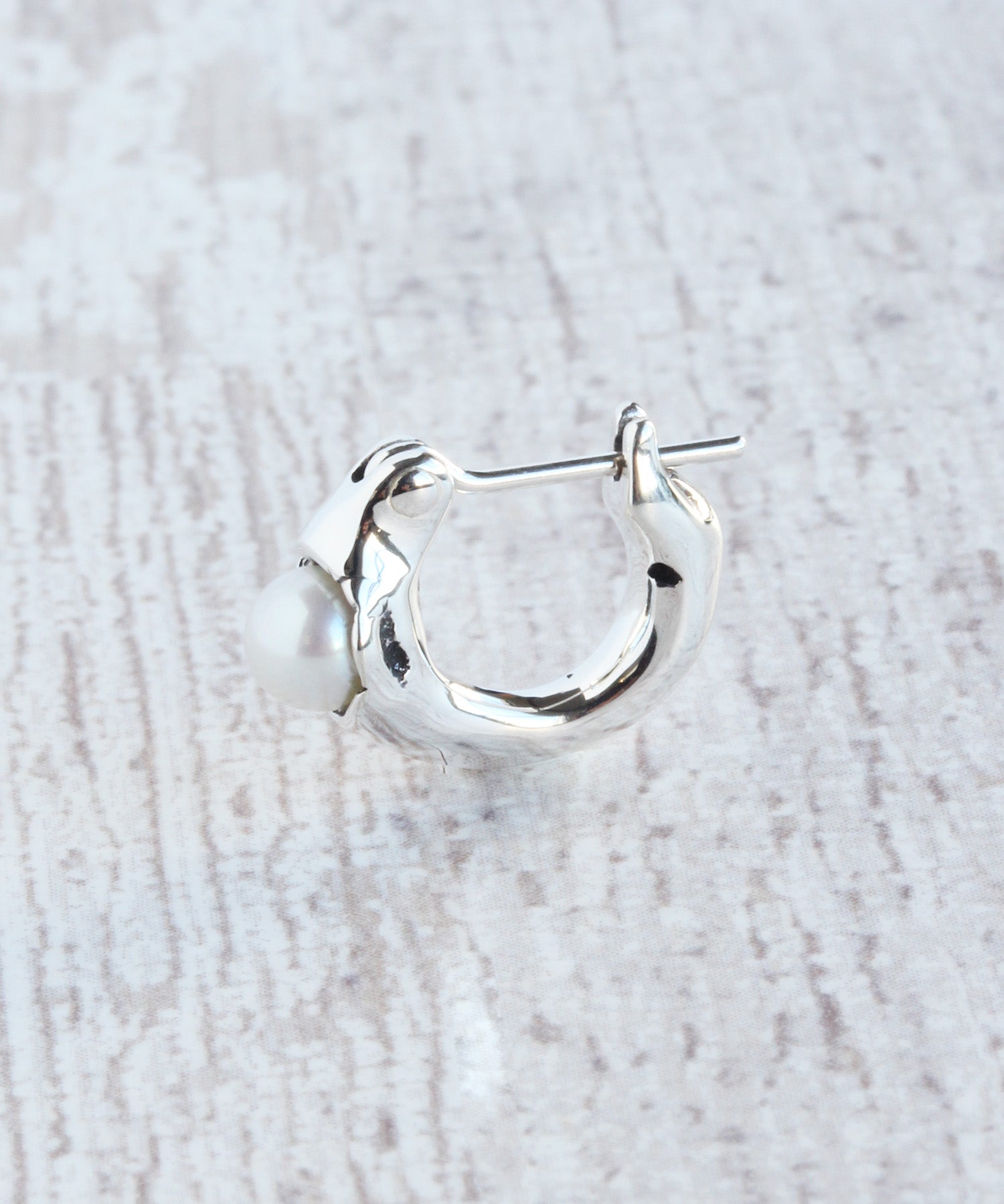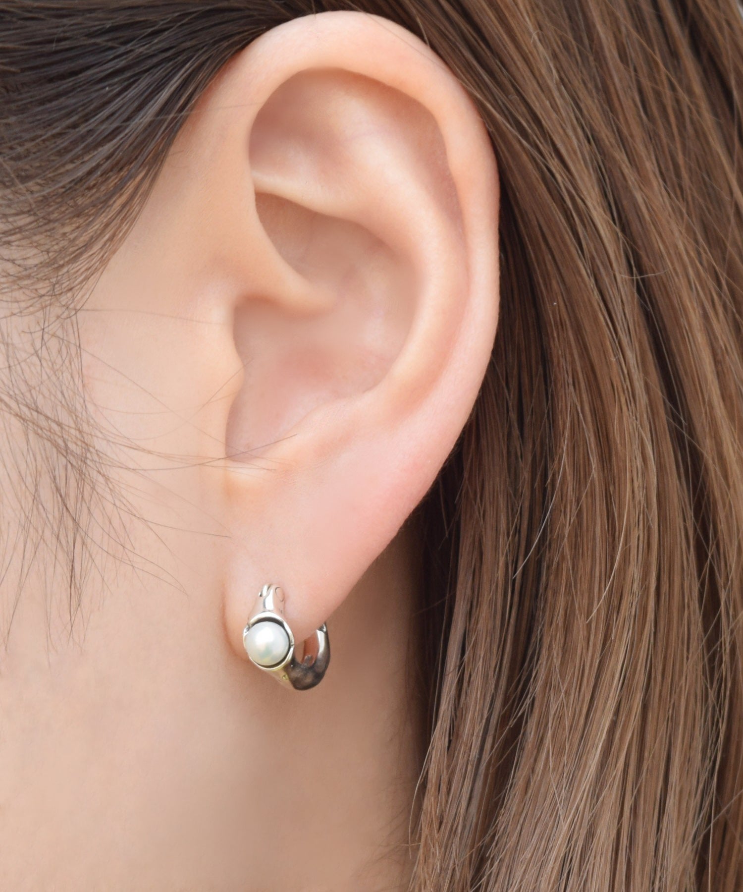 いぶしのかかった太めのアームにパールが埋め込まれたシルバーフープピアス。