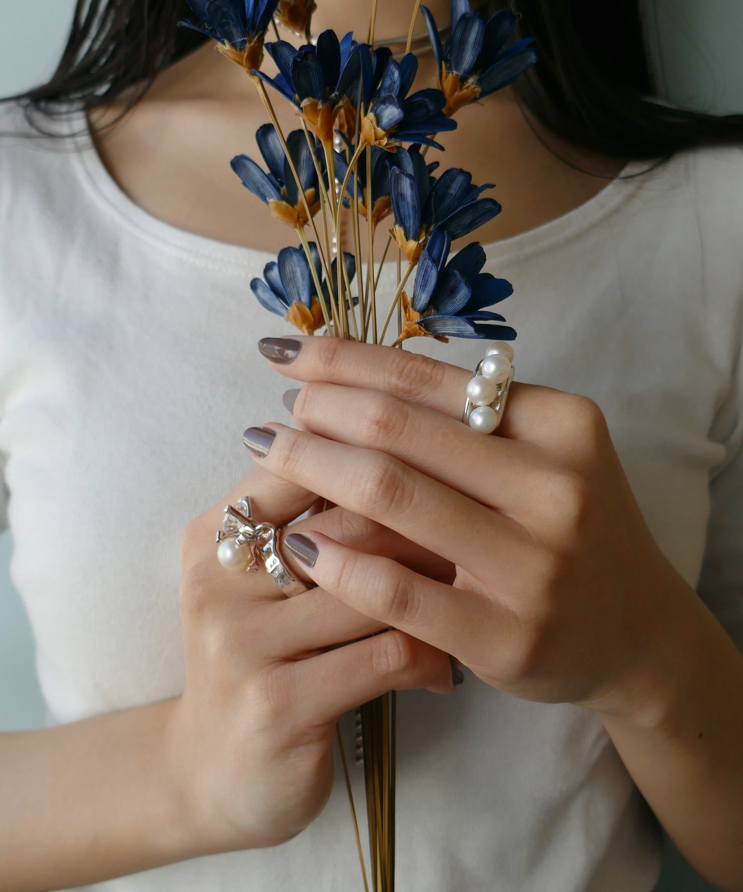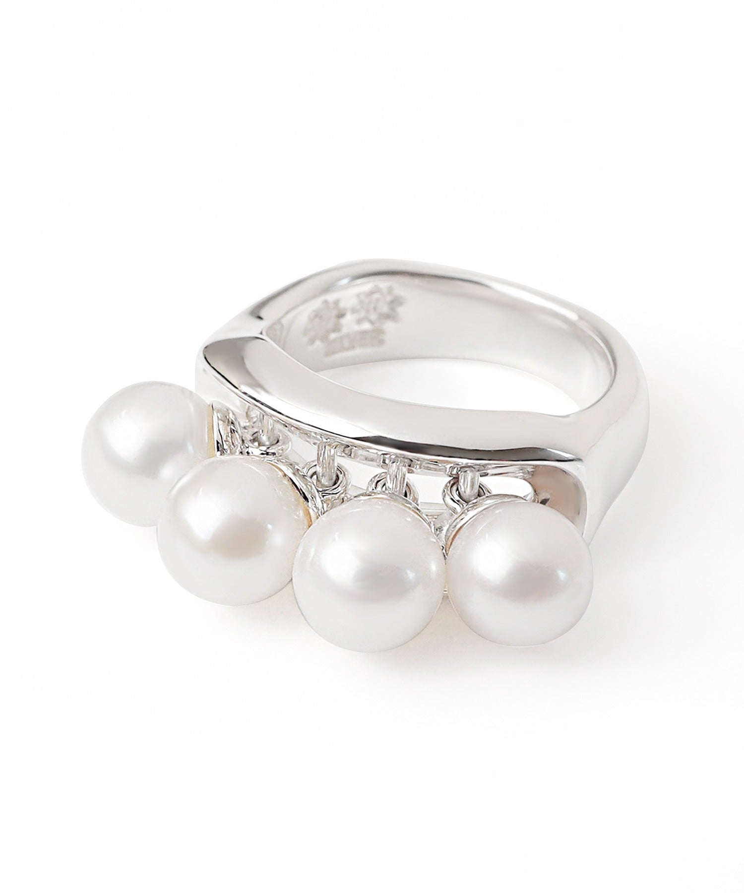 デザインの主役であるトップに並べられた4石の大粒の淡水パールは、横にカタカタと揺れる仕組み。<br>数ミリ単位で計算して組み上げられた構造的なデザインです。<br>