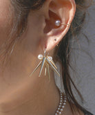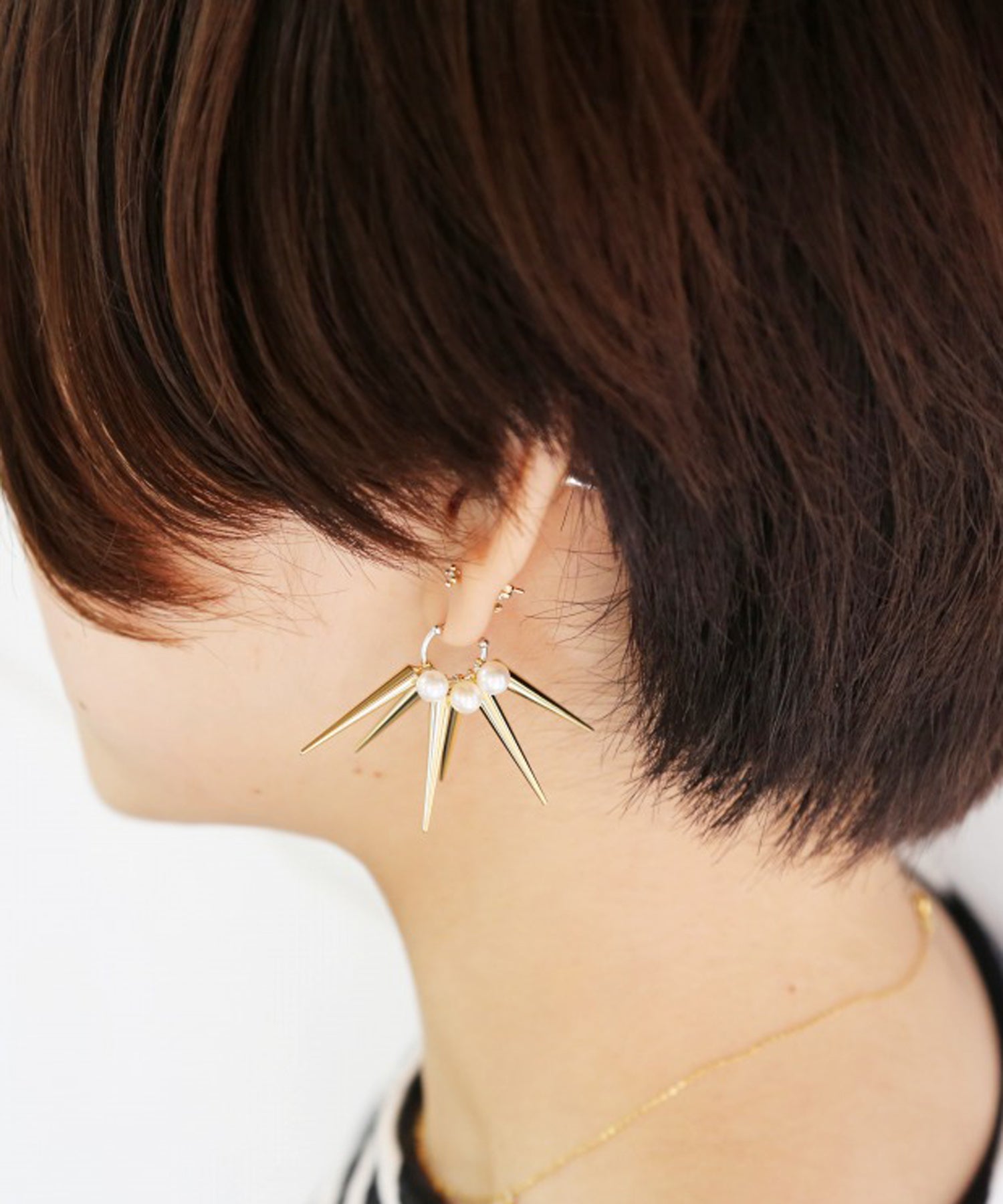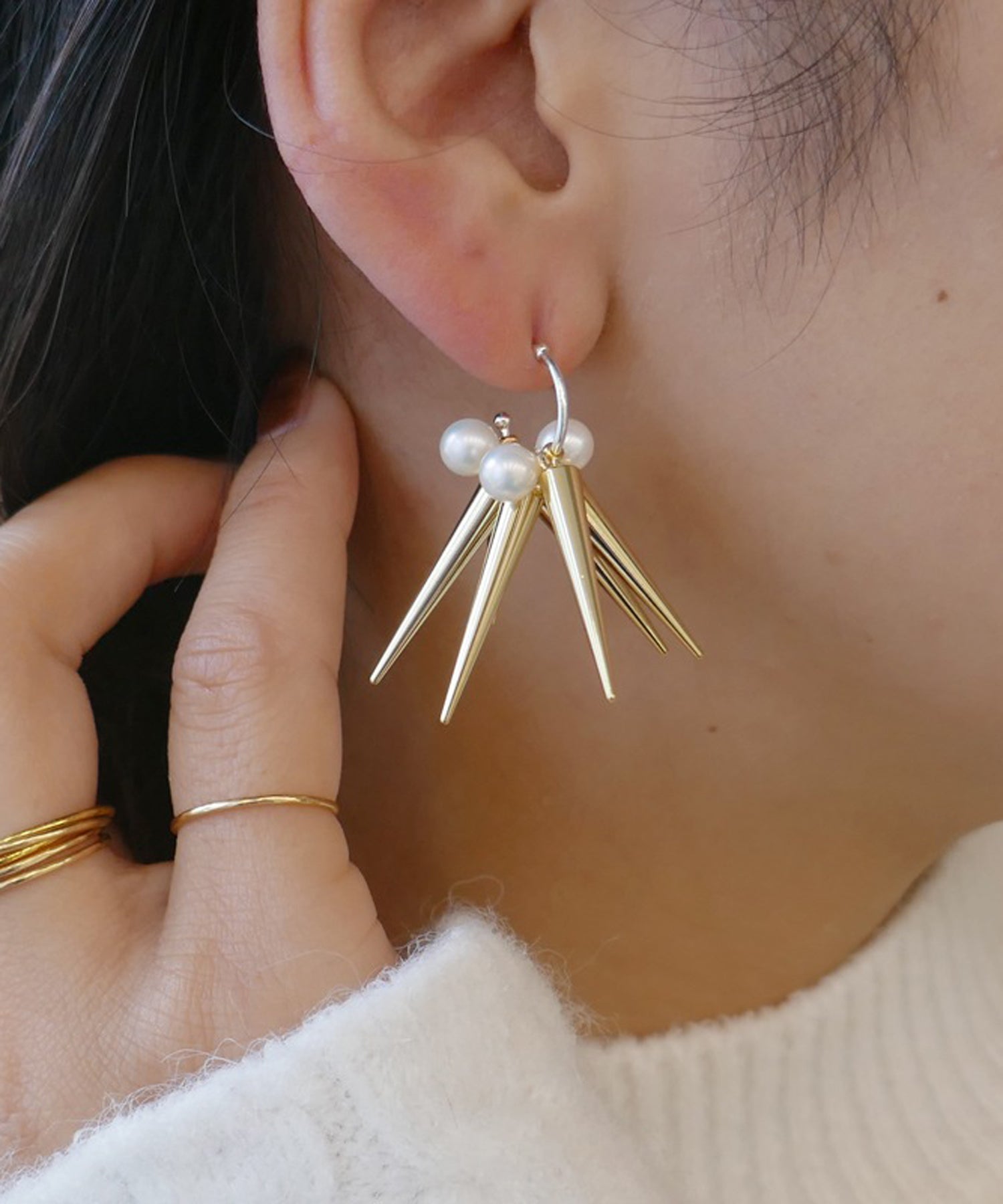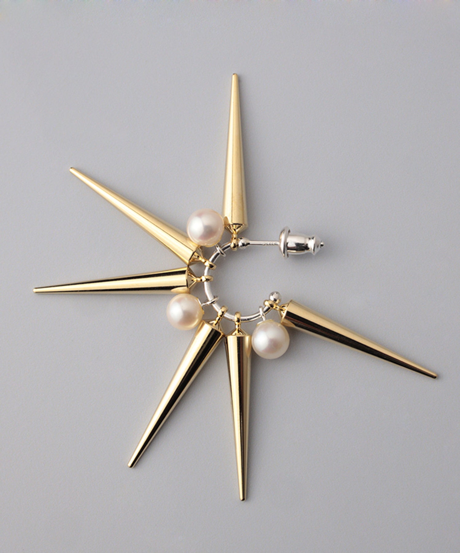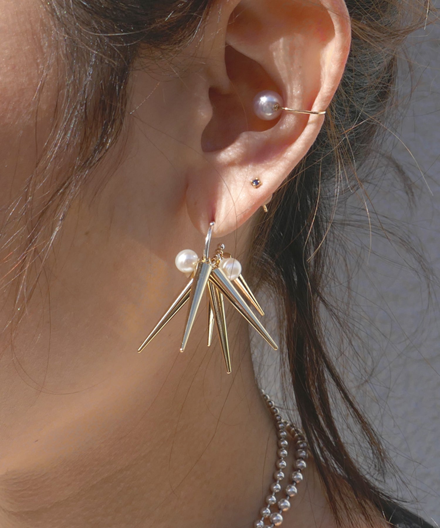 スタッズが揺れるフープピアスにパールがあしらわれたデザイン。
