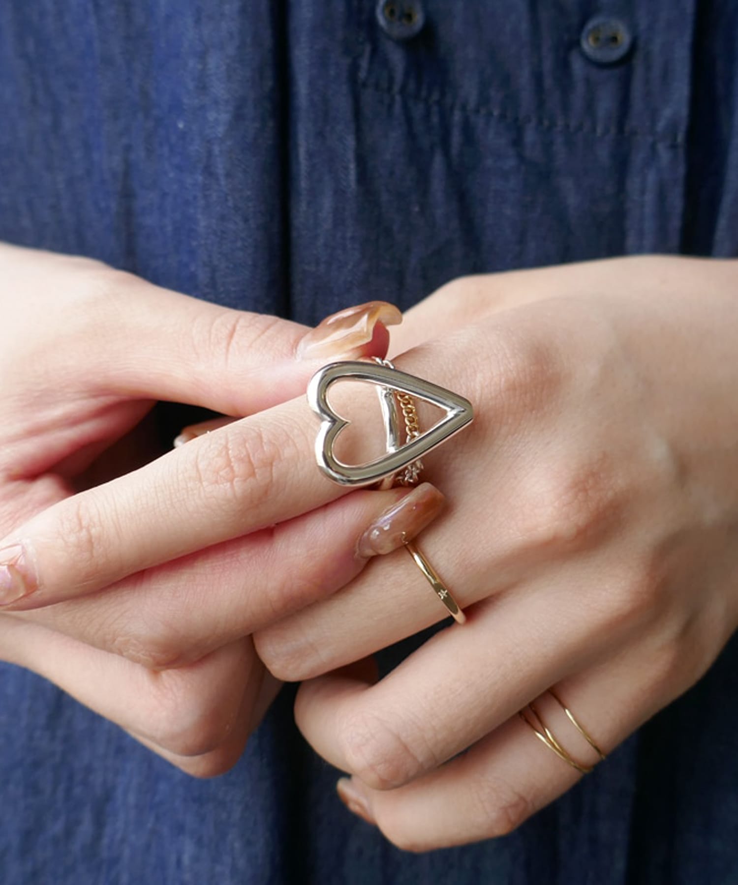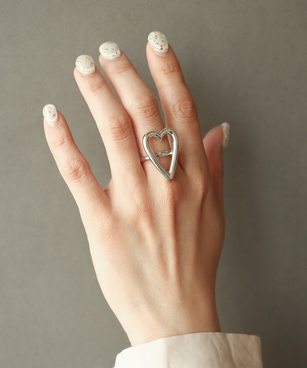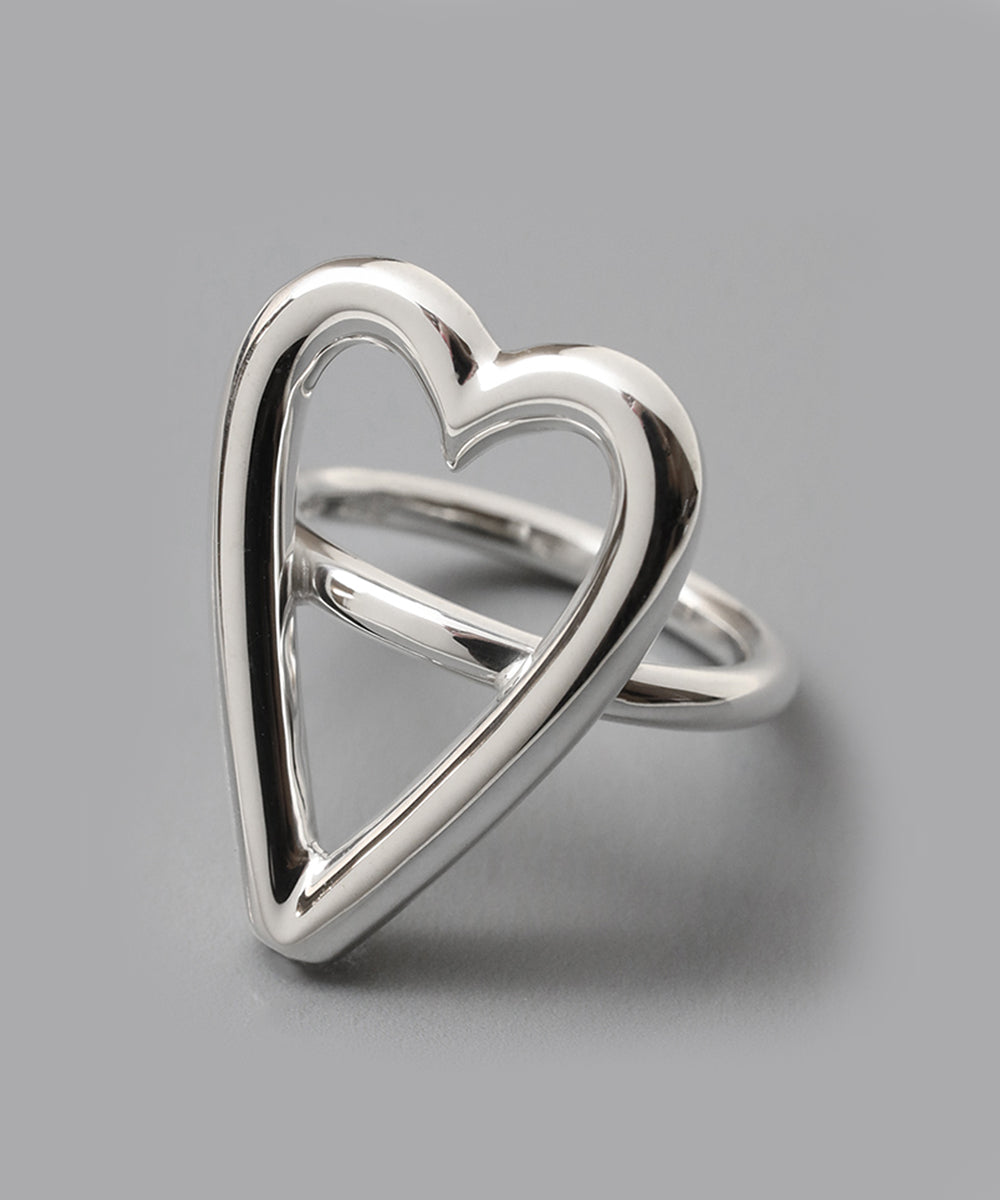 シンプルでありながらシンボリックなデザインは、ハートを縦長のすっきりとしたフォルムとシルバーのマテリアルで仕立ることでポップなニュアンスは残しつつも甘すぎない印象に。