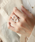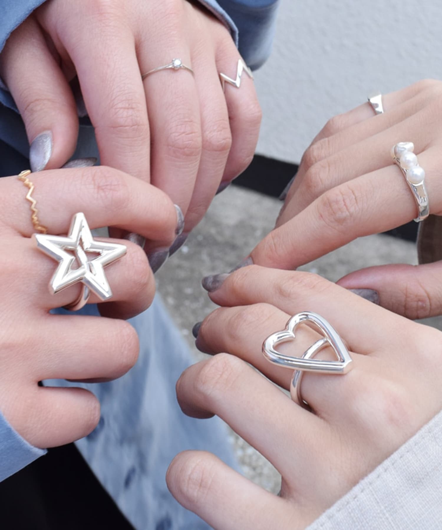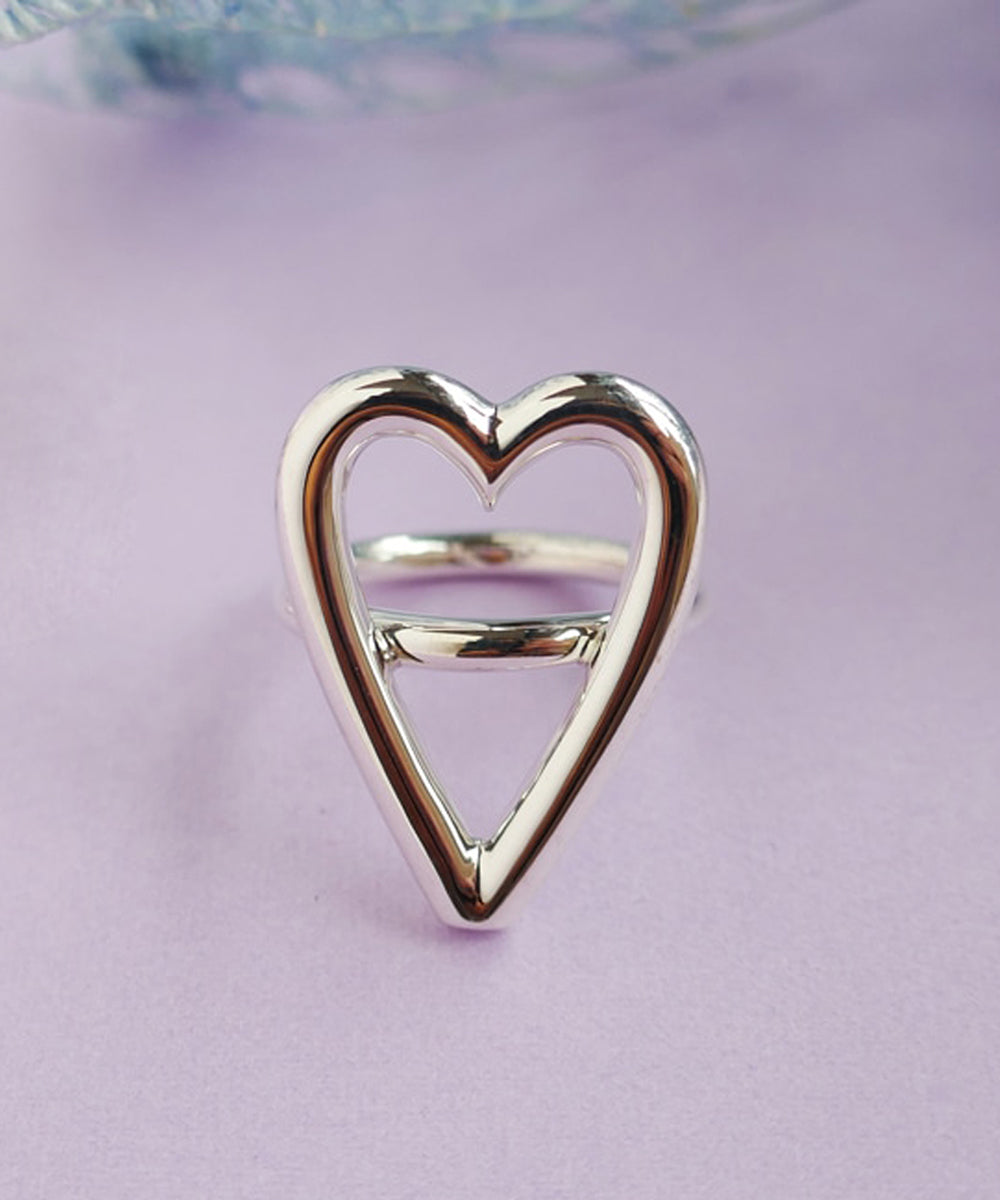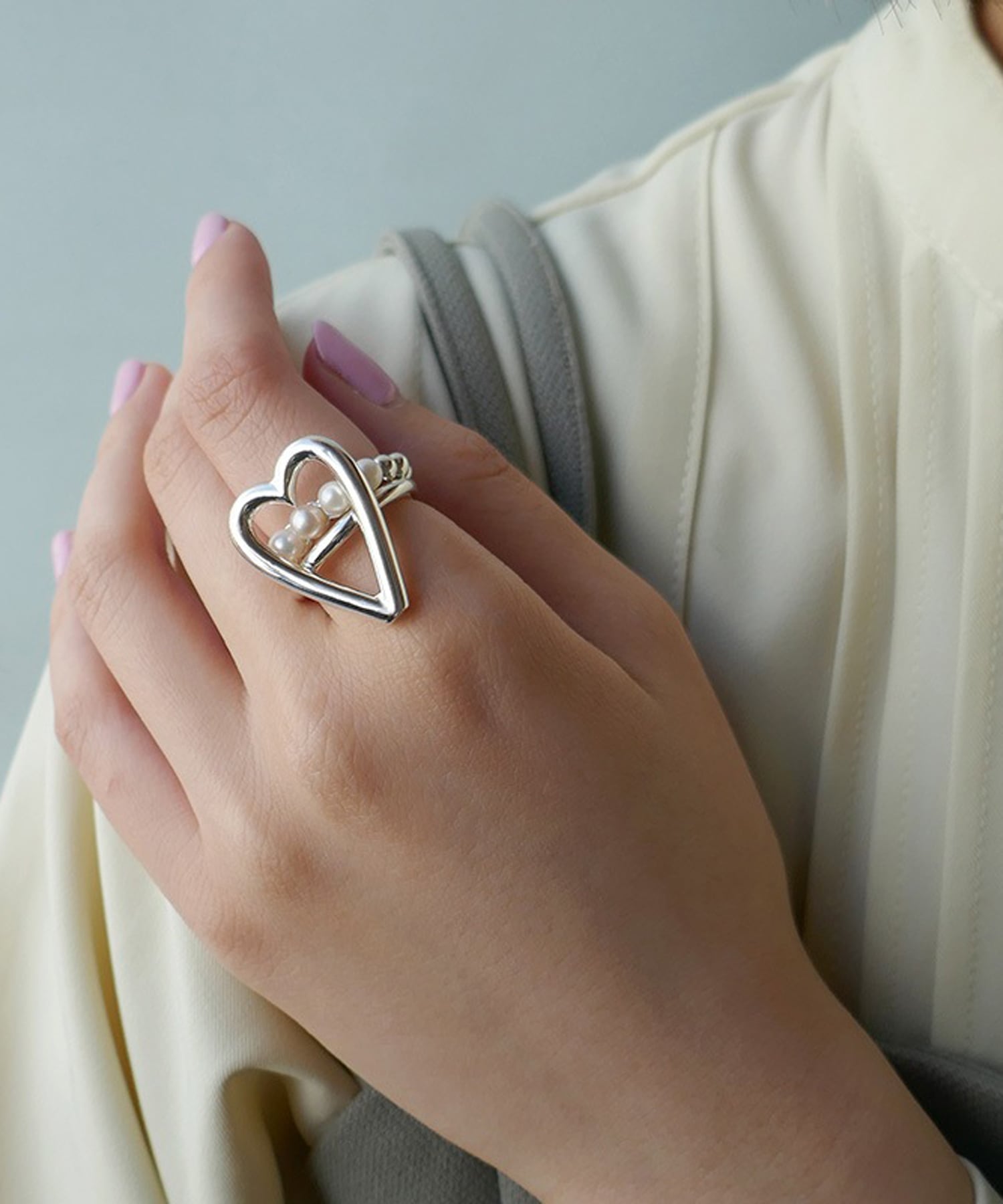 シンプルでありながらシンボリックなデザインは、ハートを縦長のすっきりとしたフォルムとシルバーのマテリアルで仕立ることでポップなニュアンスは残しつつも甘すぎない印象に。