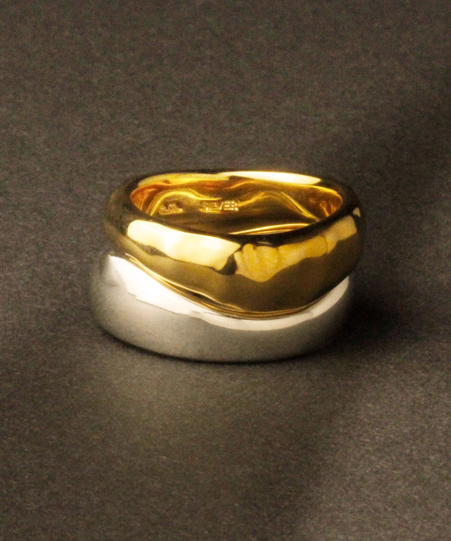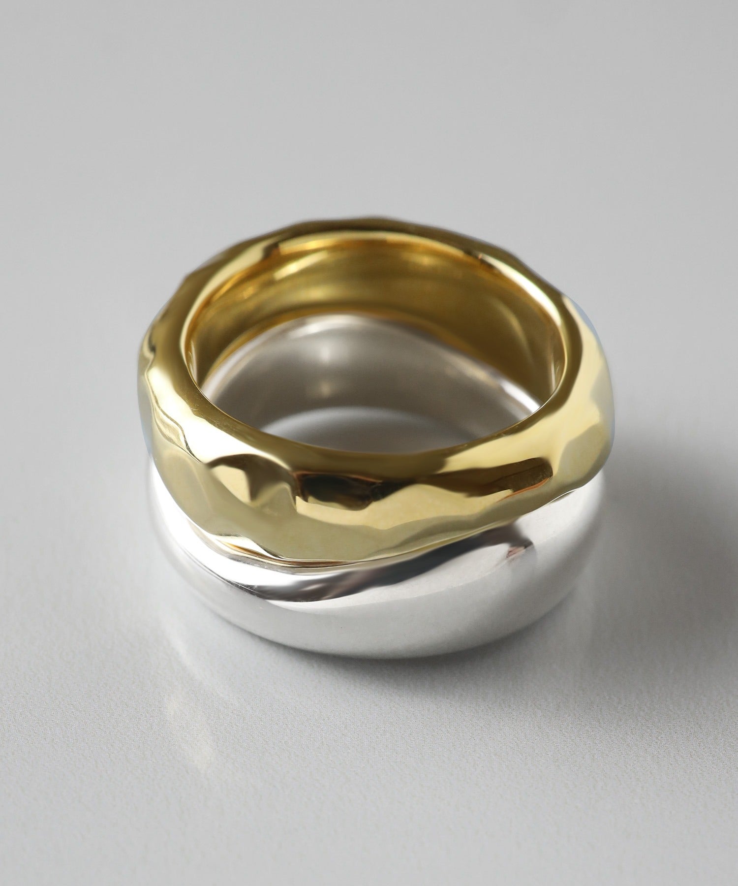 つるんとしたシルバーとテクスチャーのあるゴールドの2本セットリング。