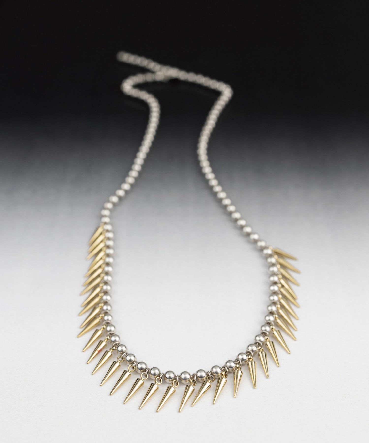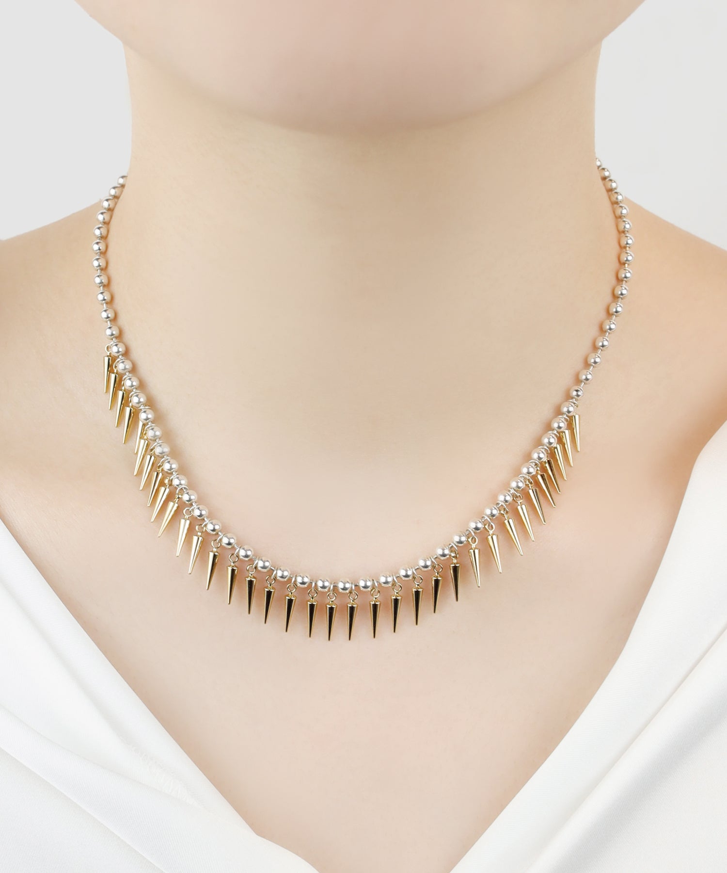 シルバーのボールチェーンに、ゴールドカラーのスパイクスタッズを組み合わせたネックレス。大胆でインパクトフルなデザインながら、真鍮素材で仕立てたスタッズは軽やかな着け心地。