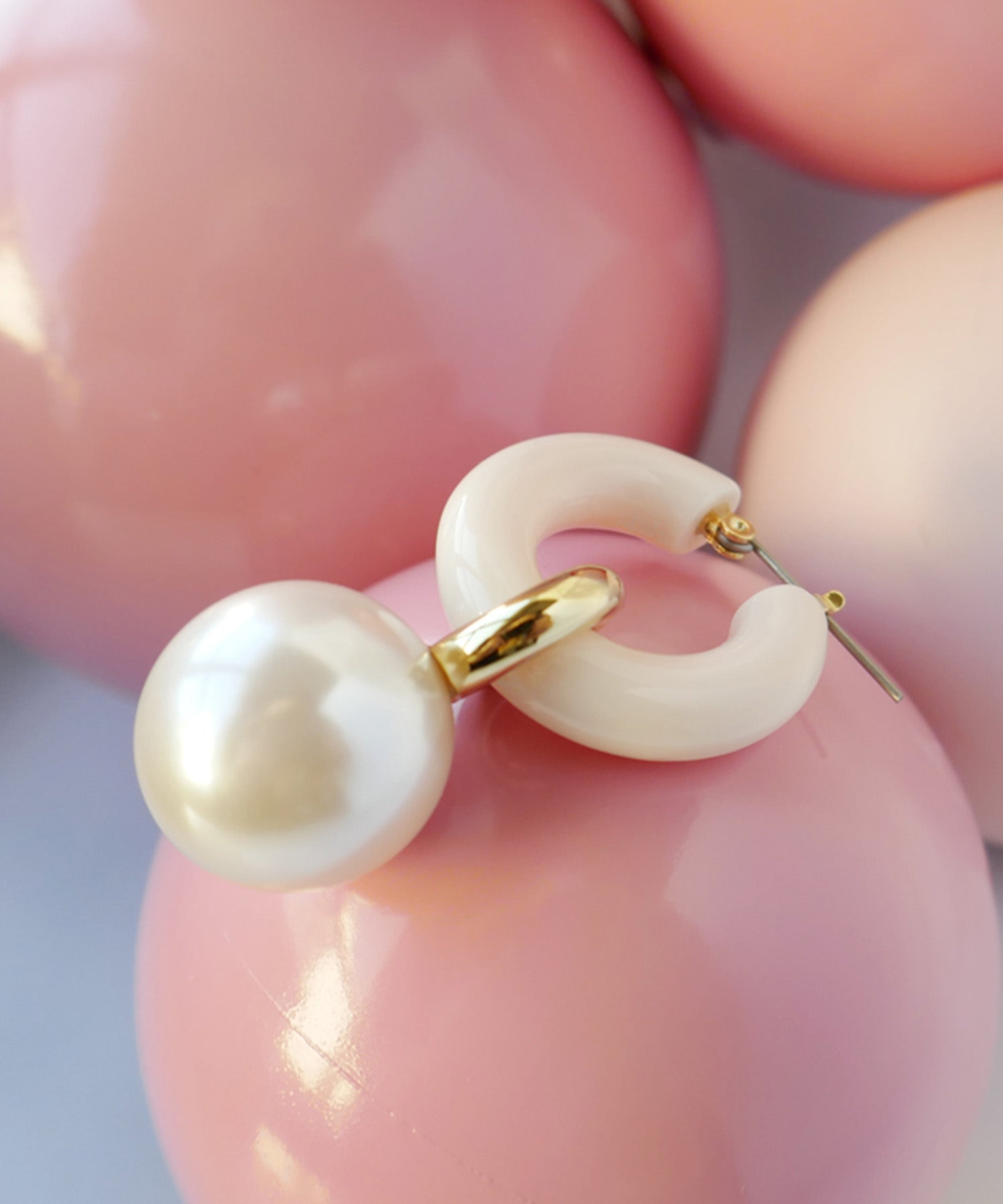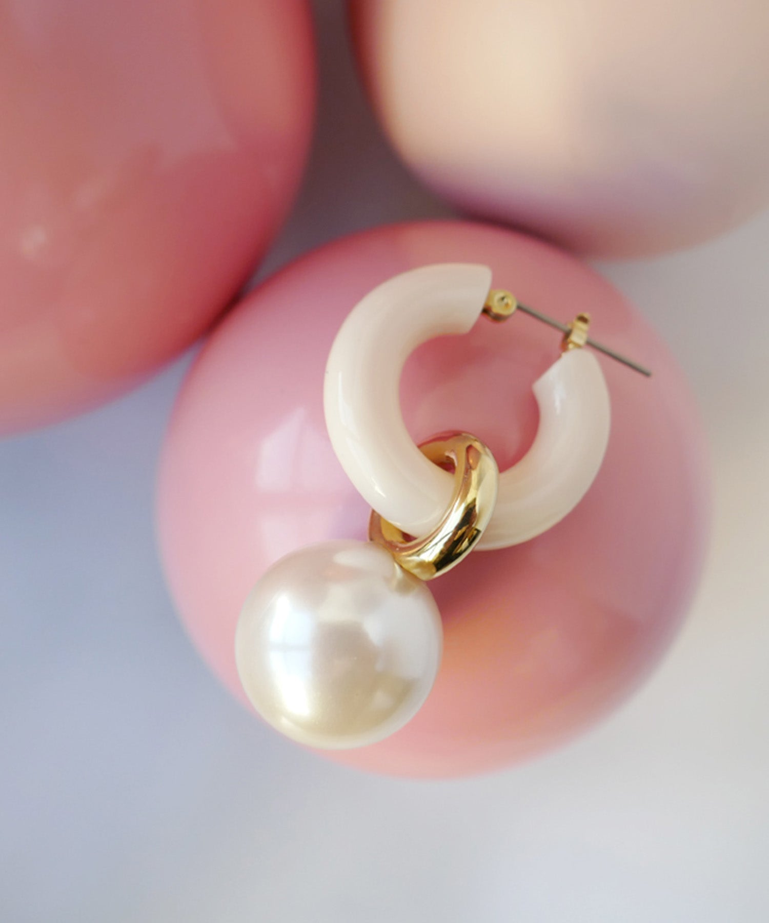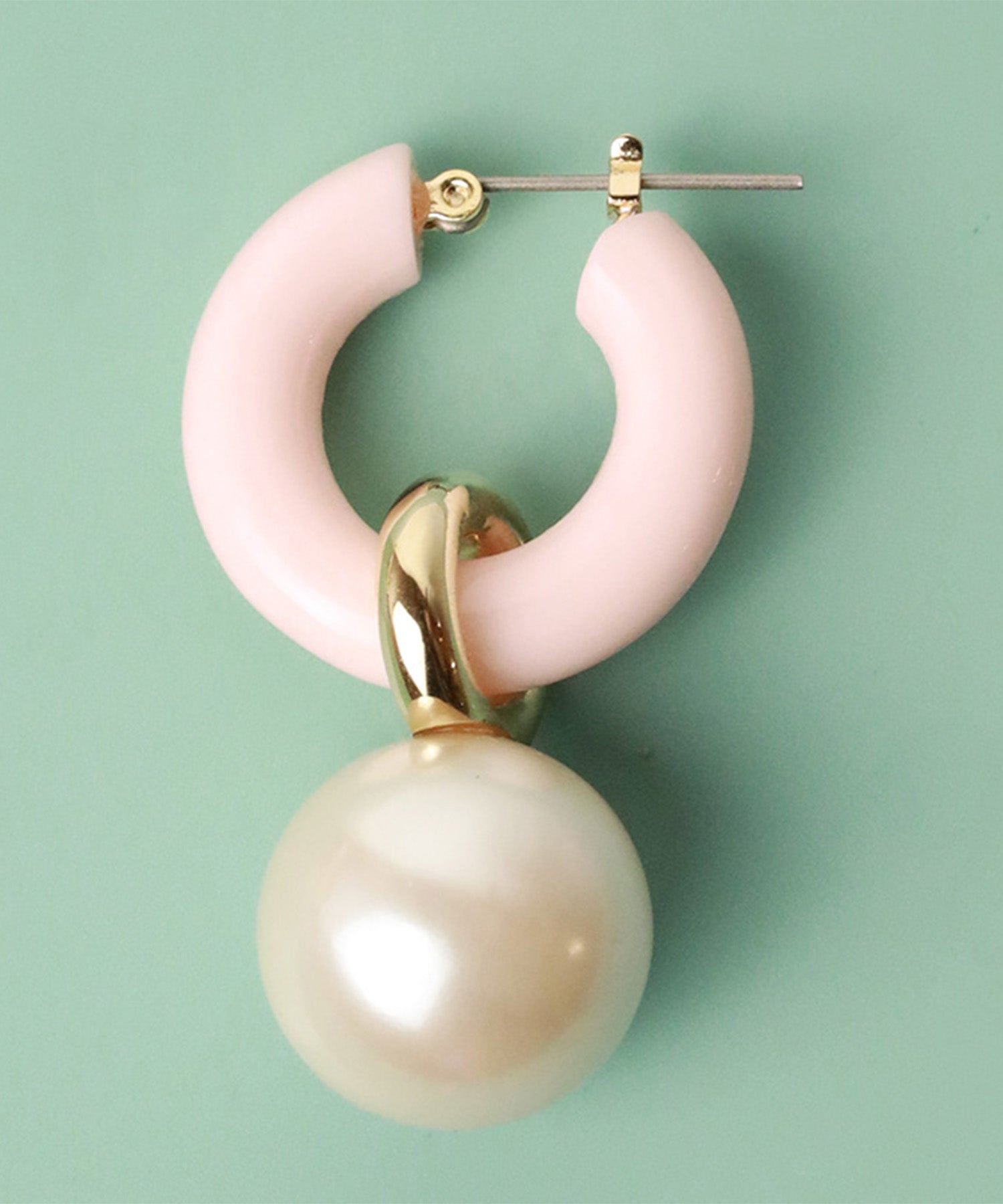 目を惹くサイズのパールが揺れるピアス。ピンクとゴールドのバイカラーが愛らしさに