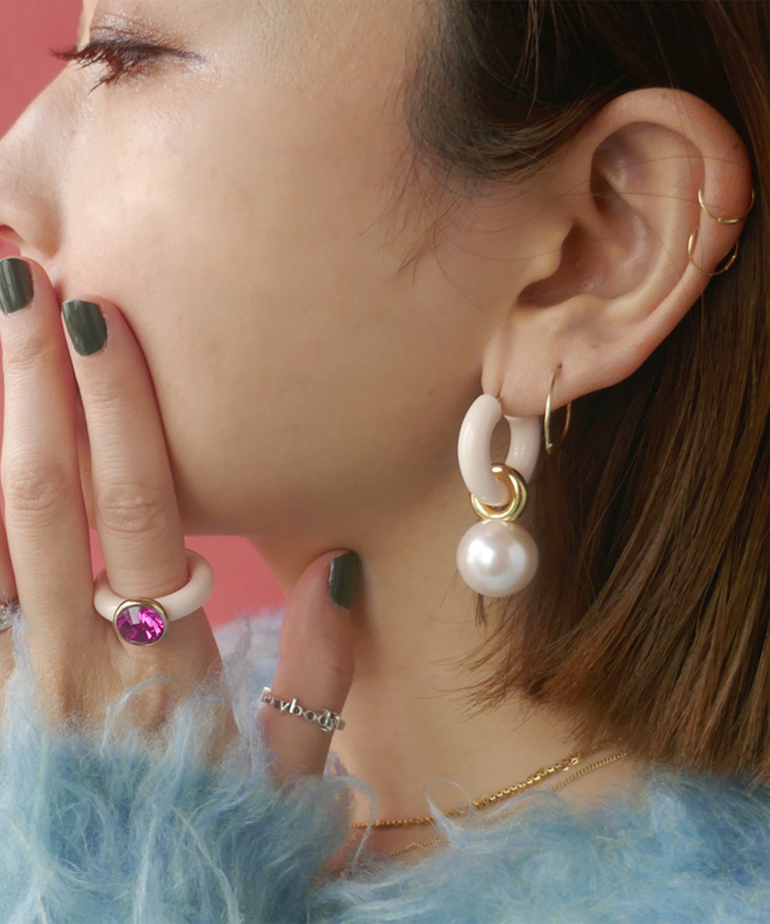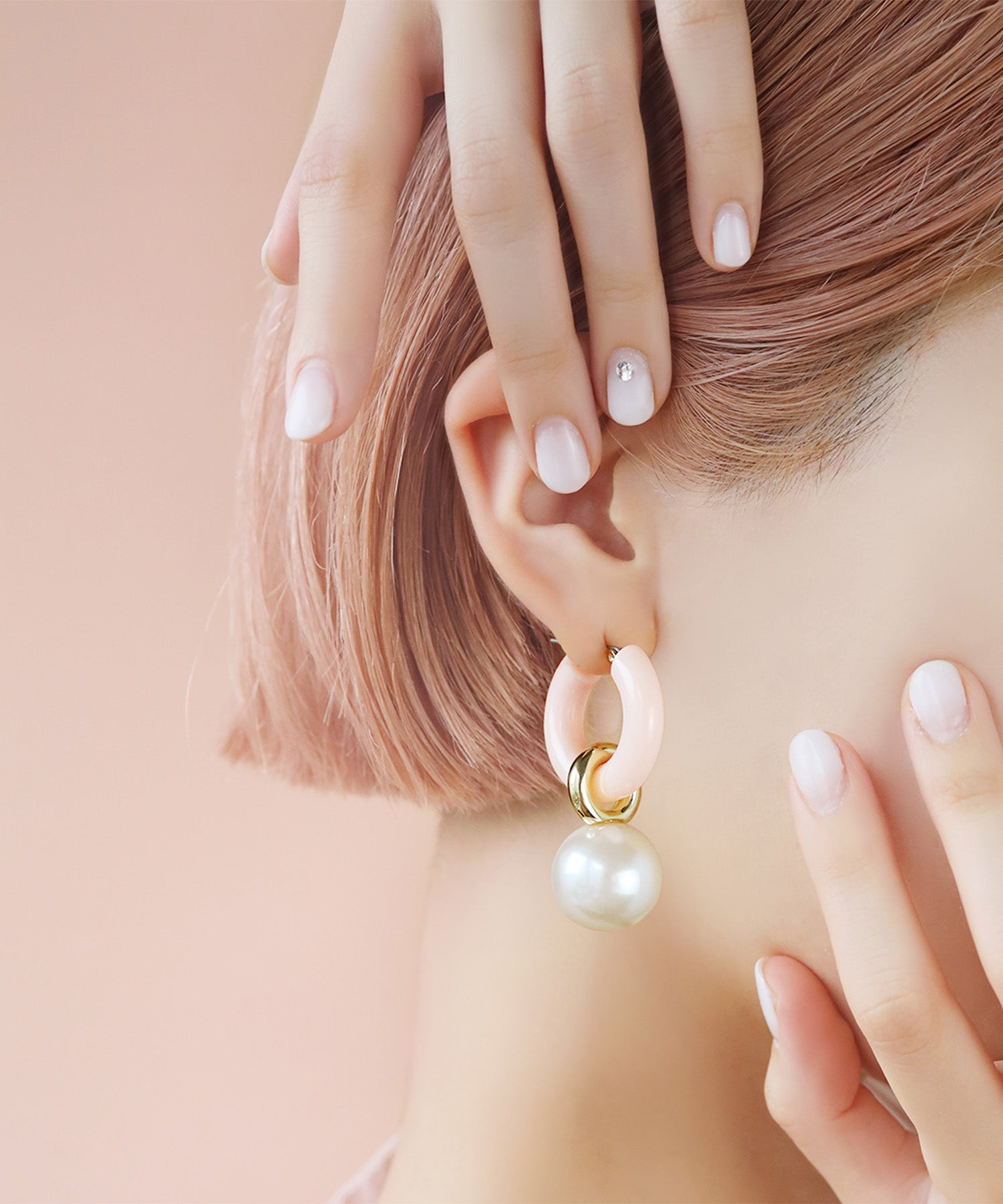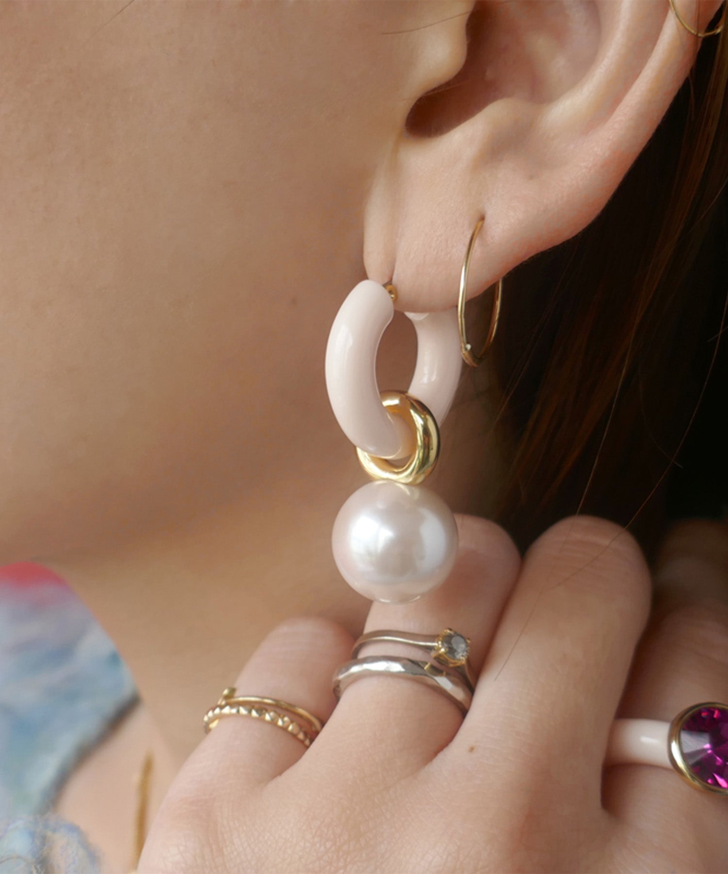 目を惹くサイズのパールが揺れるピアス。ピンクとゴールドのバイカラーが愛らしさに
