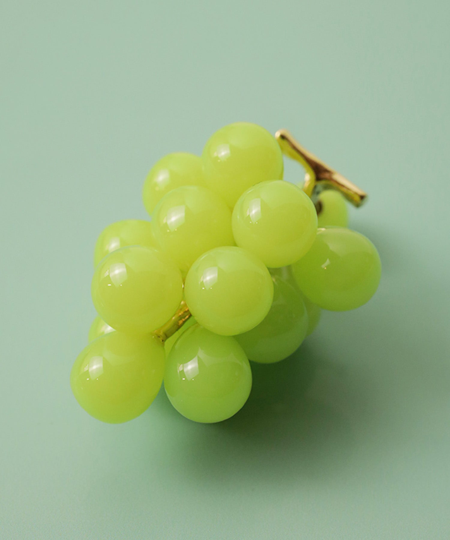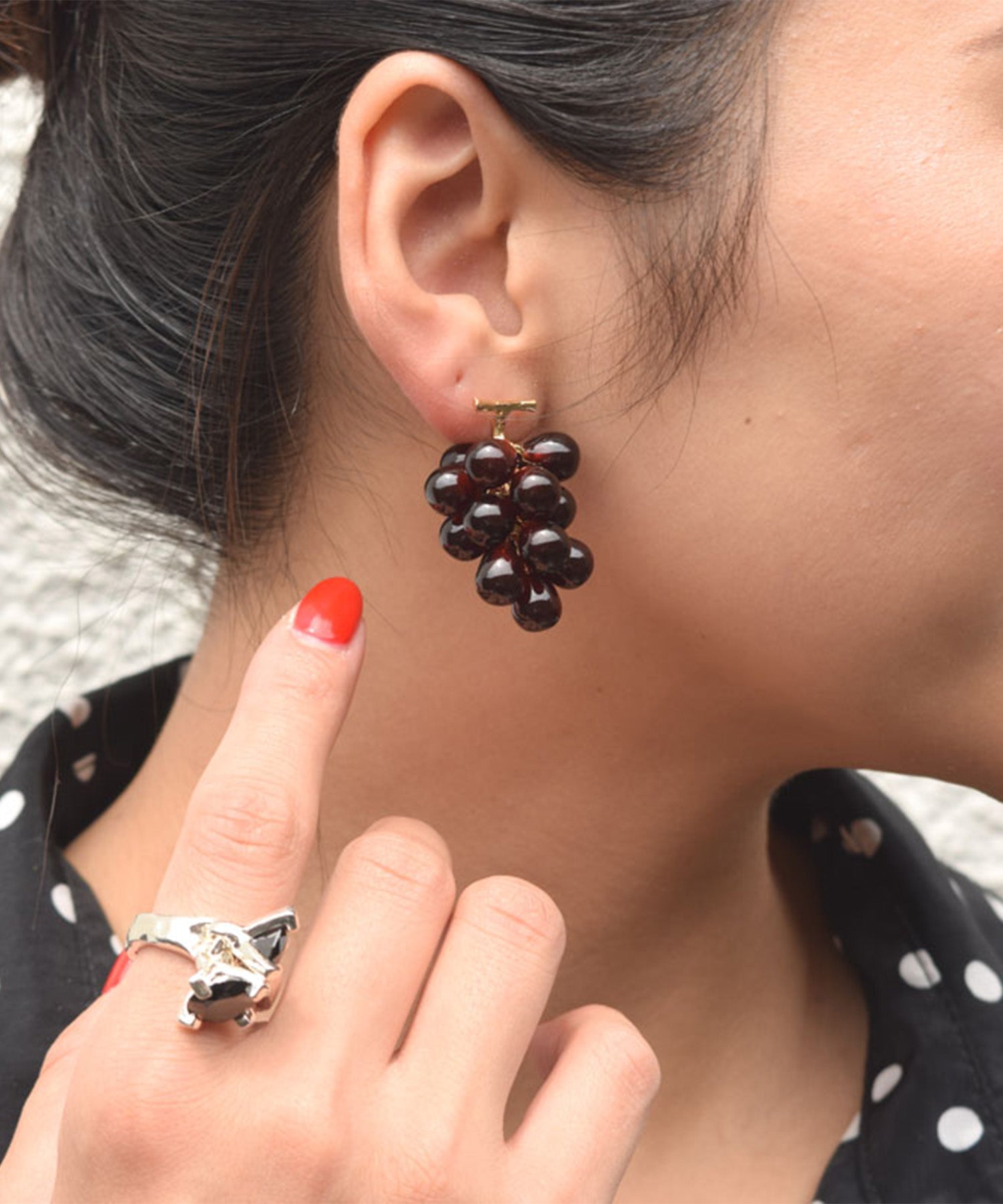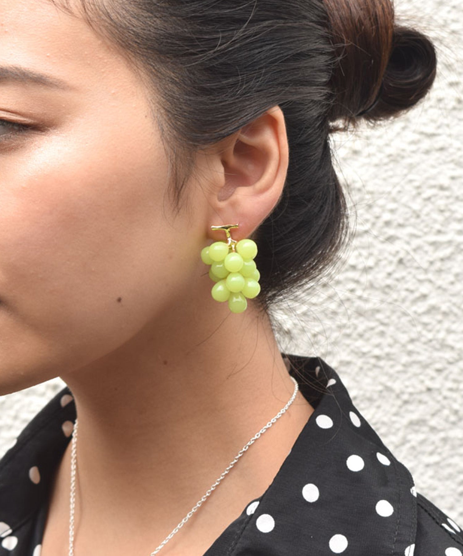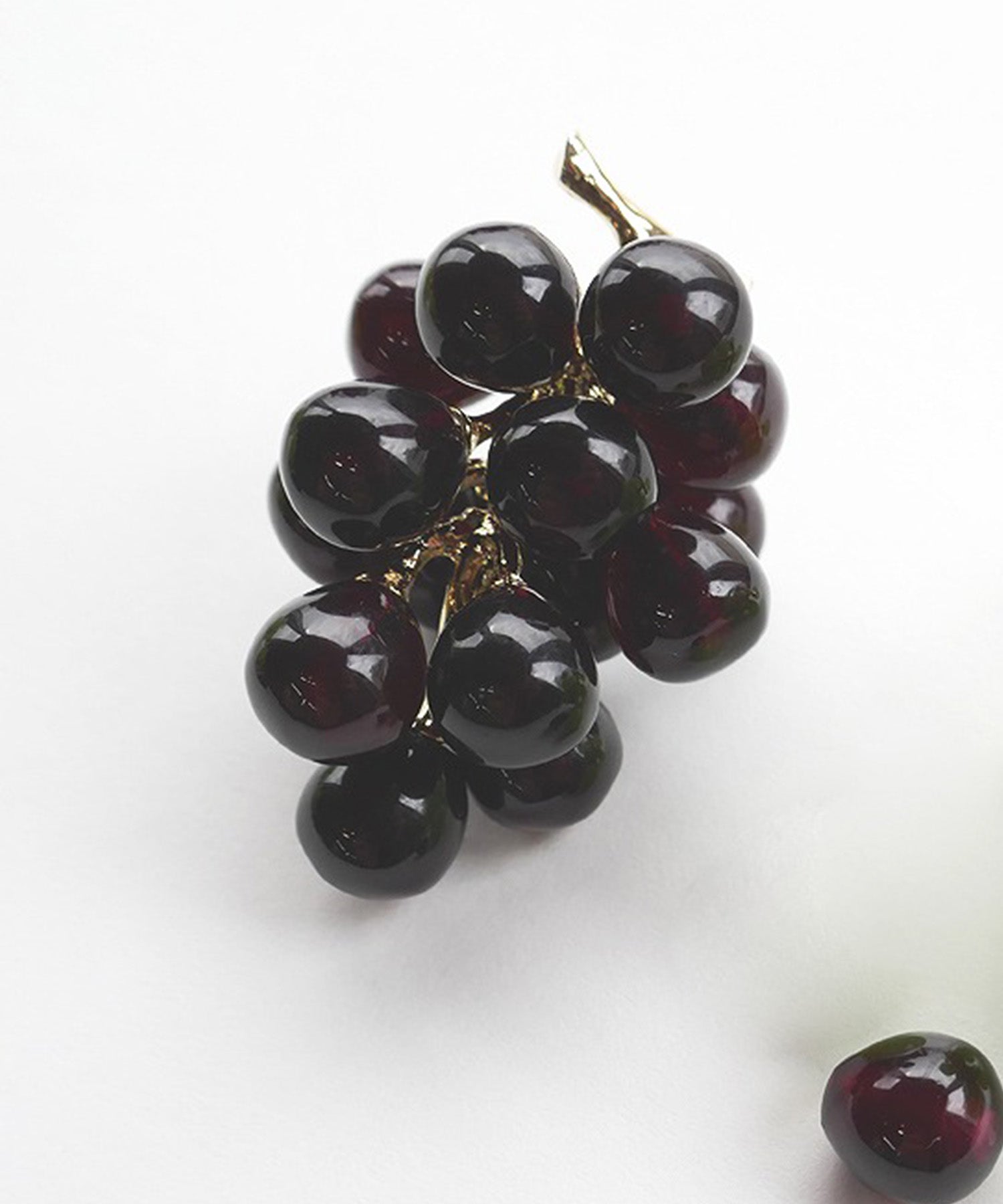 LOVE BY e.mのLOVE fruit!シリーズ。本物そっくりのグレープとマスカットのピアスは、実が1粒キャッチになっています。