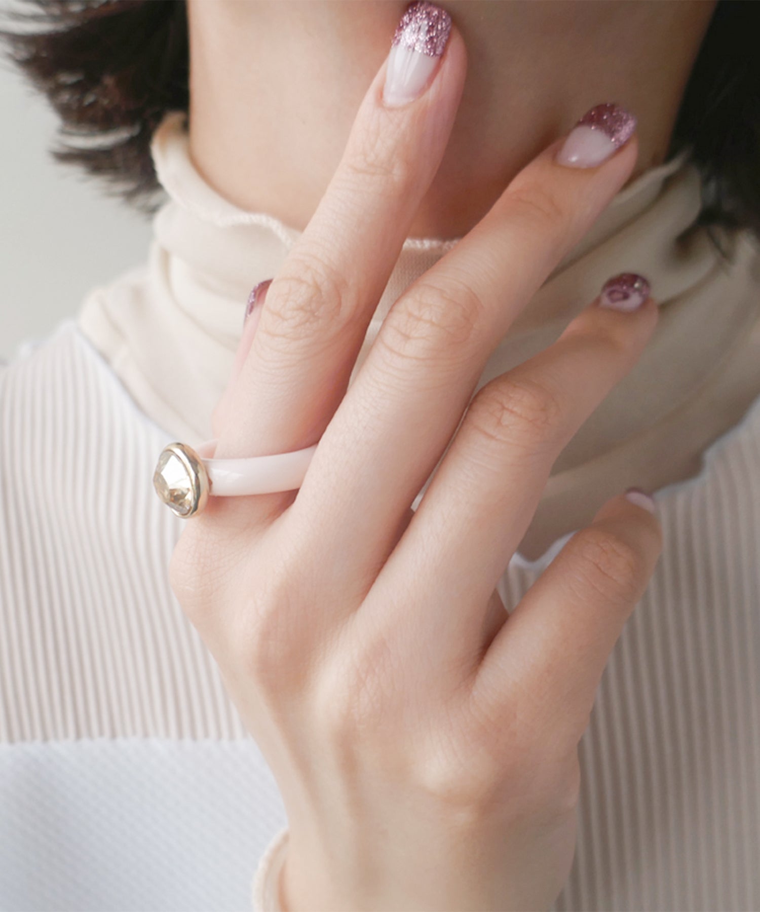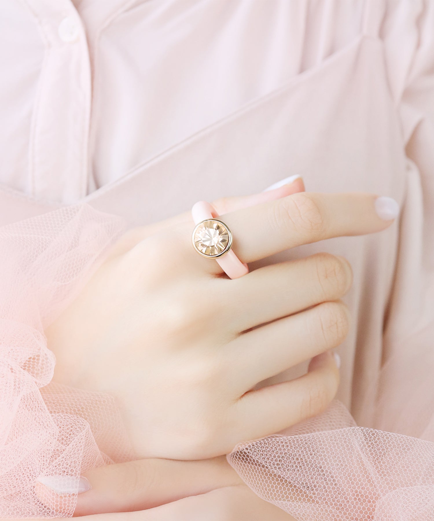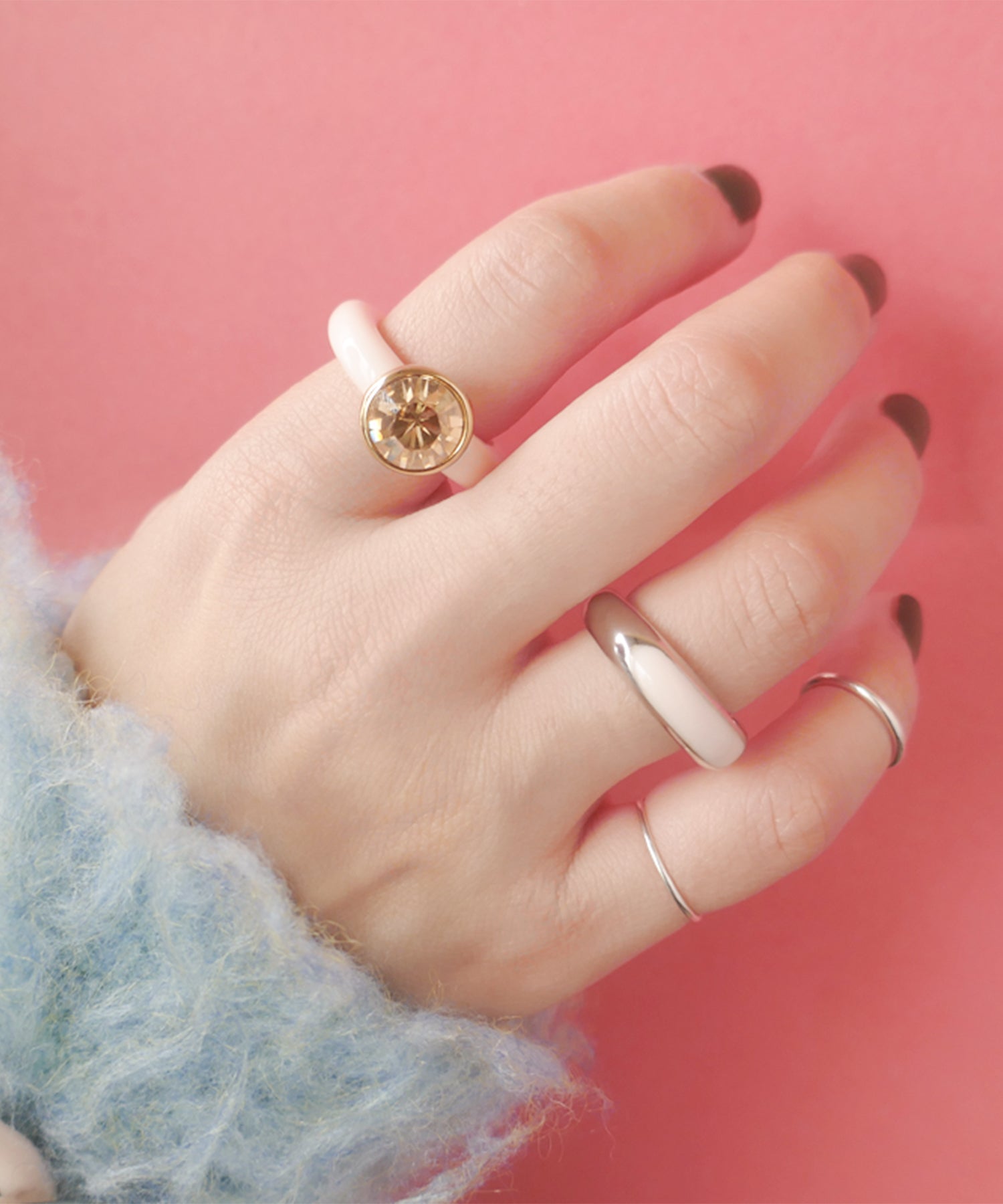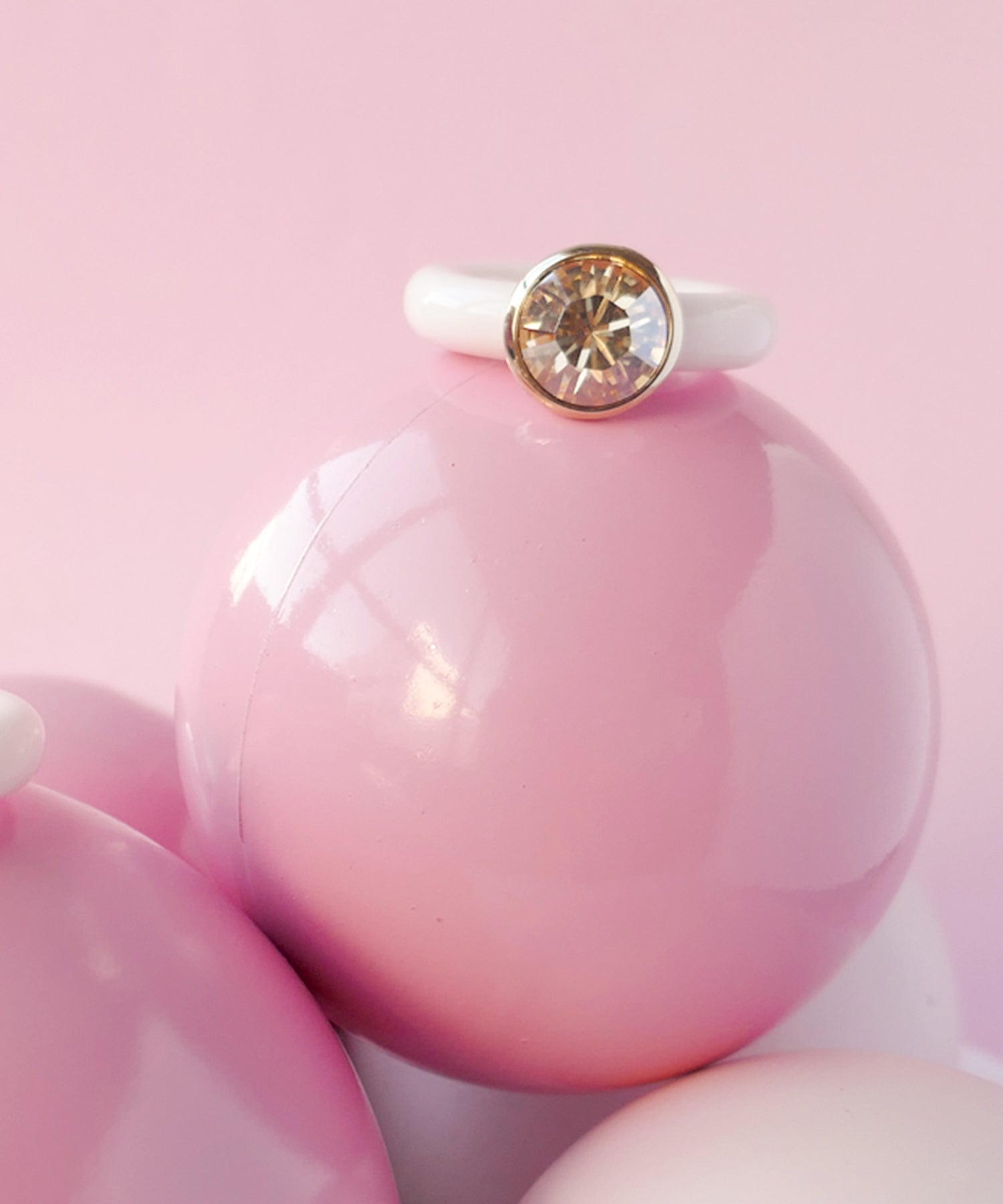 自然と視線が集まるウィットなアイディアが愛らしいリング。リングのアーム部分が丸いので