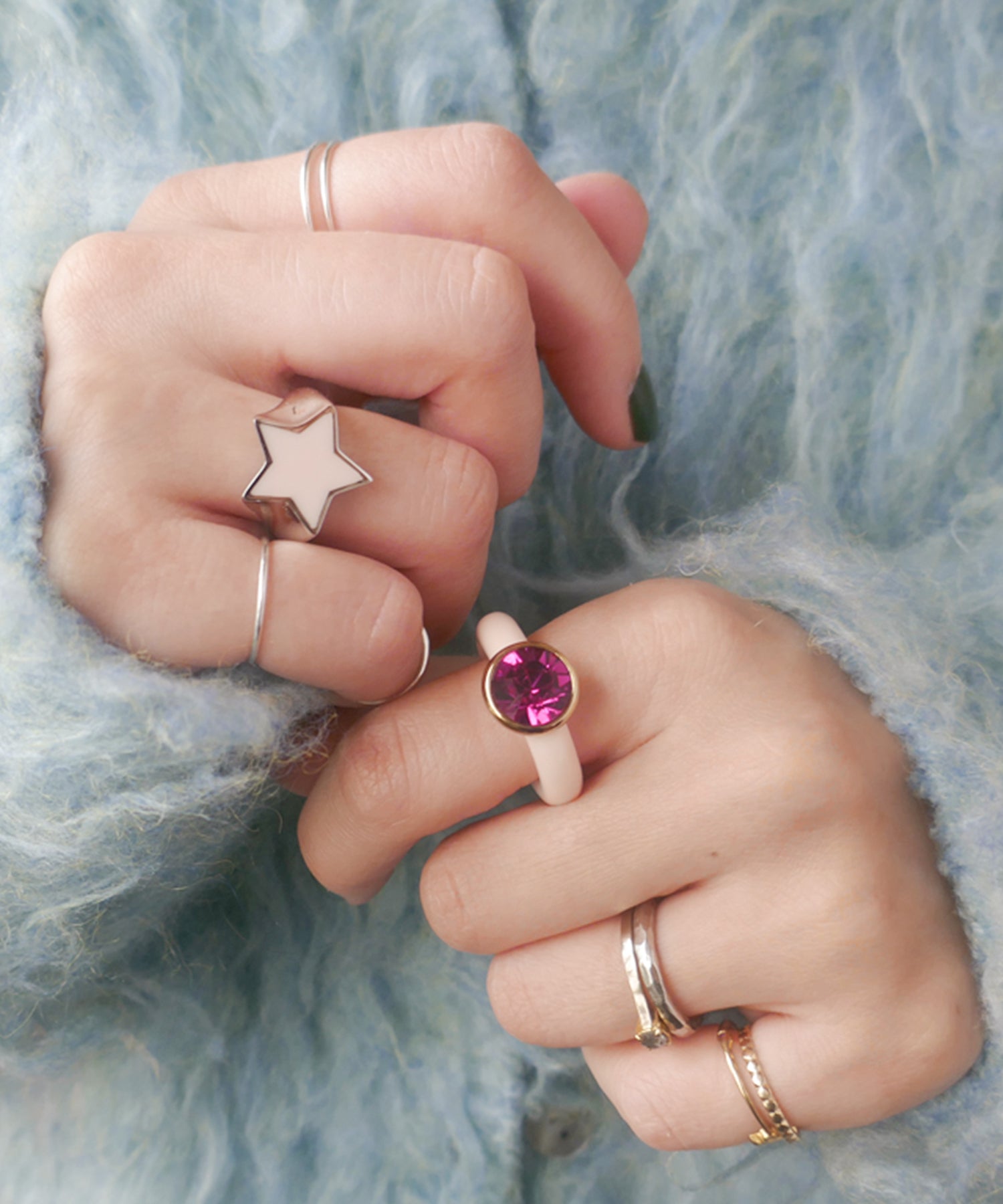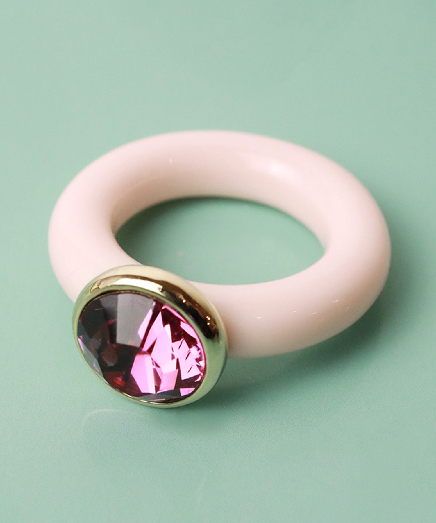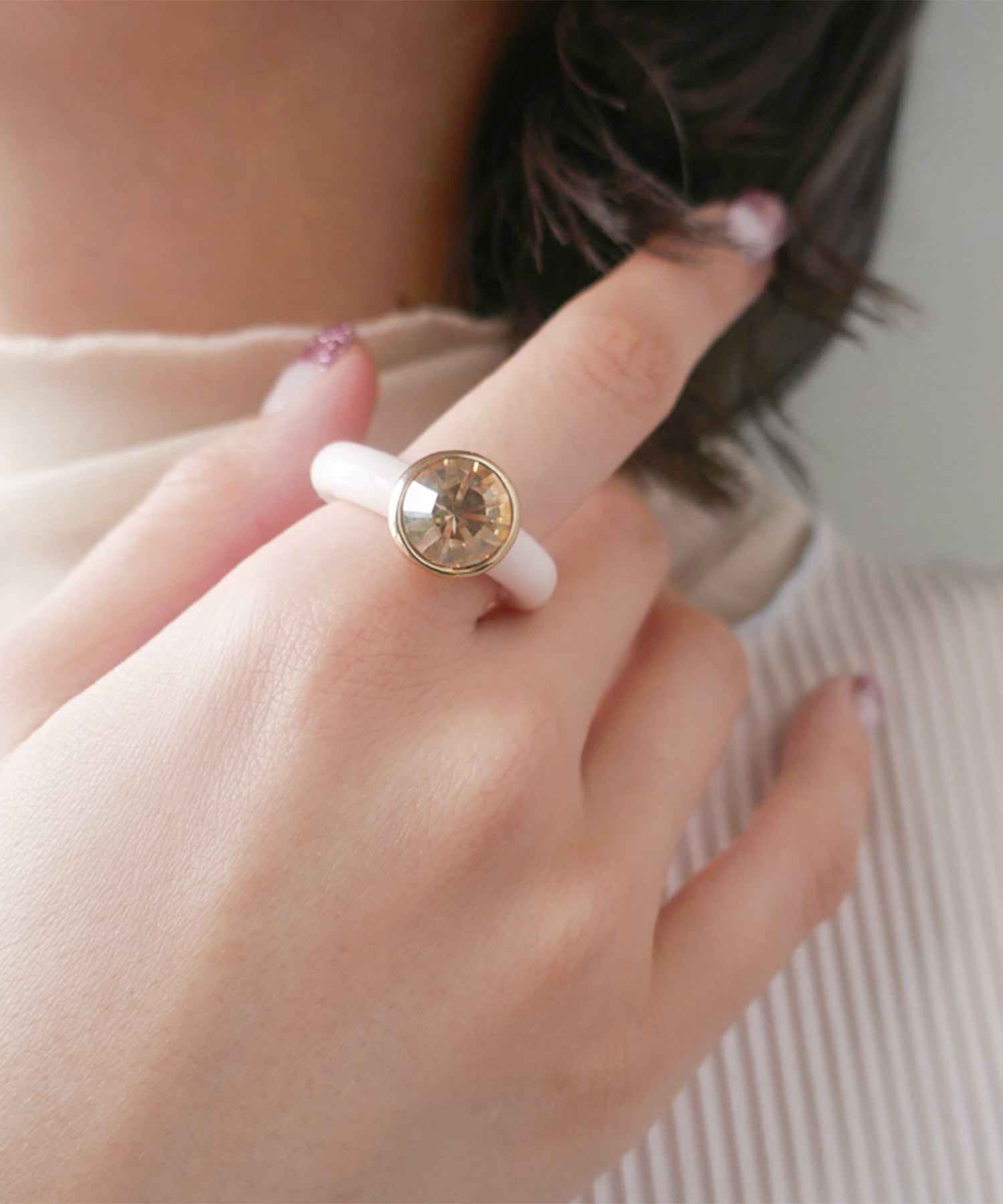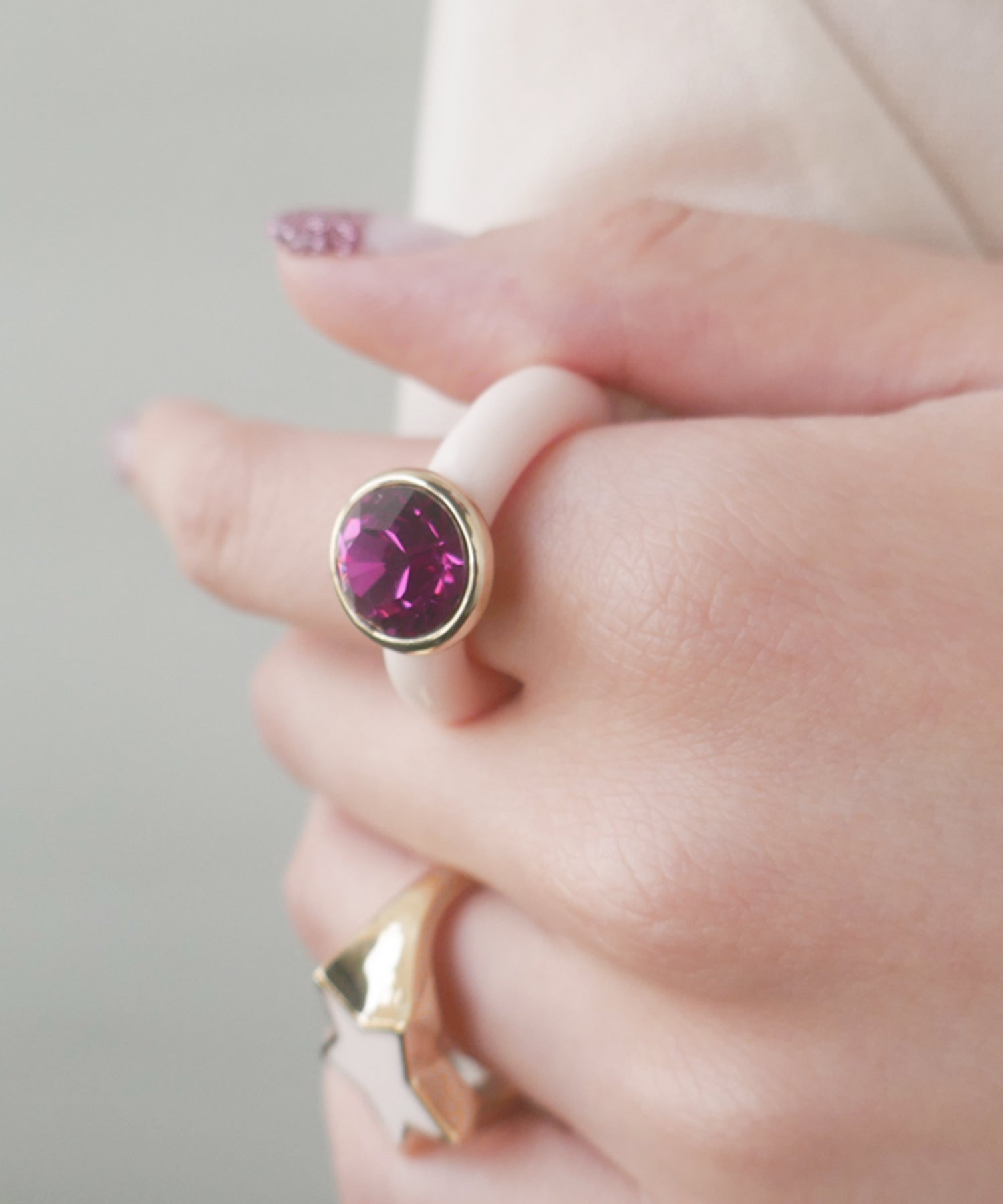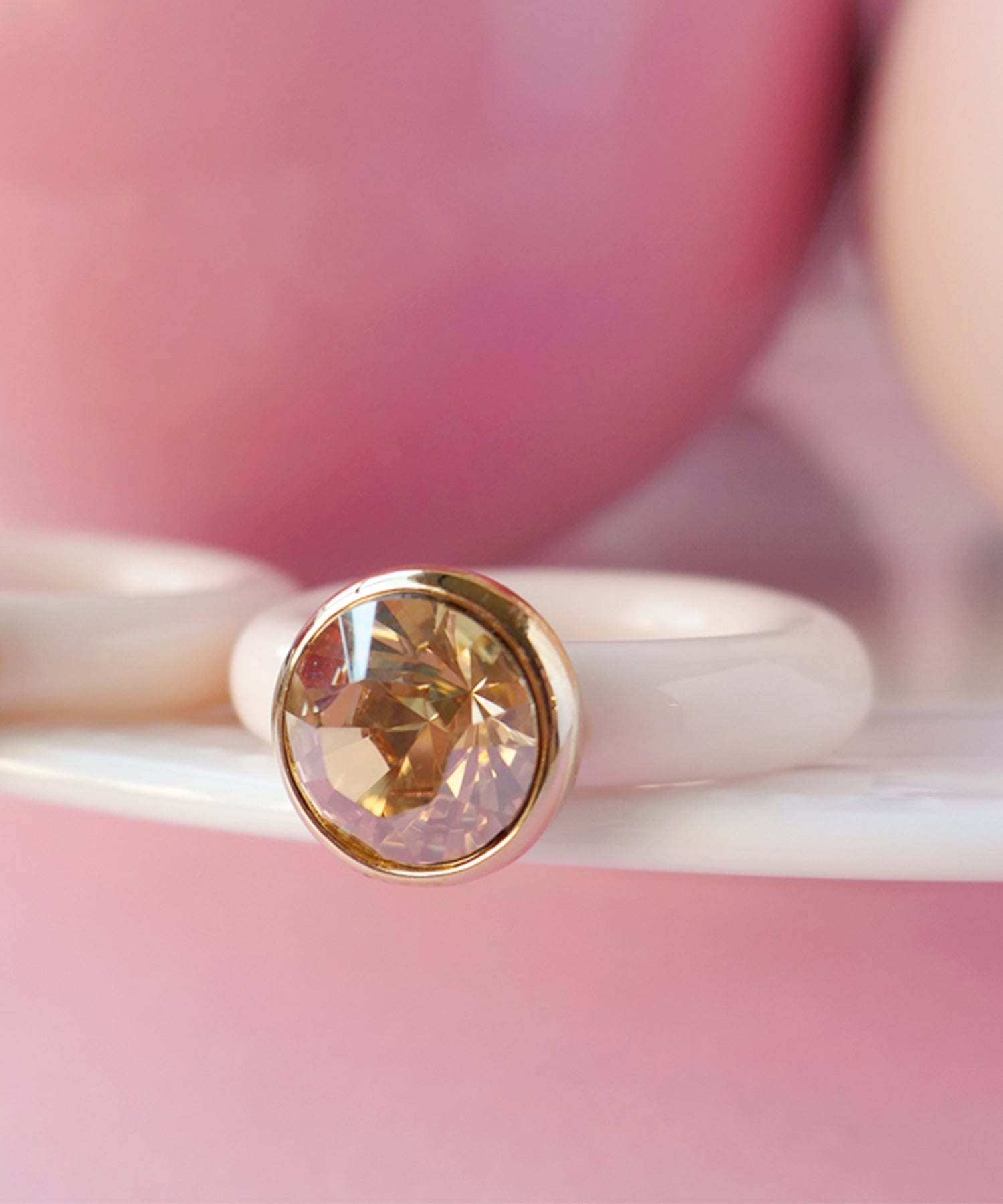 自然と視線が集まるウィットなアイディアが愛らしいリング。リングのアーム部分が丸いので