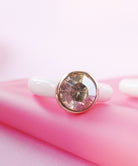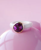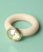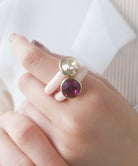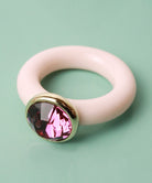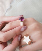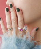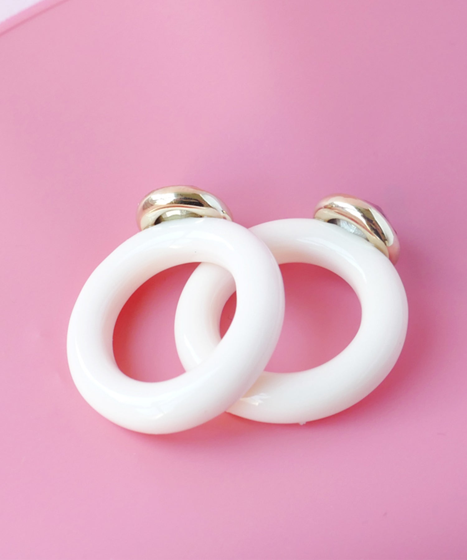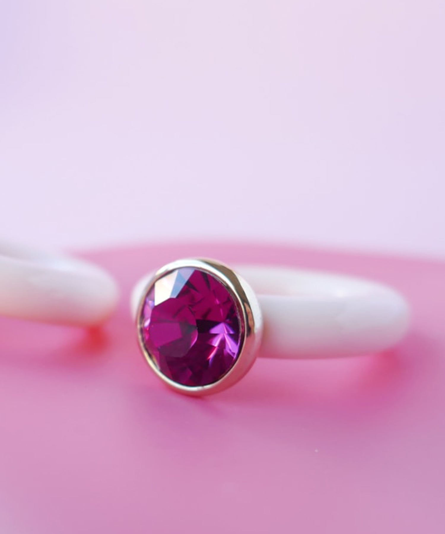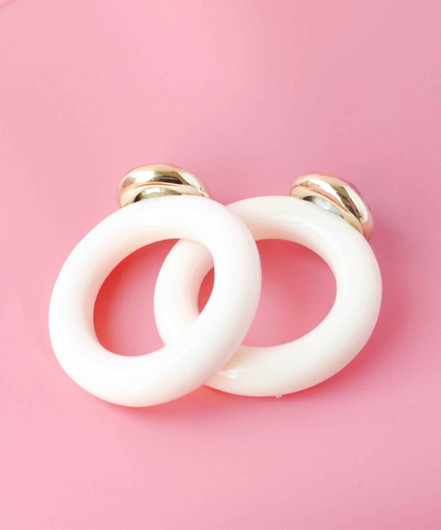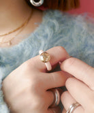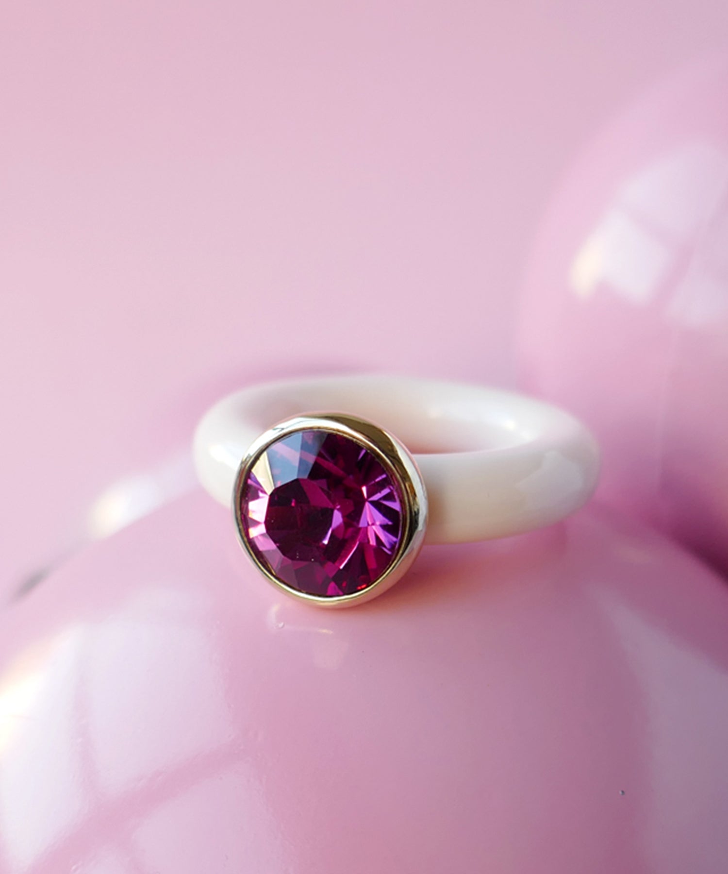自然と視線が集まるウィットなアイディアが愛らしいリング。リングのアーム部分が丸いので