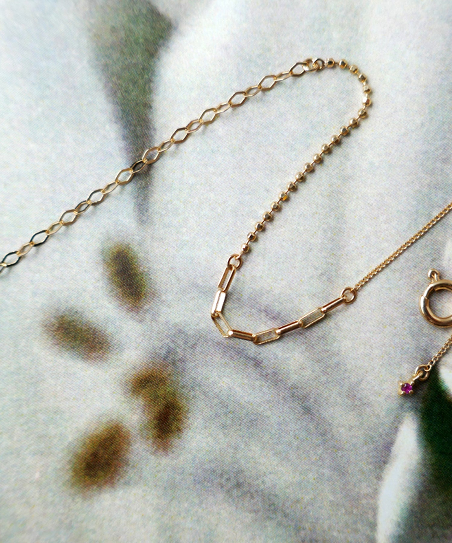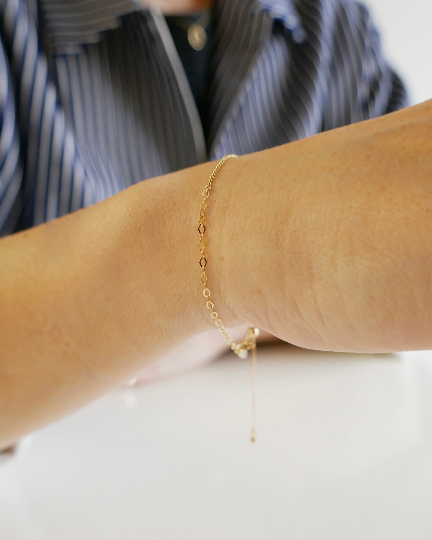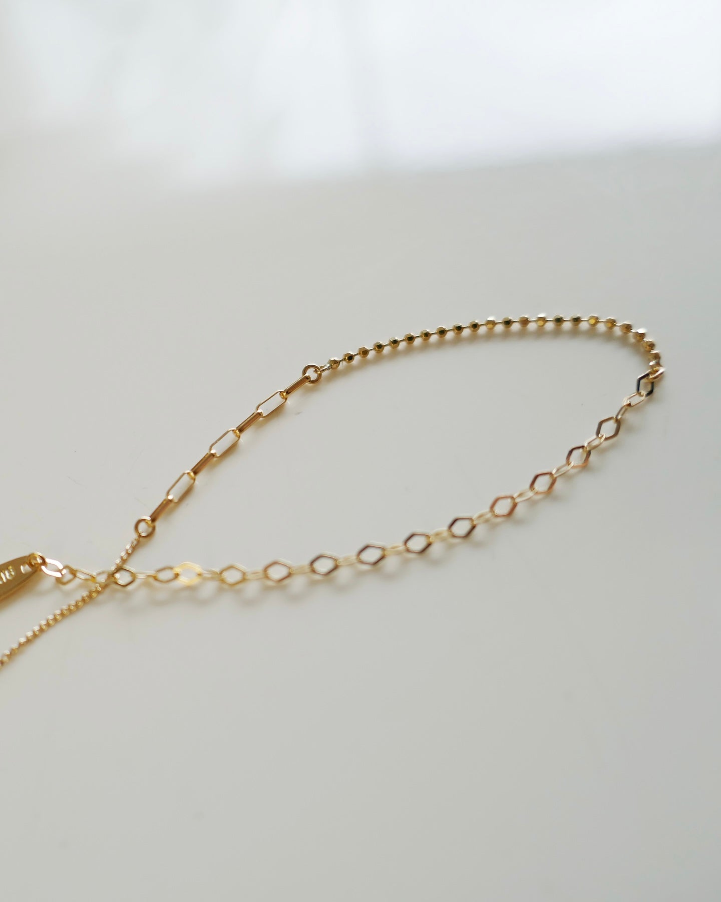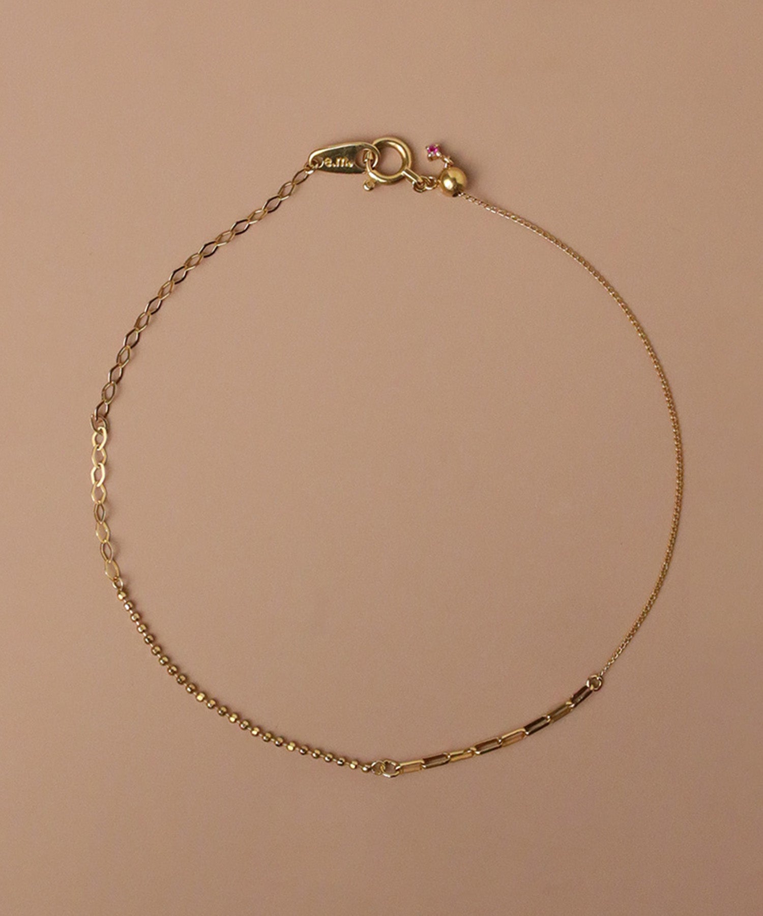 4種類のチェーンがミックスされたこだわりのブレスレット。見る角度によって雰囲気が変わるので着けるのが楽しくなるアイテムです。