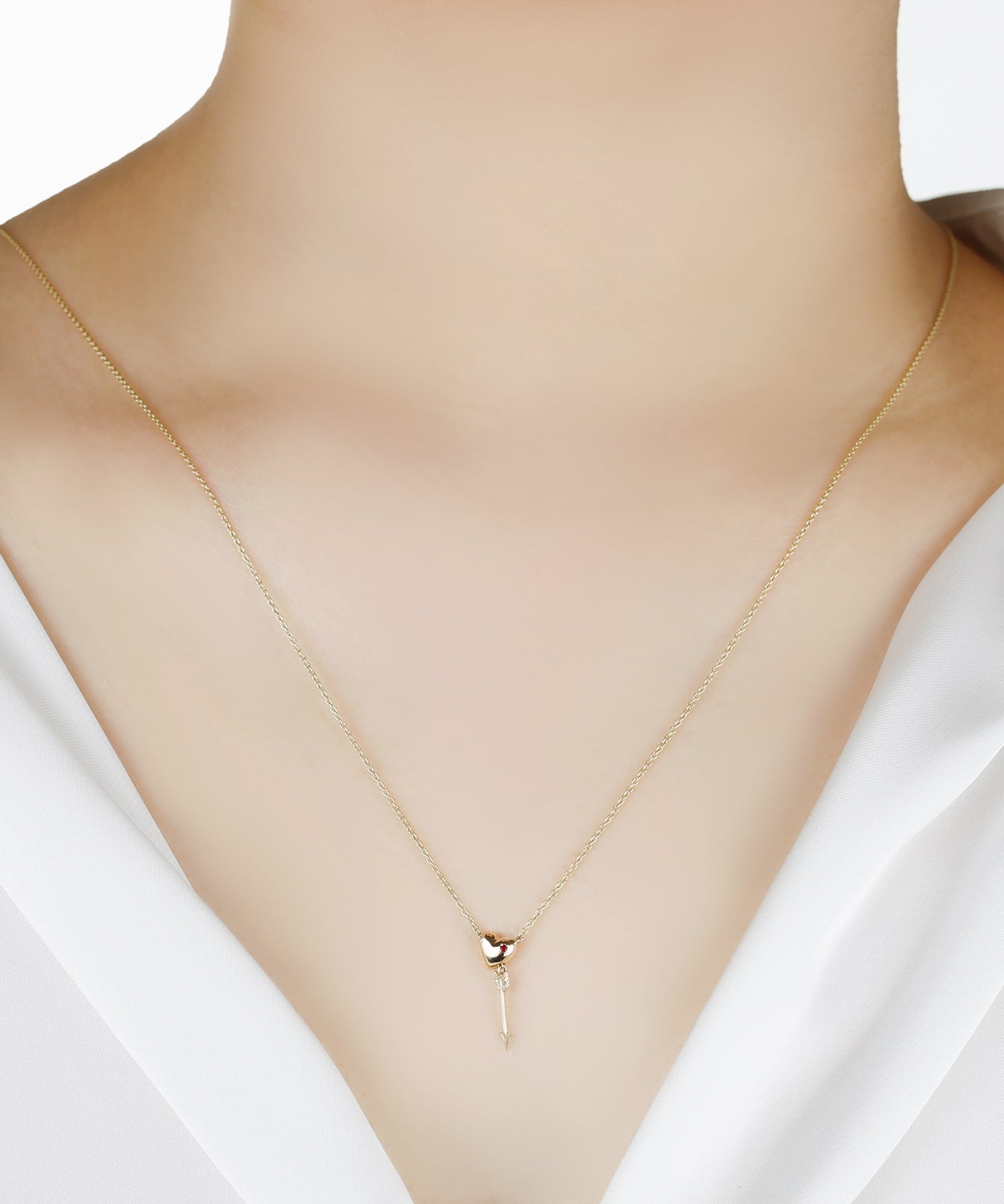 ハートを射抜くアローがチェーンの先で揺れるゴールドネックレス。