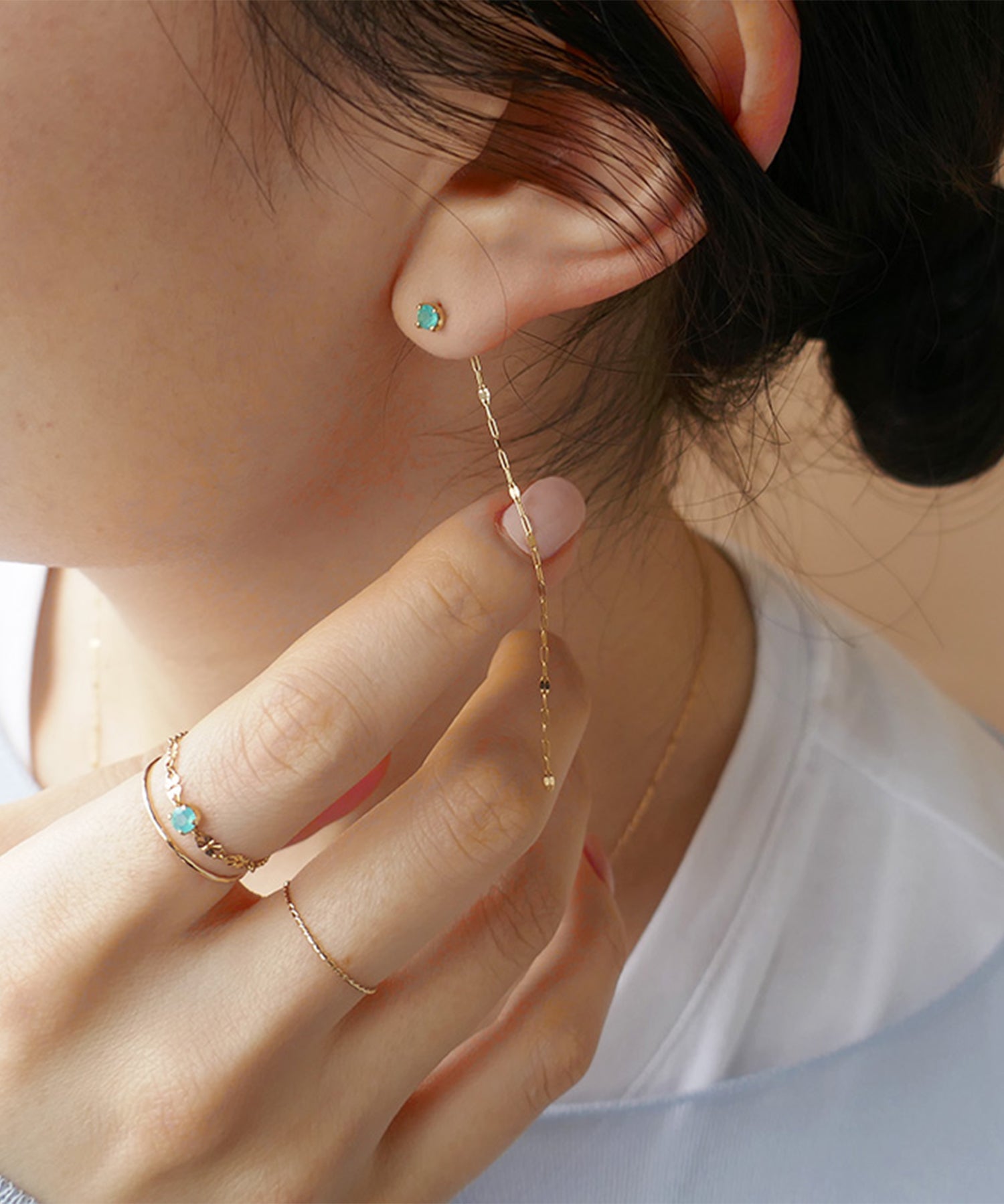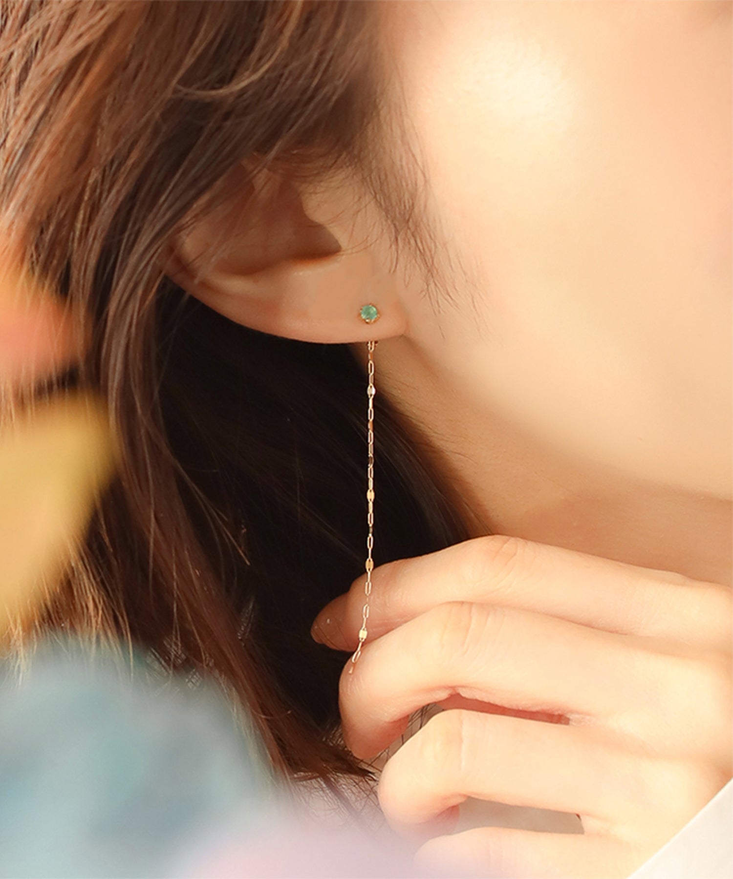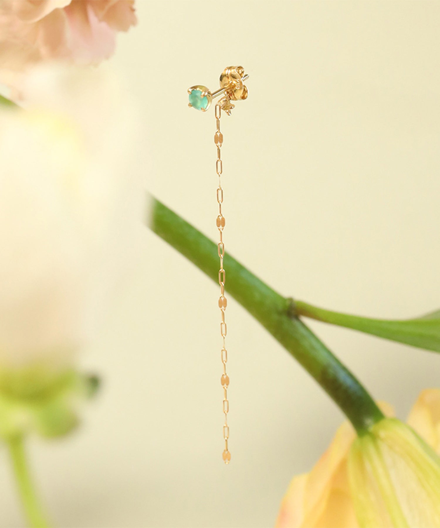 ブルーカルセドニーから揺れ動くロングチェーンが目を惹くゴールドピアス。チェーンは花びらのように光を受けて煌めくペタルチェーン。瑞々しいブルーカラーがノスタルジックで魅惑的な印象に。
