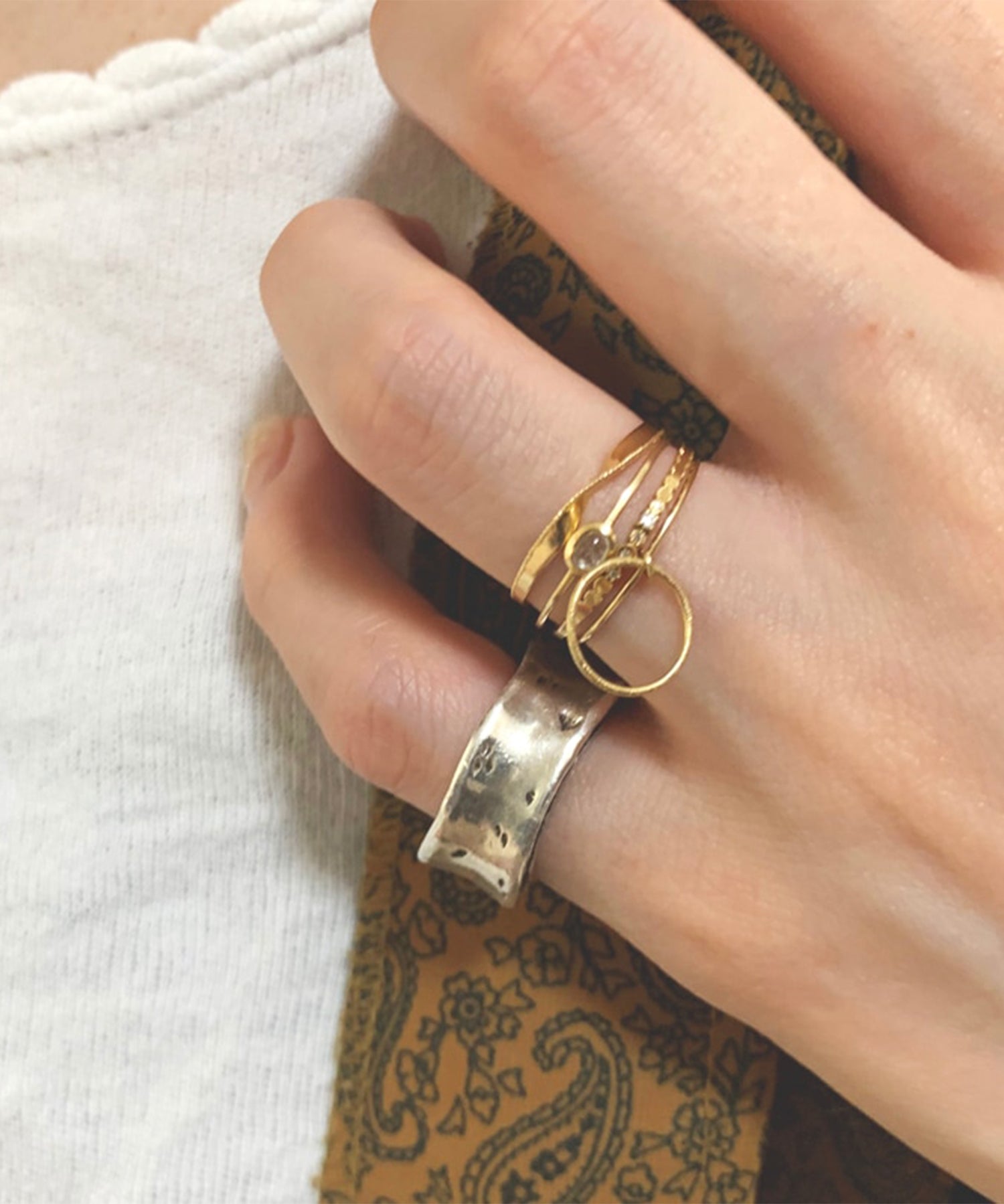 華奢なゴールドリングと重ね付けが