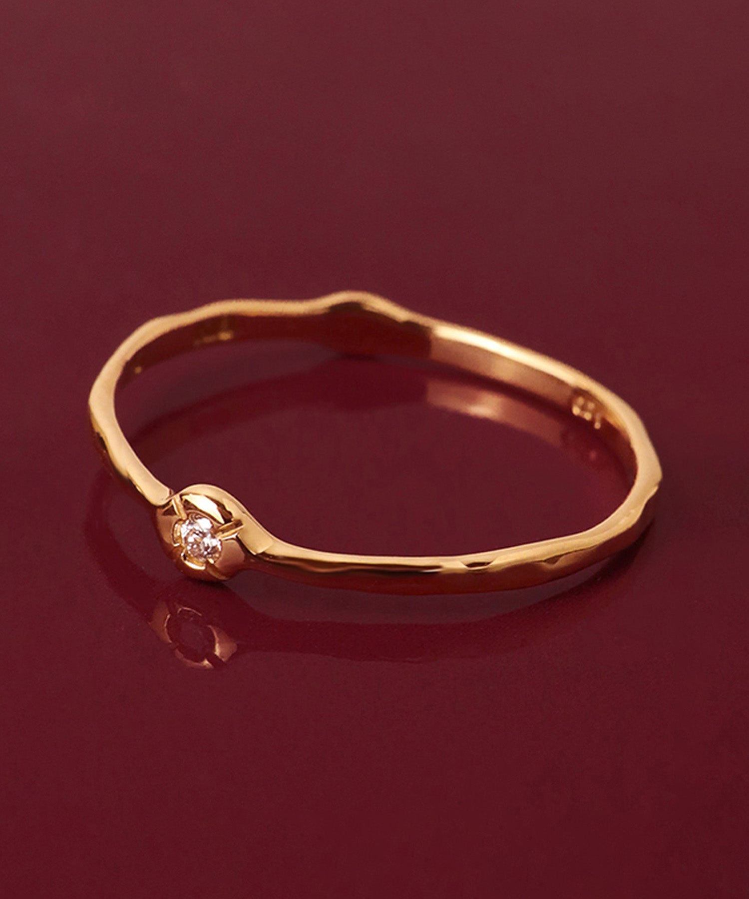 ダイヤモンドがセッティングされたゴールドリング。アームに叩き加工をほどこしたフラットなデザイン。