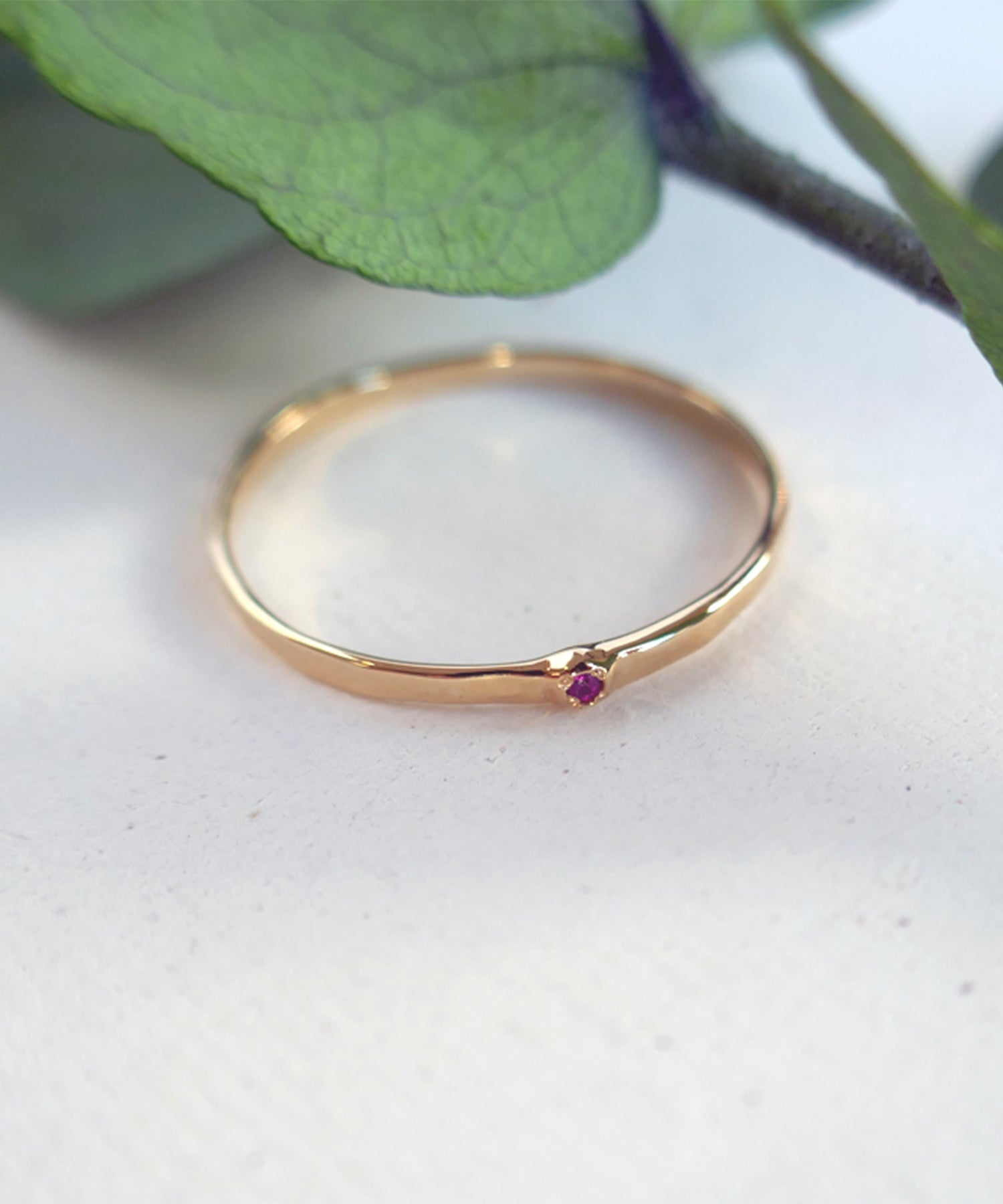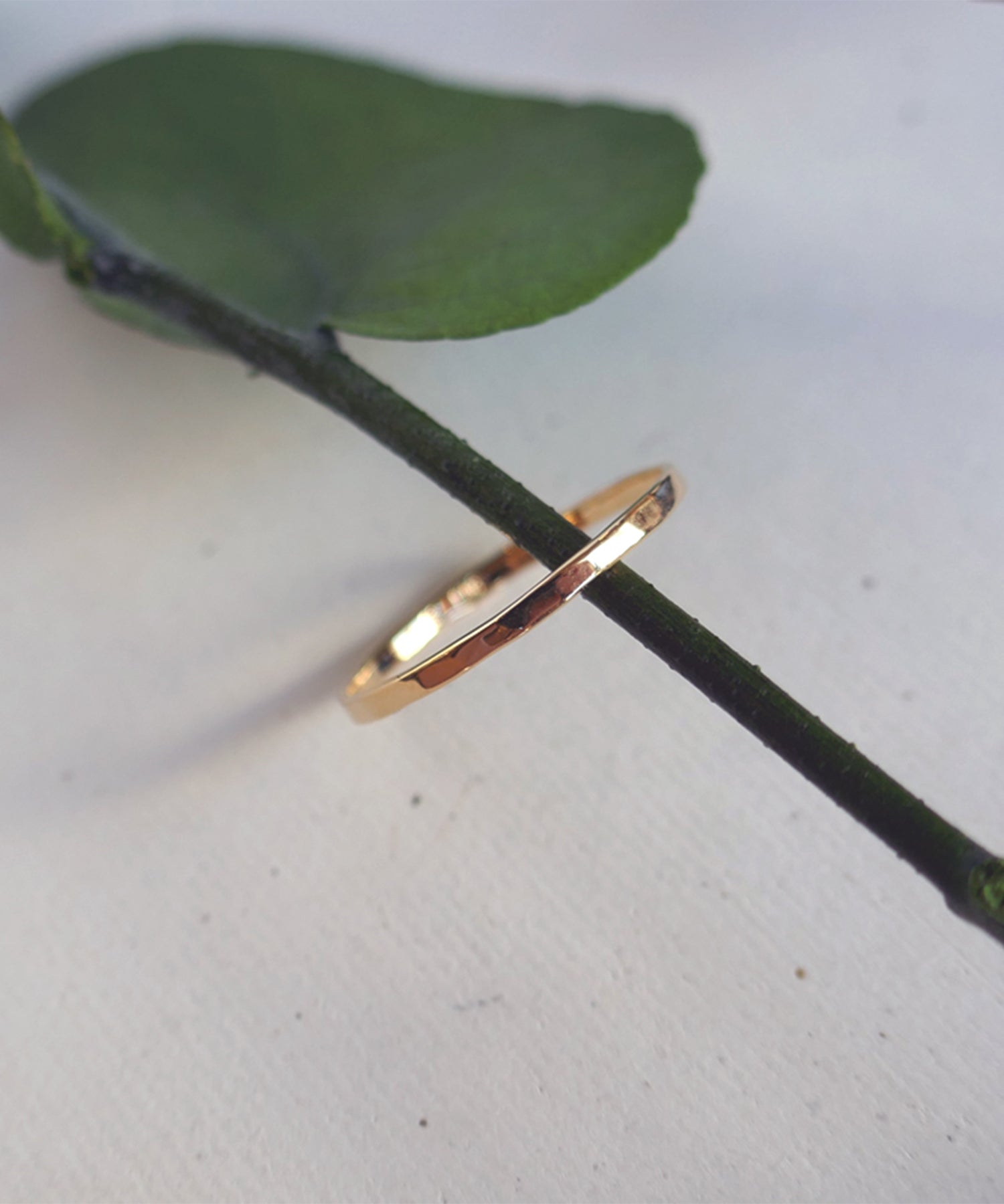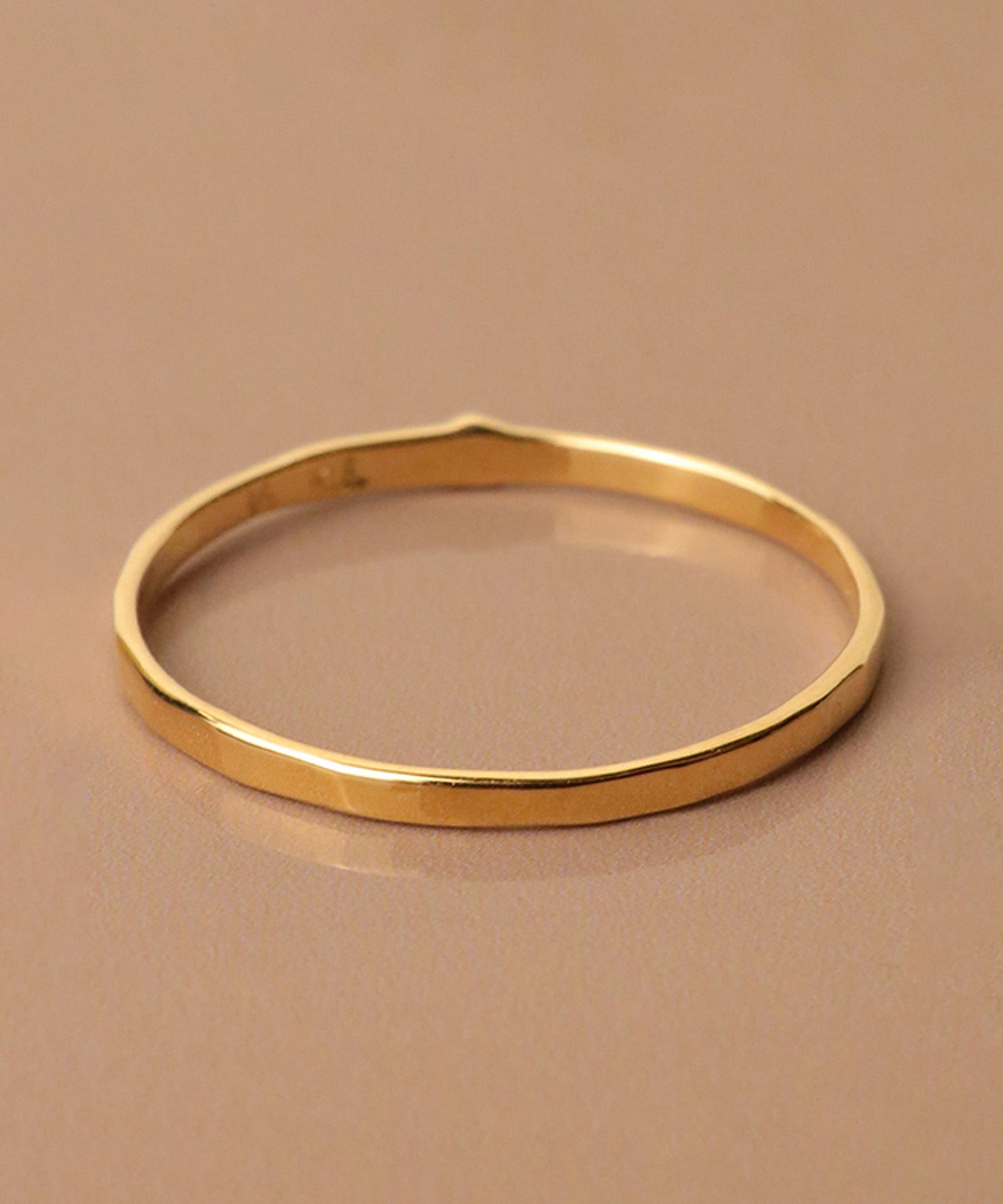 少しテクスチャーのあるシンプルなゴールドリング。カジュアルに着けられるデザインで