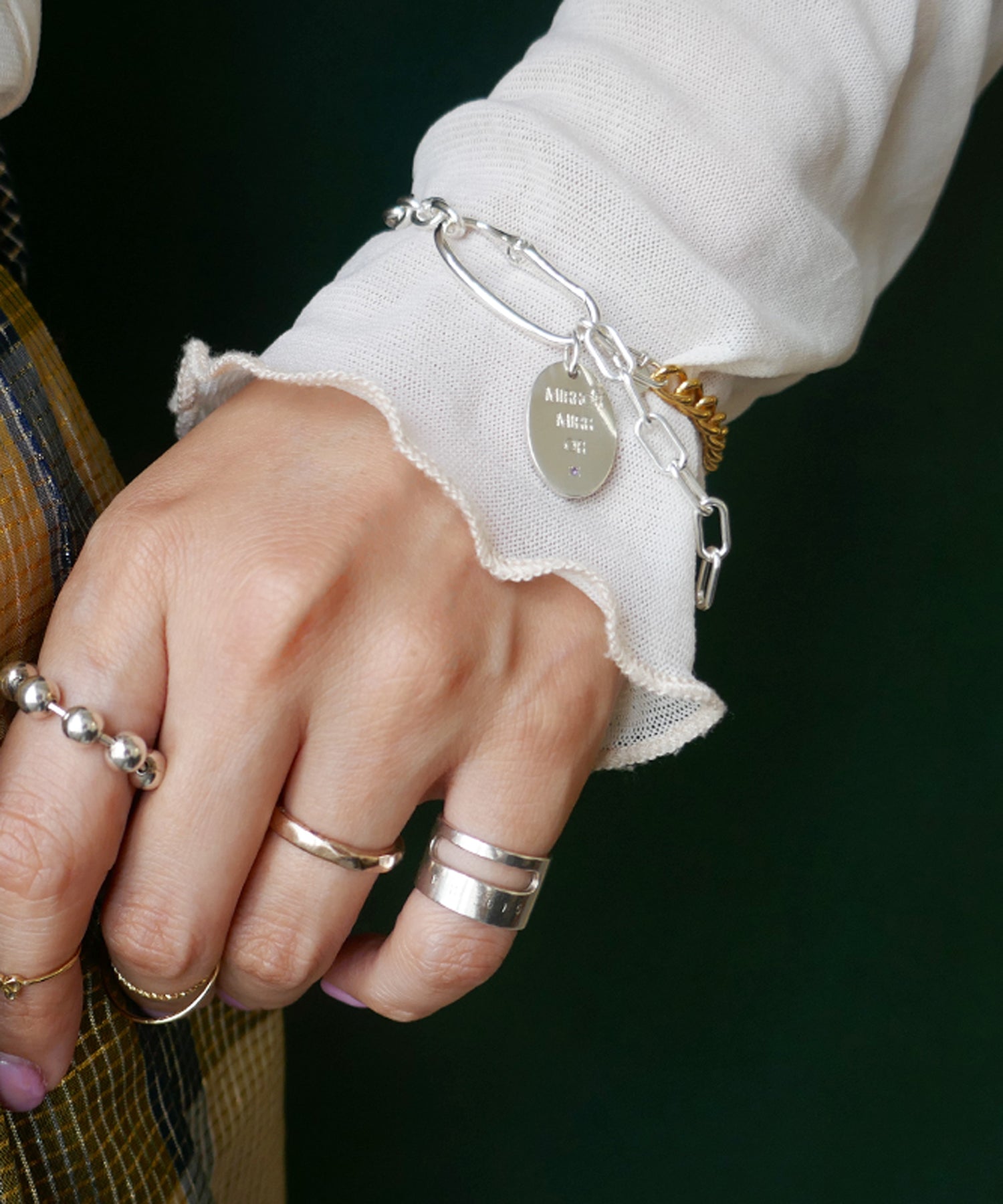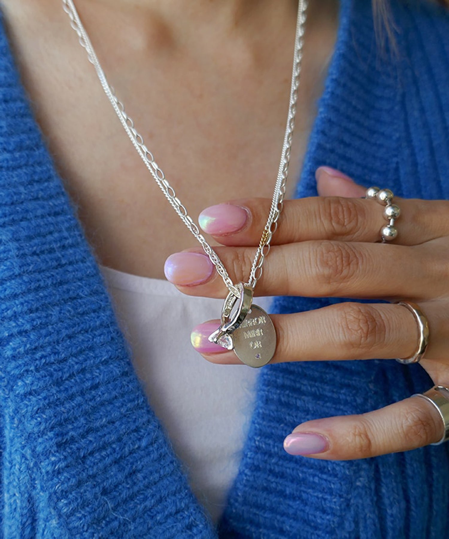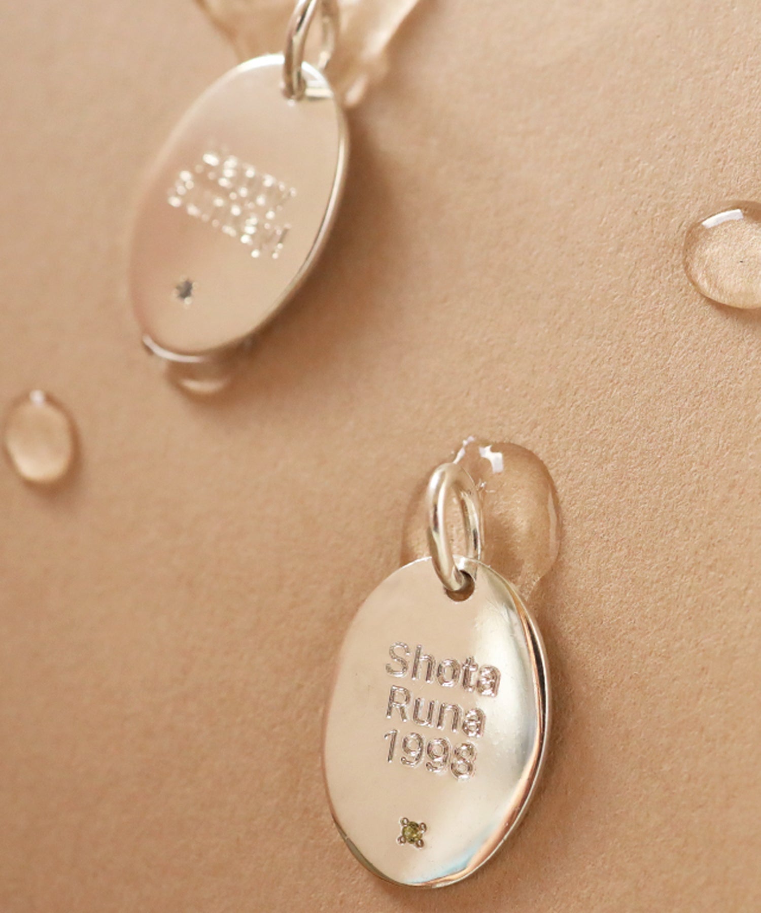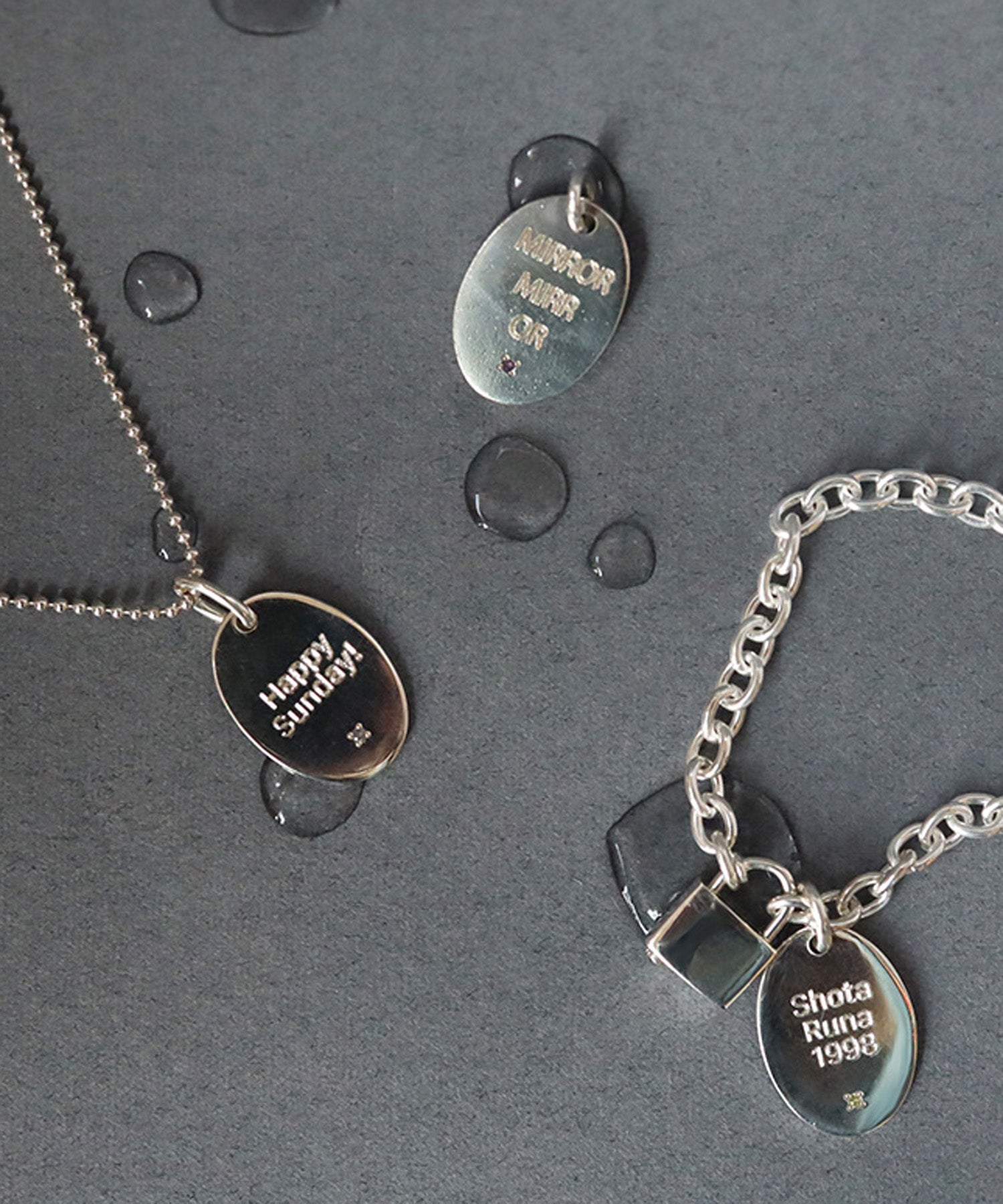 好きな言葉や、記念日、名前を刻んだ特別なペンダントチャーム。誕生石を一石、プレートに閉じ込めてデザインを楽しむこともできます。ネックレスやブレスレットに通して自分だけのジュエリーに。e.m.のベビーリングをチャームにして合わせるのもおすすめです。