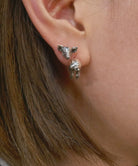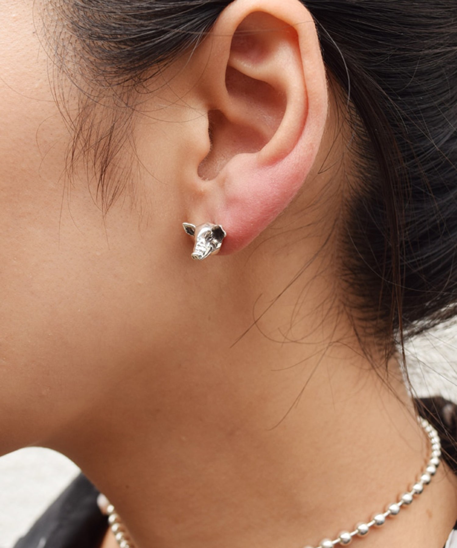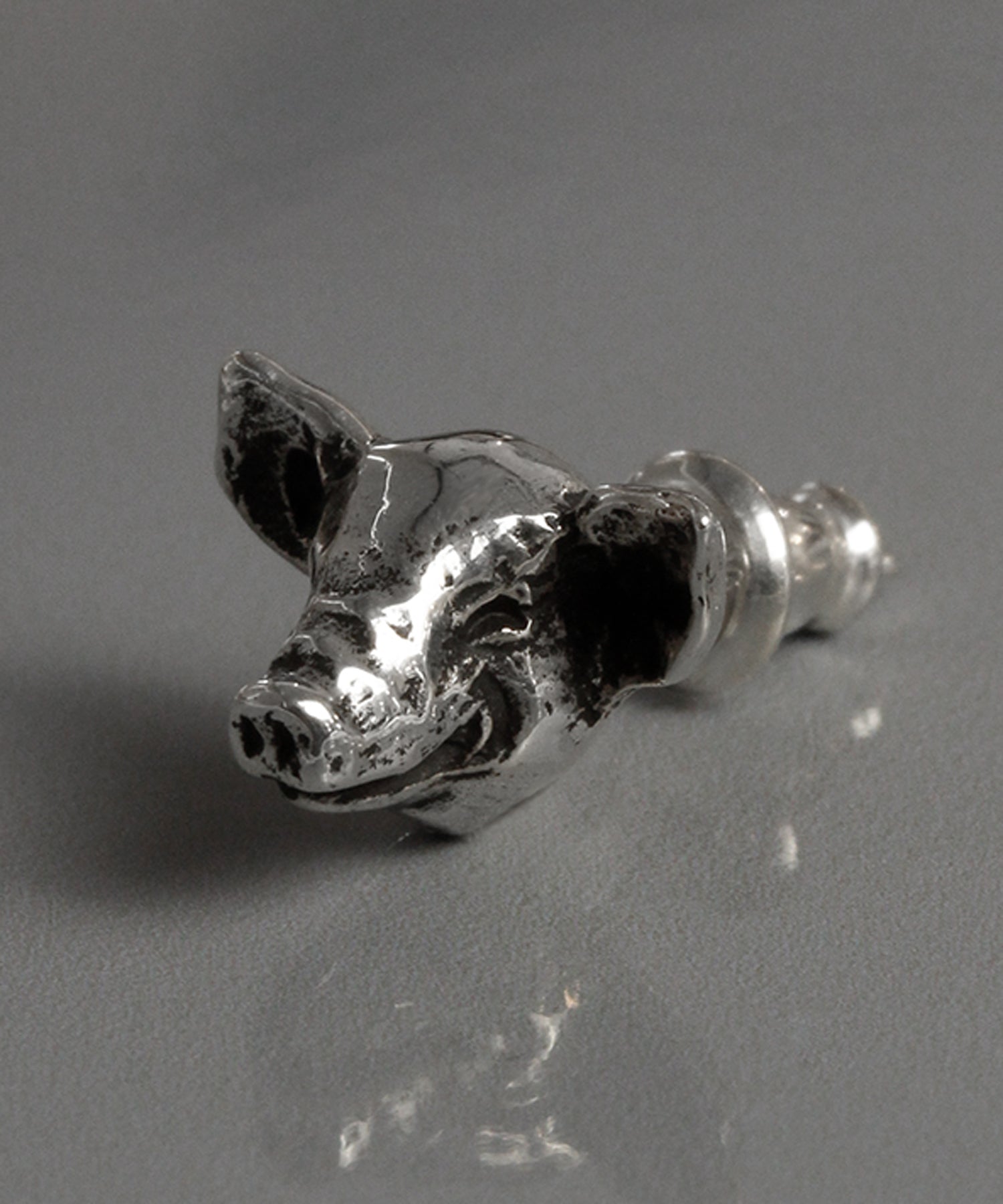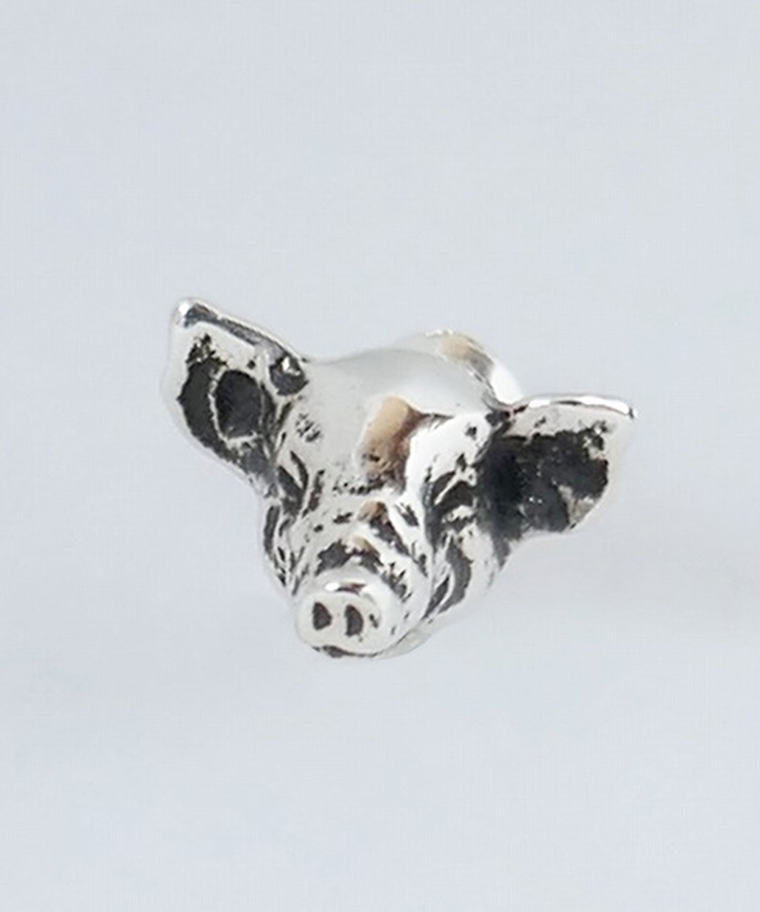昔からの定番、豚モチーフのピアス。少し微笑んだ愛らしい表情と